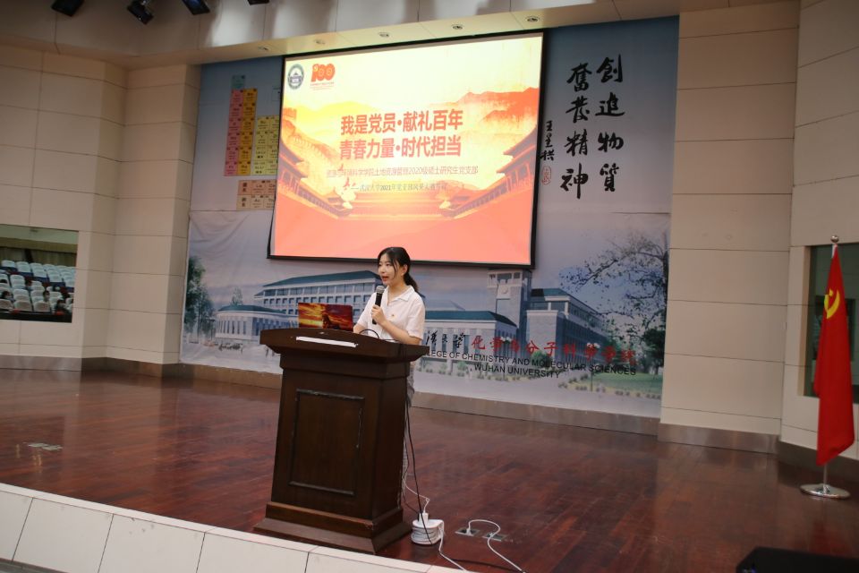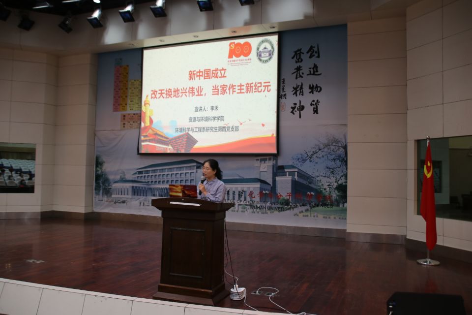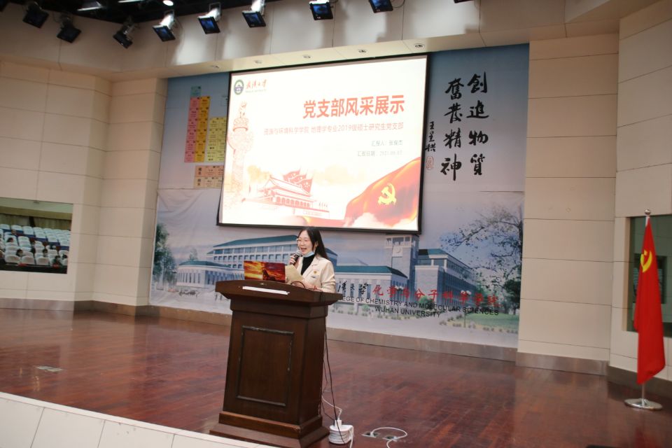 环境科学与工程系研究生第四党支部在风采展示环节介绍了“天天学党史、周周讲党史”的学习模式。微党课讲述了新中国成立的多重影响,以及武大师生在中国苦难辉煌的百年历史中与国家同呼吸、共命运的奋进历程。