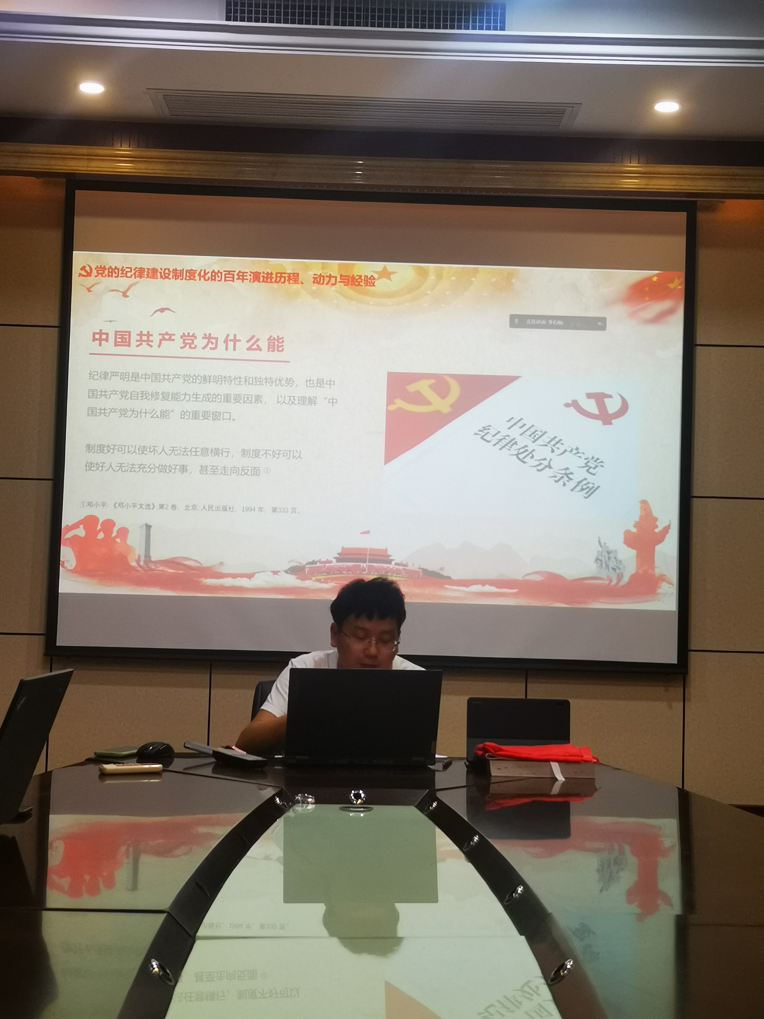 随后,李石标同志召开了本次主题党日的活动“党的纪律建设制度化的百年演进历程与经验”,从“中国共产党为什么能”的问题引入,阐述了纪律严明是中国共产党的鲜明特性和独特优势,然后介绍了中国共产党纪律建设制度化的四个阶段,梳理了不同时期下的党的纪律建设制度化的发展历程与挫折。最后,通过总结中国共产党纪律建设制度化的基本经验,为我们当今学习党史知识提供了启示与经验。