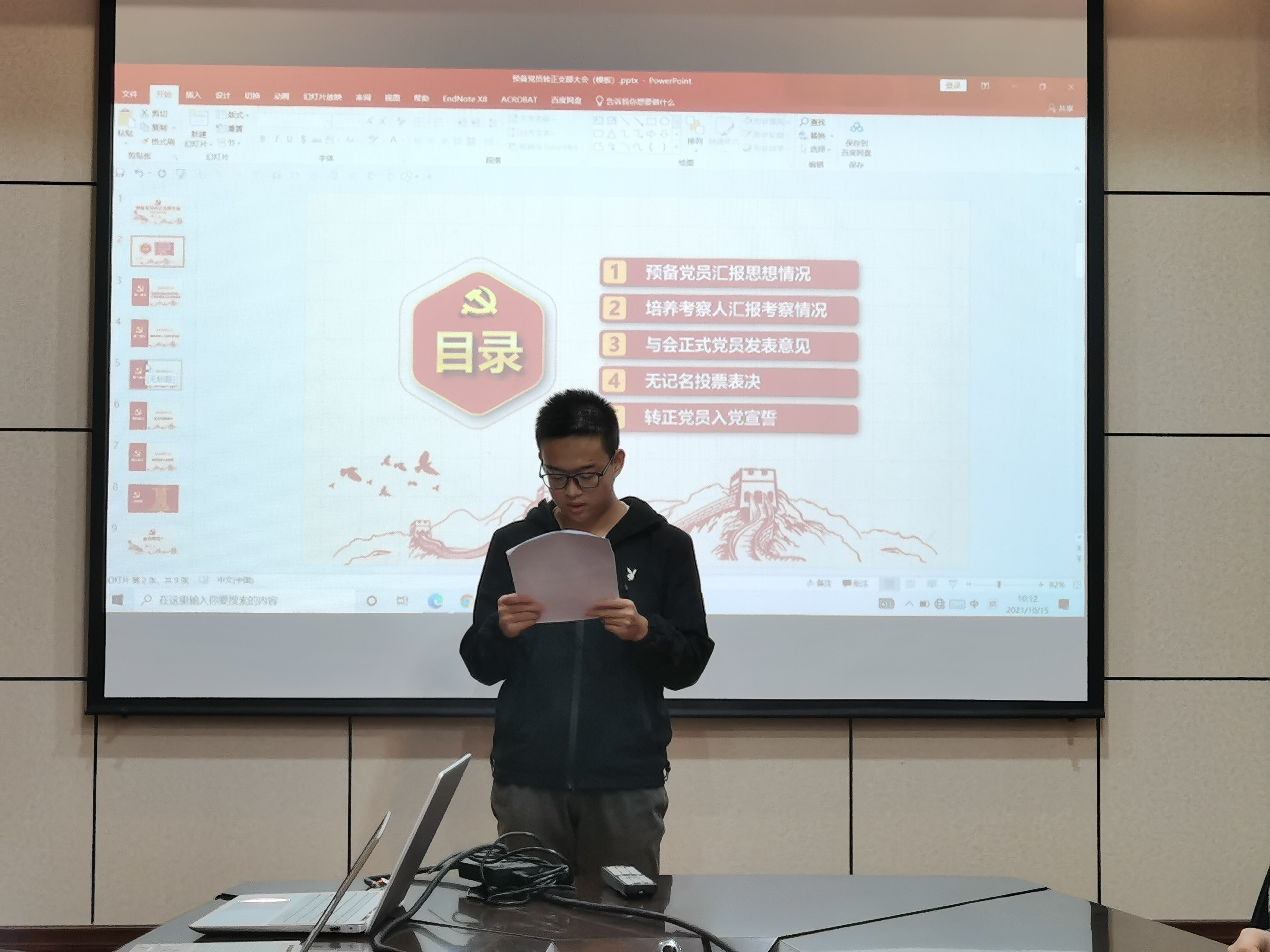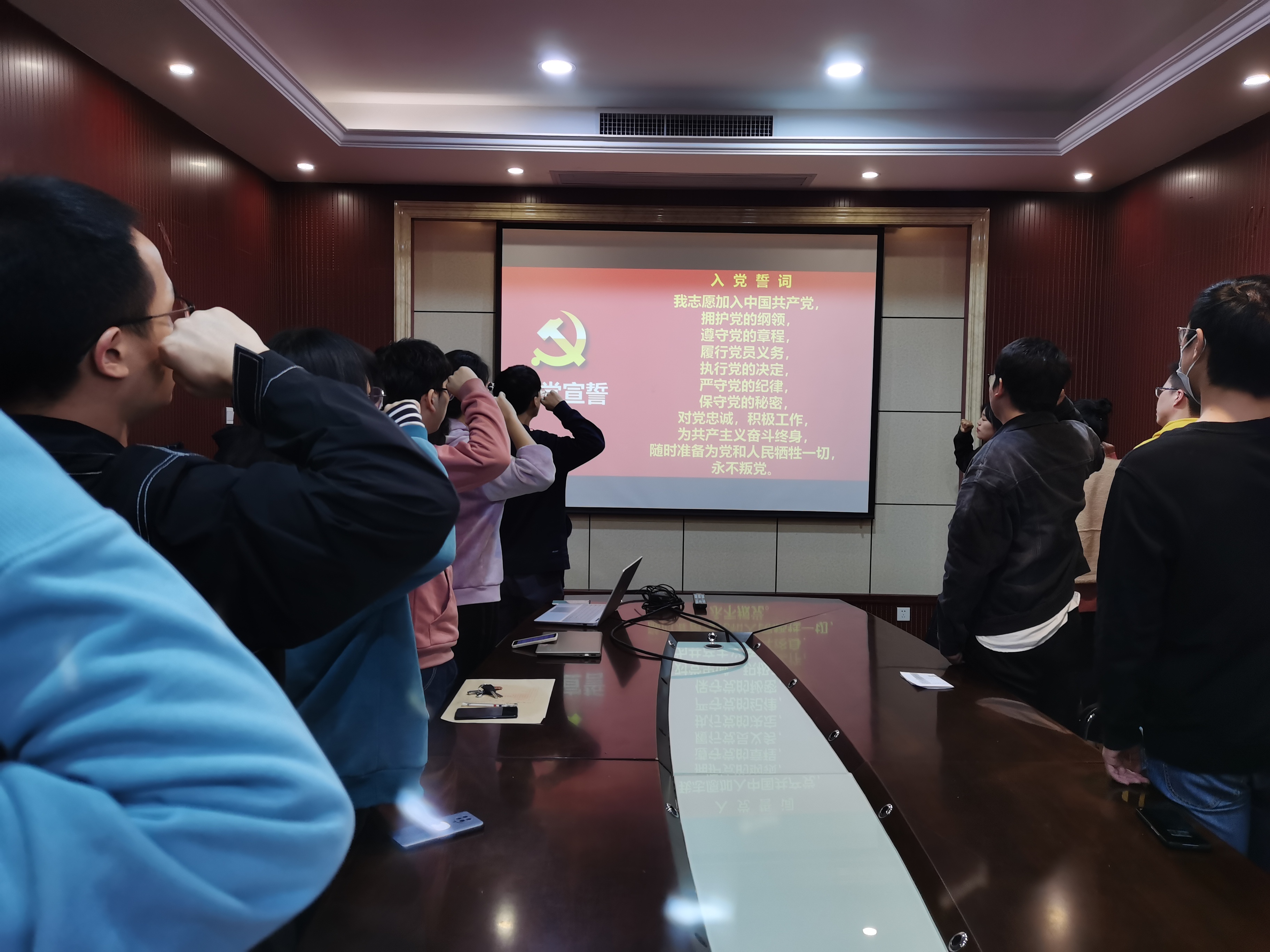 会议第二项,讨论预备党员金子健和徐云程同志的转正申请。首先,由预备党员金子健和徐云程同志向支部汇报思想情况,介绍预备期间思想上、学习上、生活上的表现并进行总结与反思。再由培养考察人汇报考察情况,与会正式党员发表意见,对两名同志给予肯定。随后由正式党员进行不记名投票,支部书记苏会钰宣读大会决议,金子健和徐云程同志全票通过成为中共正式党员。紧接着由支部书记苏会钰带领大家宣读了入党誓词。