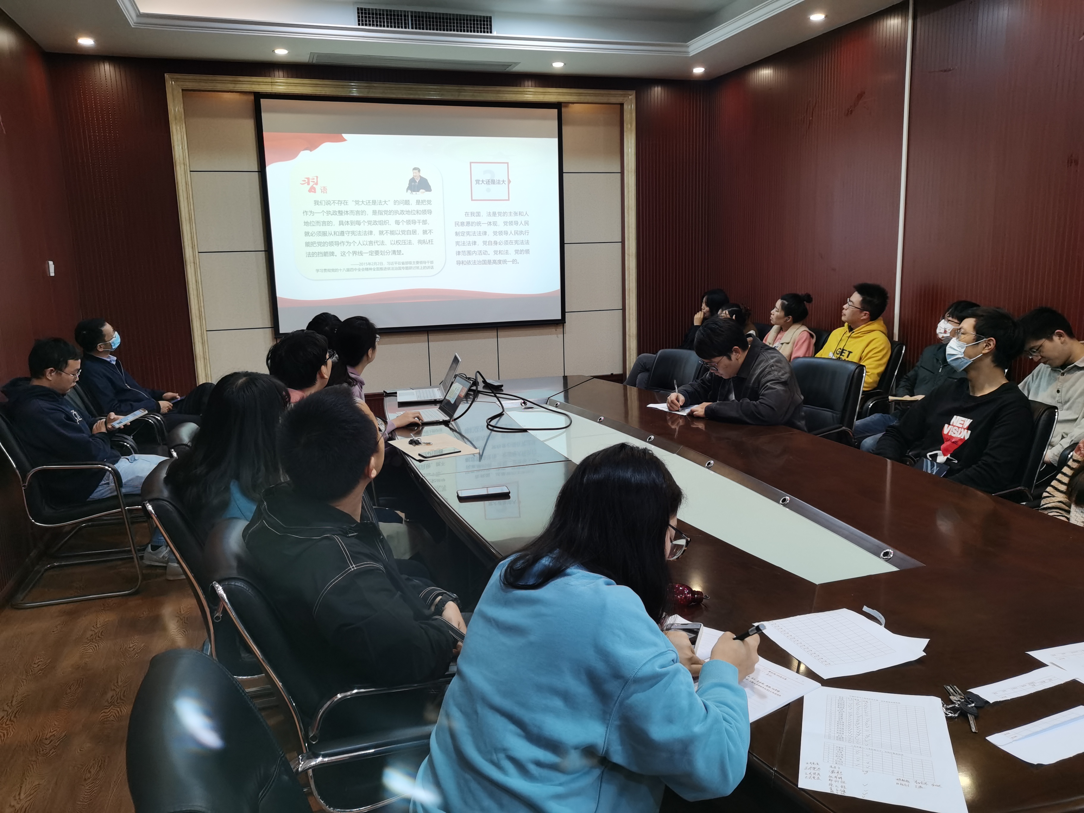 会议第一项,由党支部副书记刘方恬同志讲解“‘纪法同行’集中学习活动,加快建设社会主义法治国家”专题党课,支部同志们学习《中国共产党纪律处分条例》、《中华人民共和国监察法》、《中华人民共和国公职人员政务处分法》等党内法规和国家法律法规,积极讨论刘方恬同志提出的相关思考问题。