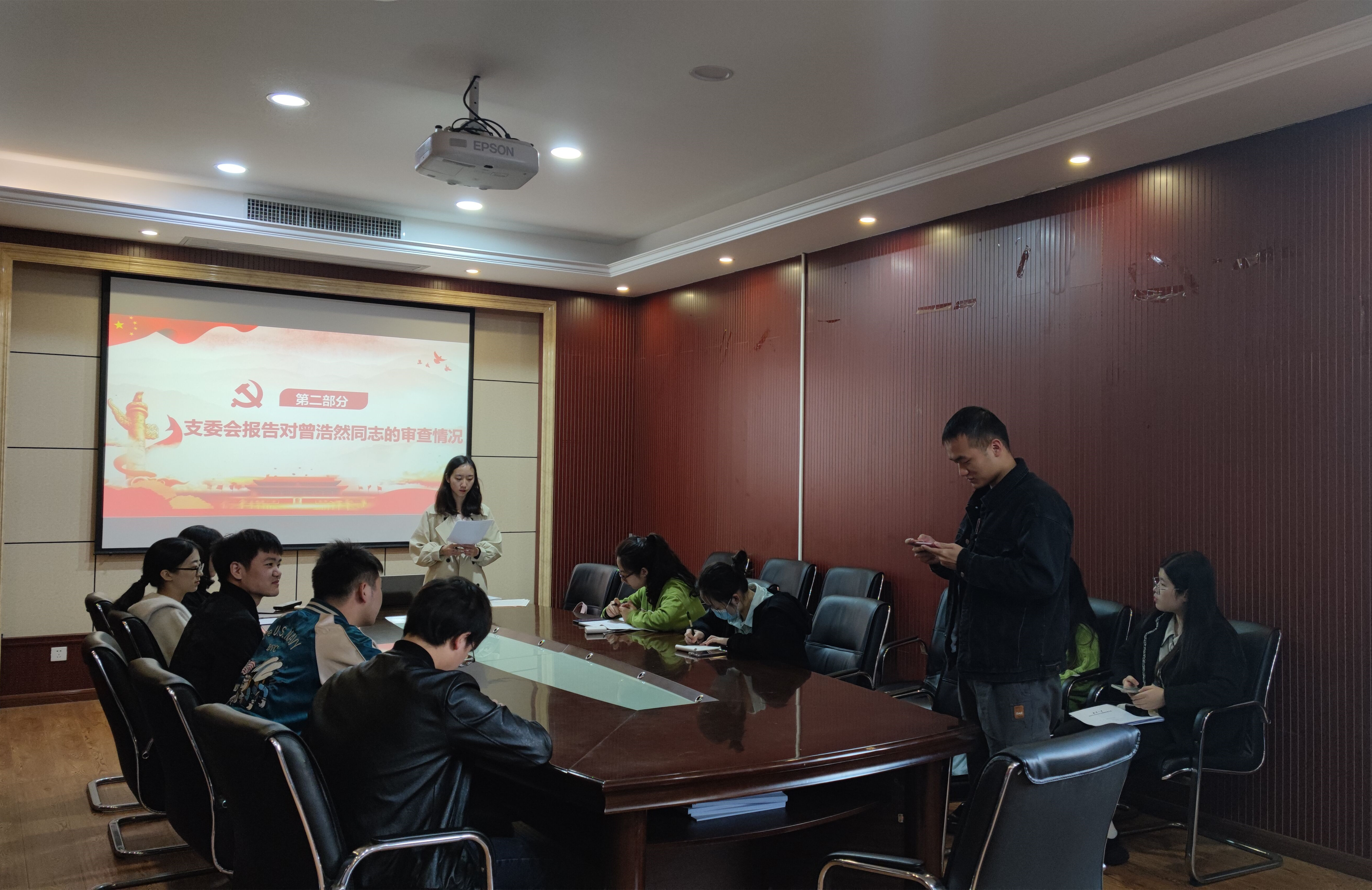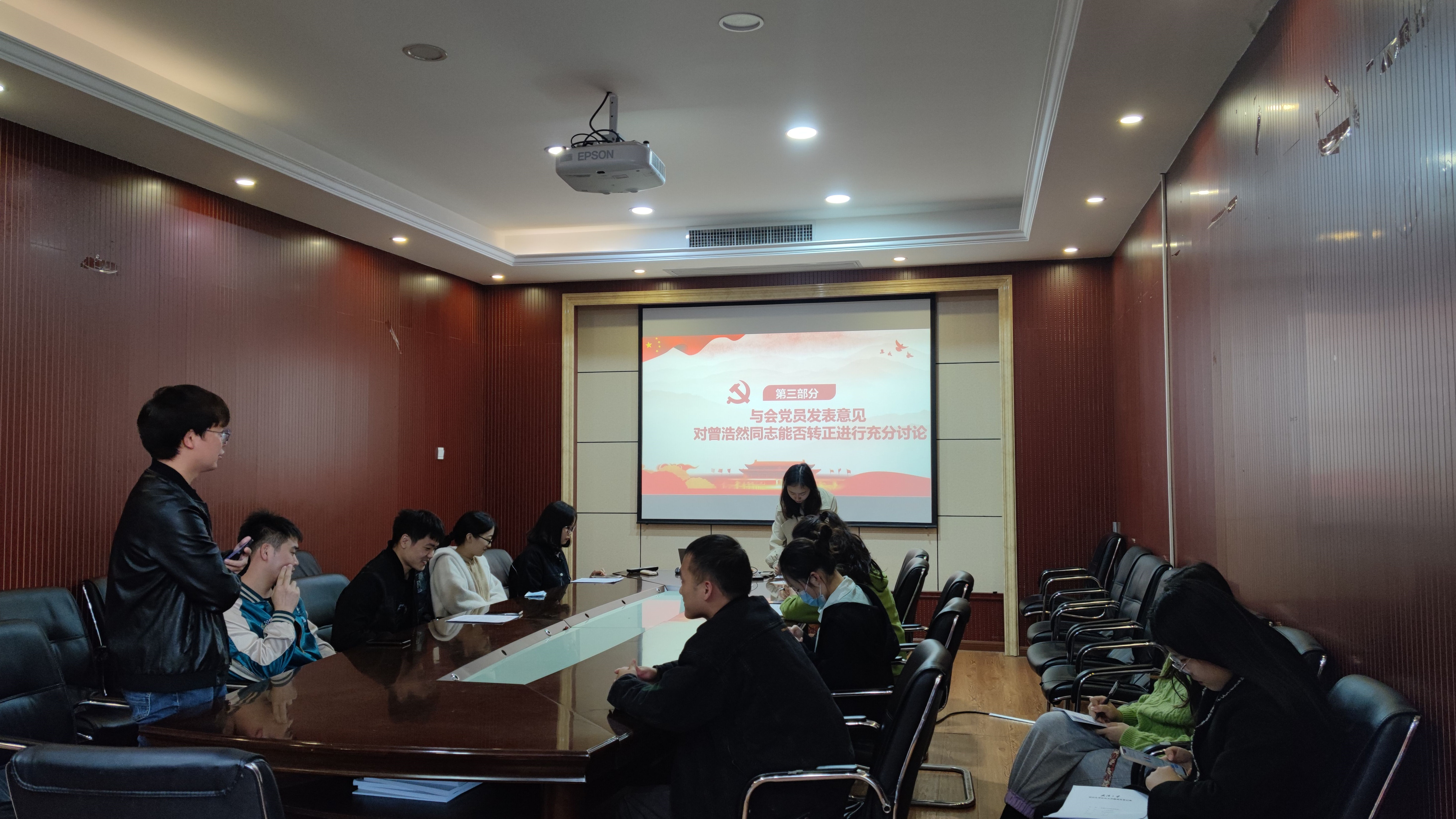 会议第一项,讨论曾浩然同志的转正工作。首先由曾浩然同志汇报其在预备期间思想、学习、生活、工作上的表现并提出转正申请;接着,支委会代表李启源同志向支部大会报告了对曾浩然同志的政治审查、征求党员和群众意见等情况;经与会党员充分发表意见与不记名投票,书记罗明霞同志宣布曾浩然同志全票通过成为中共正式党员。最后,曾浩然同志做出了表态,向党组织表达了自身的想法与加入中国共产党的决心。