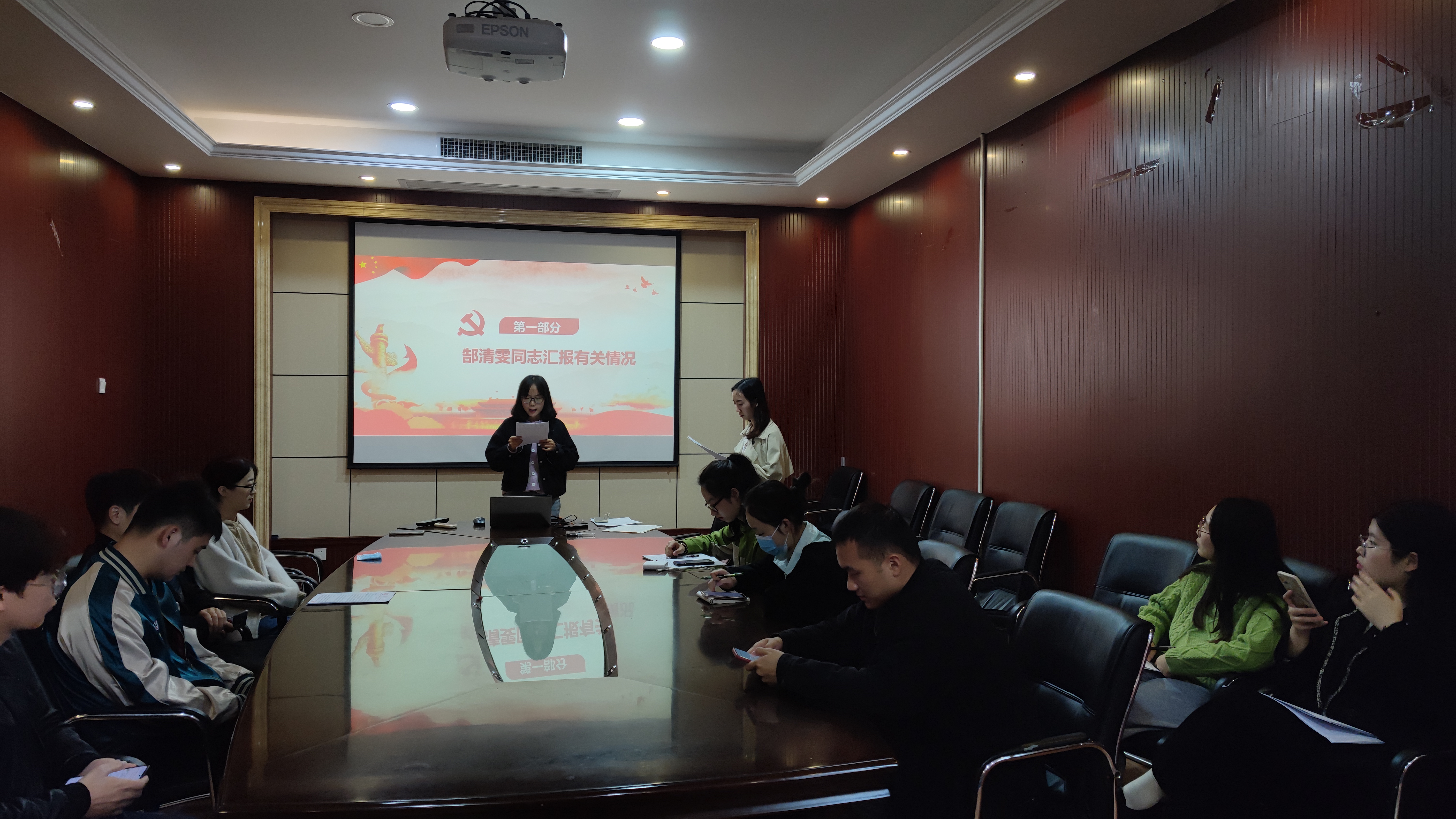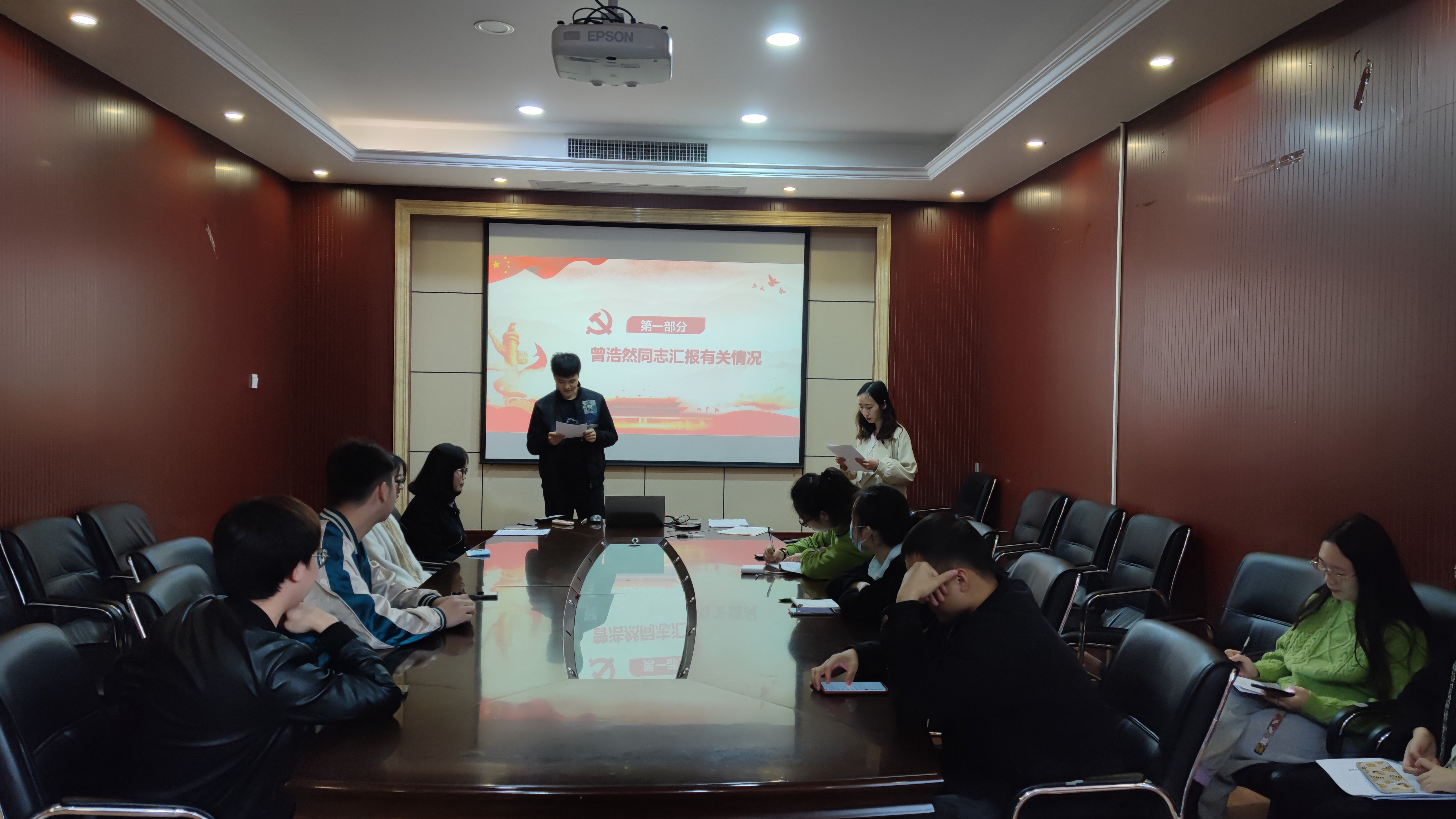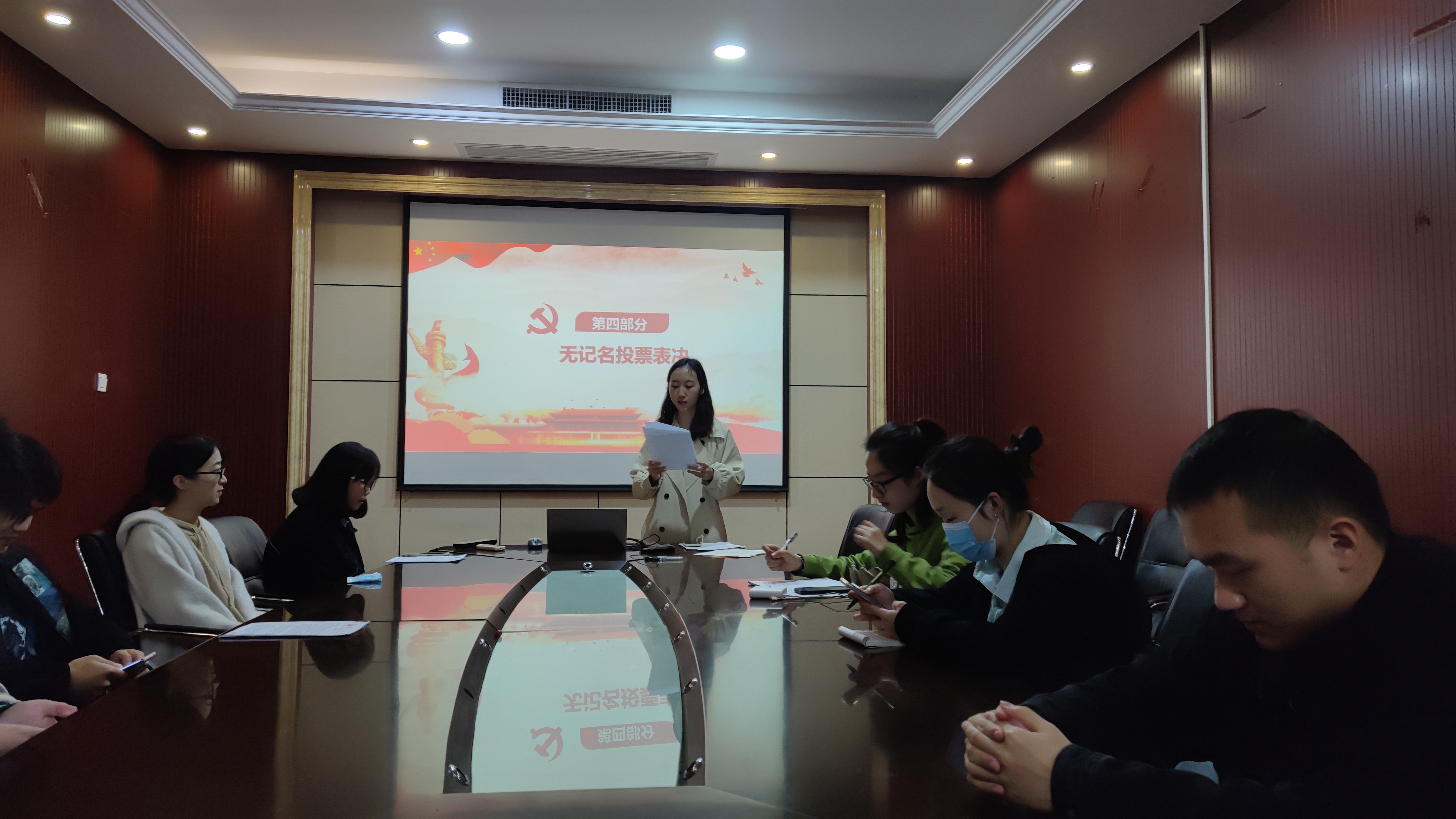 504会议室召开了支部大会。本次会议由支部书记罗明霞同志主持,主要内容包括曾浩然、武悦、郜清雯三位同志的预备党员转正讨论以及主题党日活动的召开。