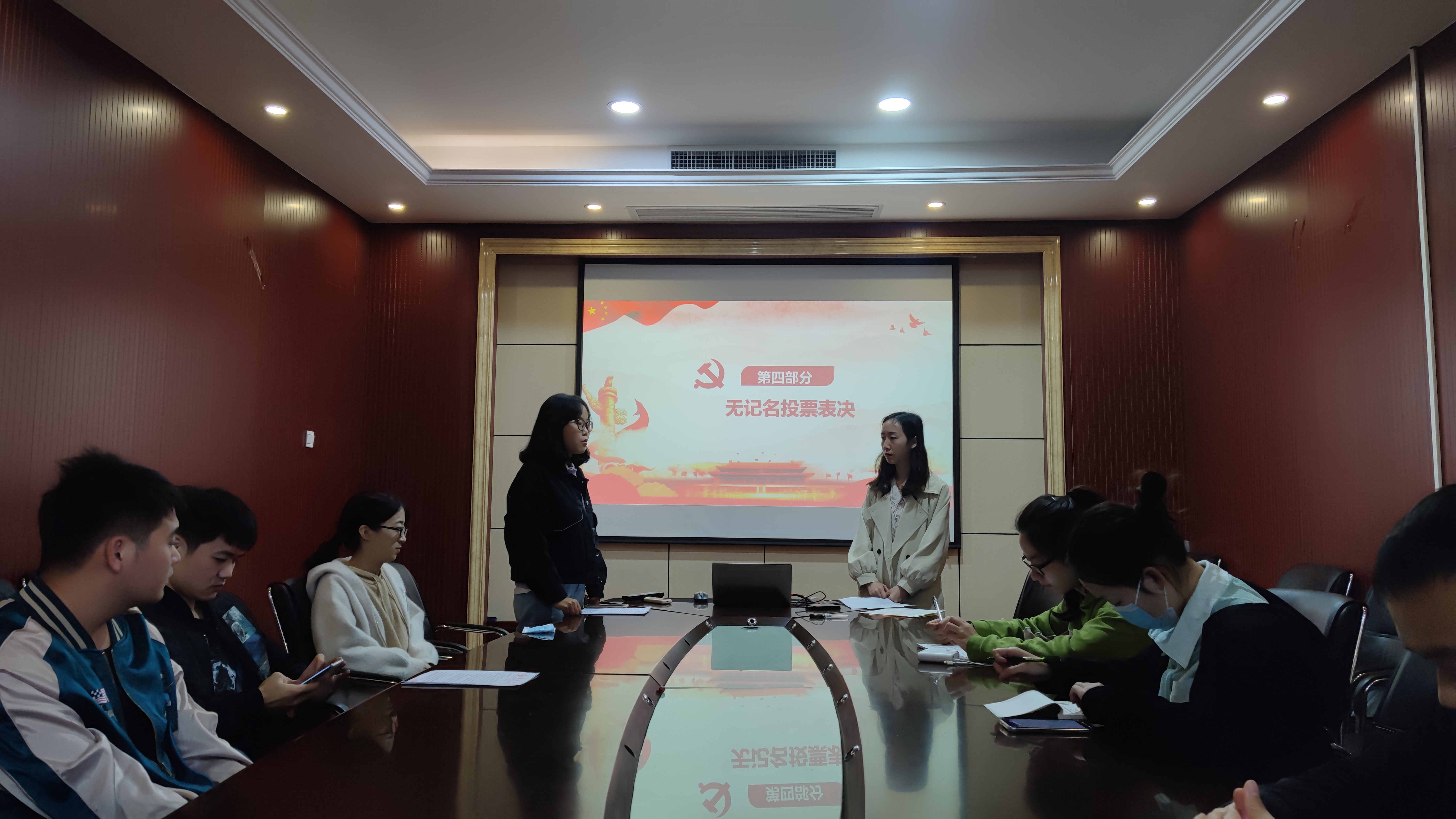 会议第三项,讨论郜清雯同志的转正工作。首先郜清雯同志就自己这一年的学习、工作、生活等情况做出了详细的汇报;支委会代表谢璐励同志向支部大会报告了武悦同志在社会关系、政治审查等方面情况,表示郜清雯同志符合转正条件;经与会党员充分交换意见与无记名投票,最终宣布决议,郜清雯同志全票通过成为中共正式党员。最后,郜清雯同志进行了表态,向党组织表达了自己的信心以及未来努力的方向。
