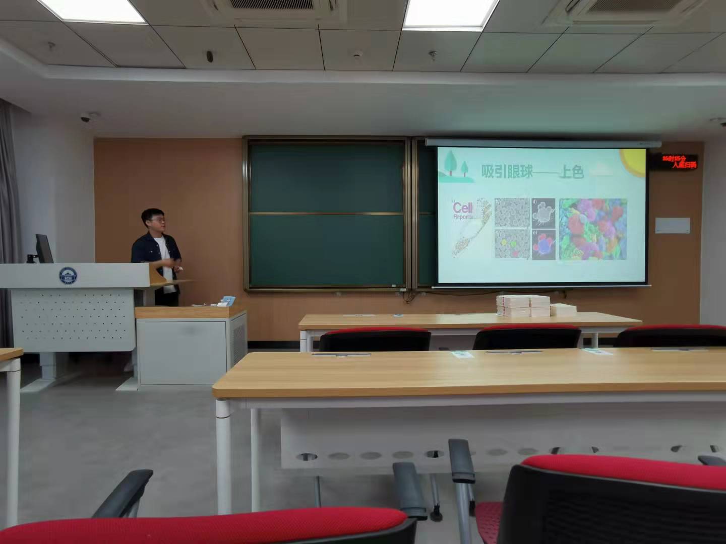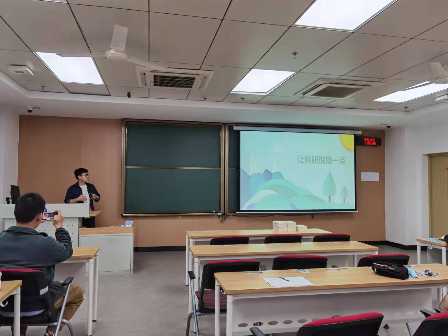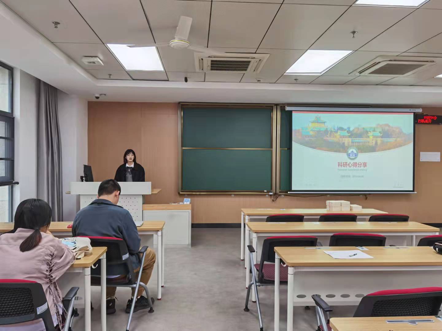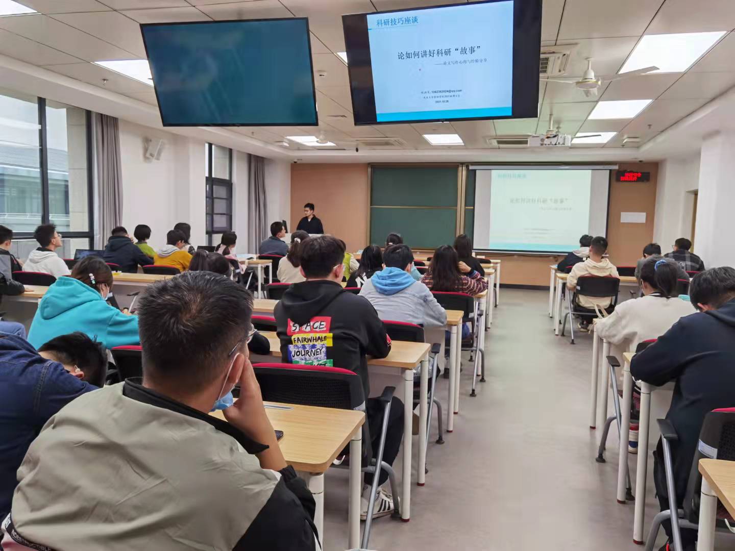 紧接着是由研究生第五党支部的胡丹同志带来自己的科研心得分享,主要是讲述自己从初进实验室到实验装置搭建再到论文写作的整个流程分享,为才进入研究生生活的党员同志们搭建一个研究生学习生活的整体框架。分享主要是从科研前期工作、进行科研实验以及科研论文写作三个方面展开,粗中有细,面面俱到。