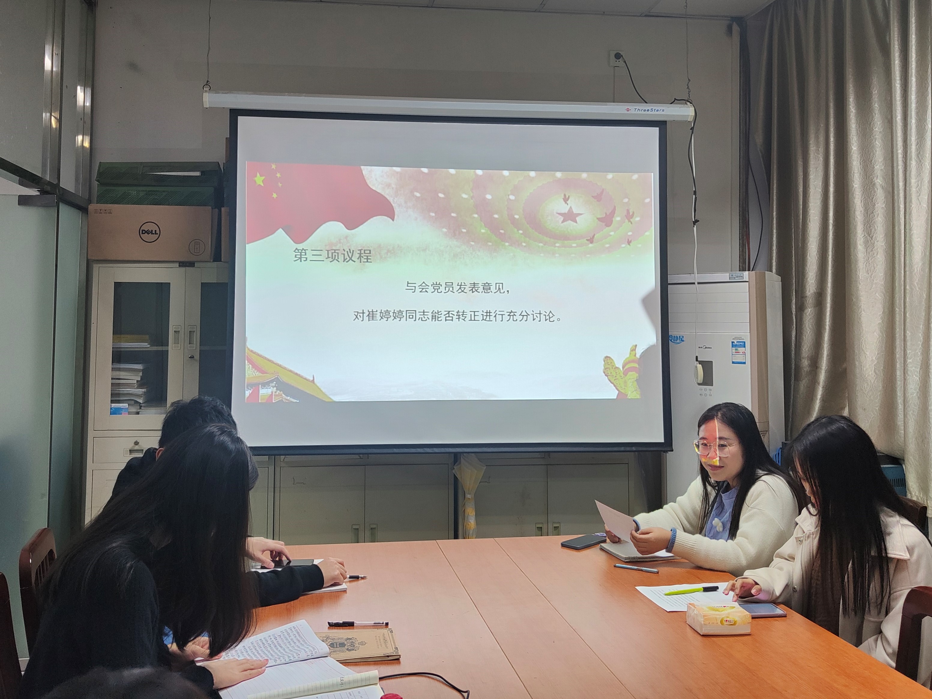 会议第二项,组织委员周亚娟同志代表支部委员会介绍崔婷婷同志预备期间的教育考察情况。