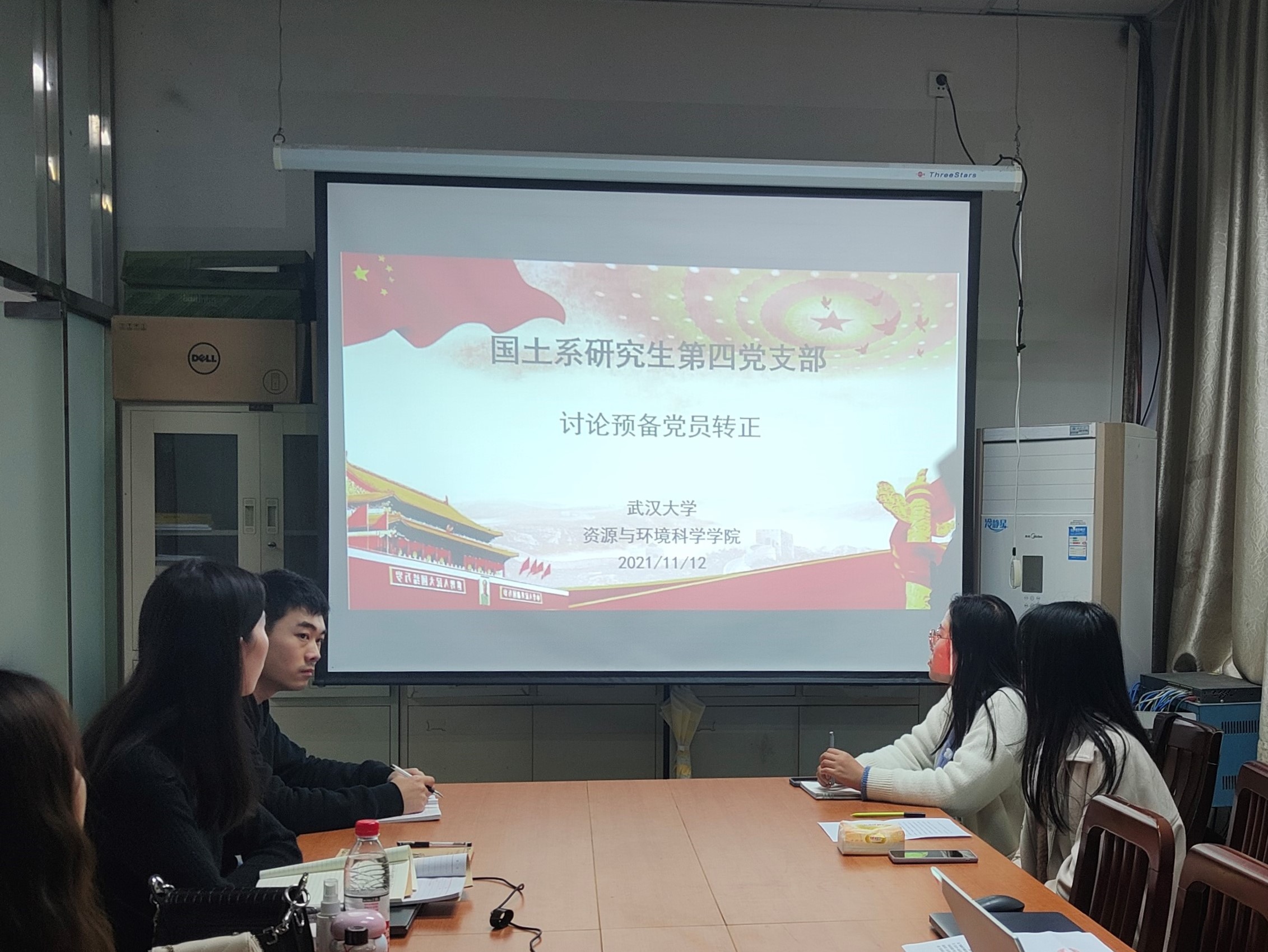 2021111217:30,地理科学与国土资源系第四党支部在澳门美高梅 406召开讨论预备党员崔婷婷同志转正的支部大会。本次会议由党支部书记侯梦杰主持。