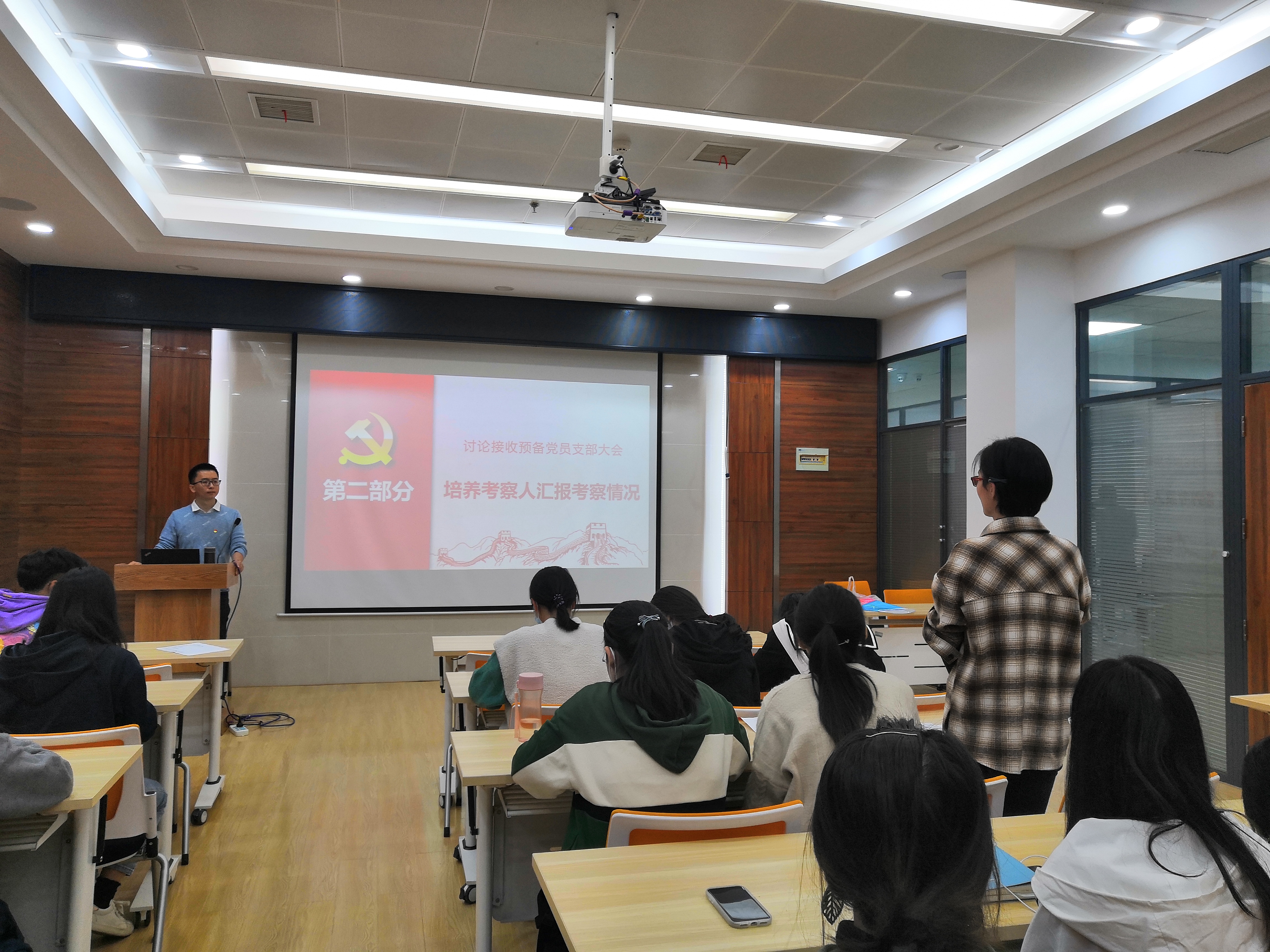 (二)会议第二项,培养考察人汇报考察情况。董玥、邵丽冰、张舒瑾三名同志的培养考察人分别介绍了三位同志在思想上、学习上和生活上的情况,对其是否具备入党条件发表了自己的意见。
