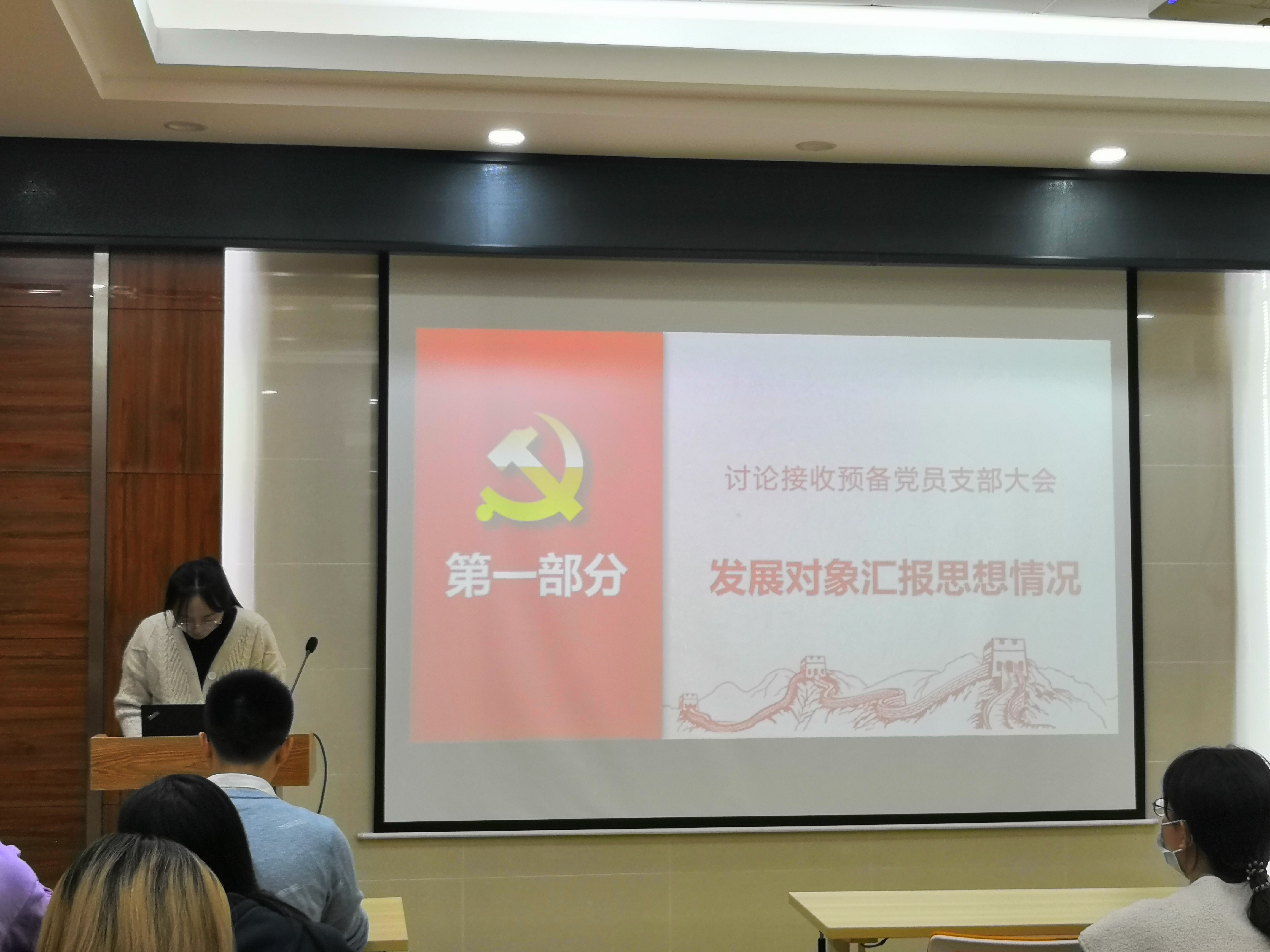 (一)会议第一项,发展对象汇报思想情况。董玥、邵丽冰、张舒瑾三名同志依次汇报了对党的认识、入党动机、本人履历、家庭成员和主要社会关系情况、现实表现、以及需向党组织说明的其他问题。