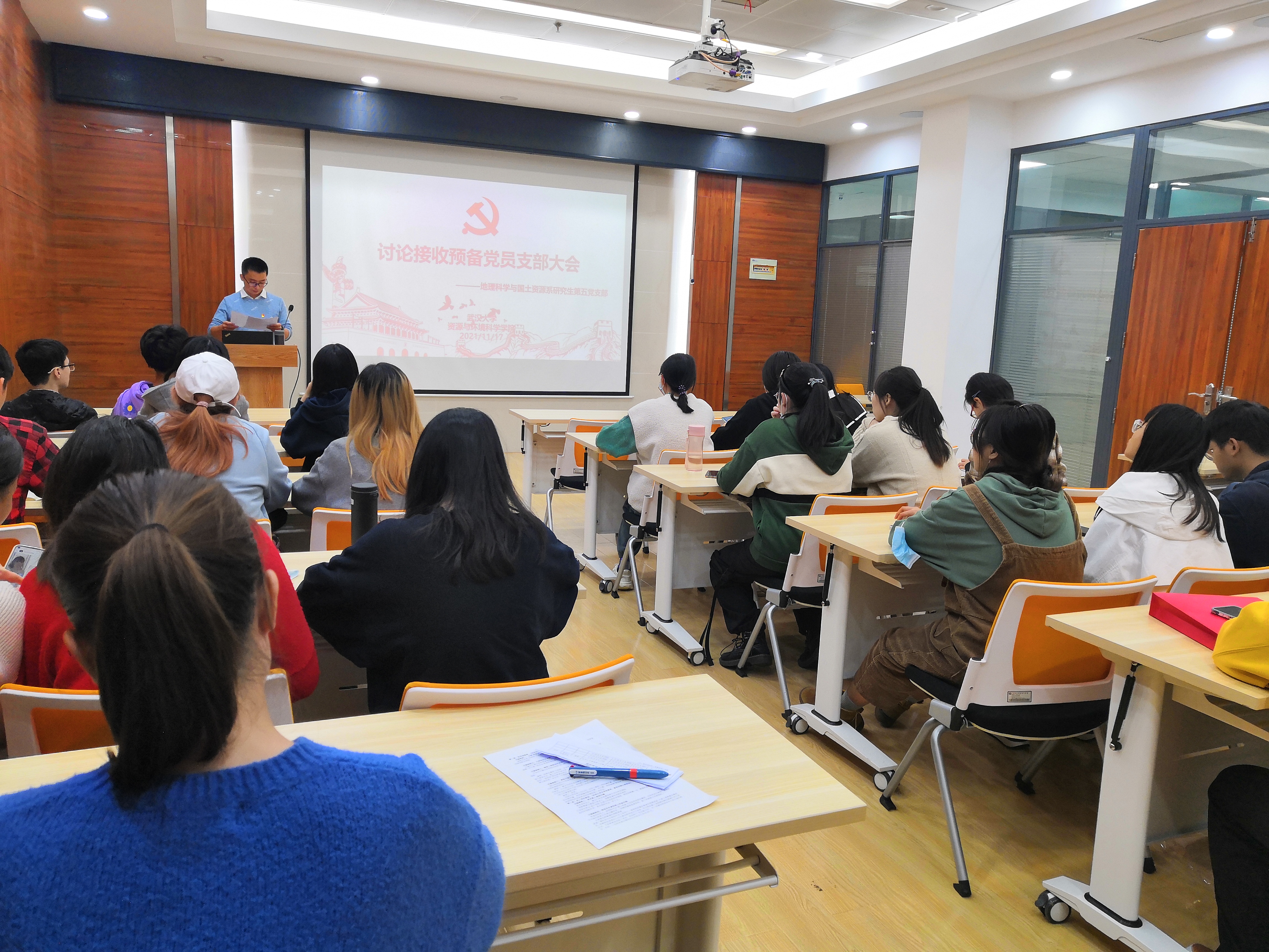 2021年11月17日晚上19:00,地理科学与国土资源系研究生第五党支部在电脑城429会议室召开讨论接收董玥、邵丽冰、张舒瑾三名同志为预备党员的大会,本次会议由地理科学与国土资源系研究生第五党支部书记程鹏同志主持。