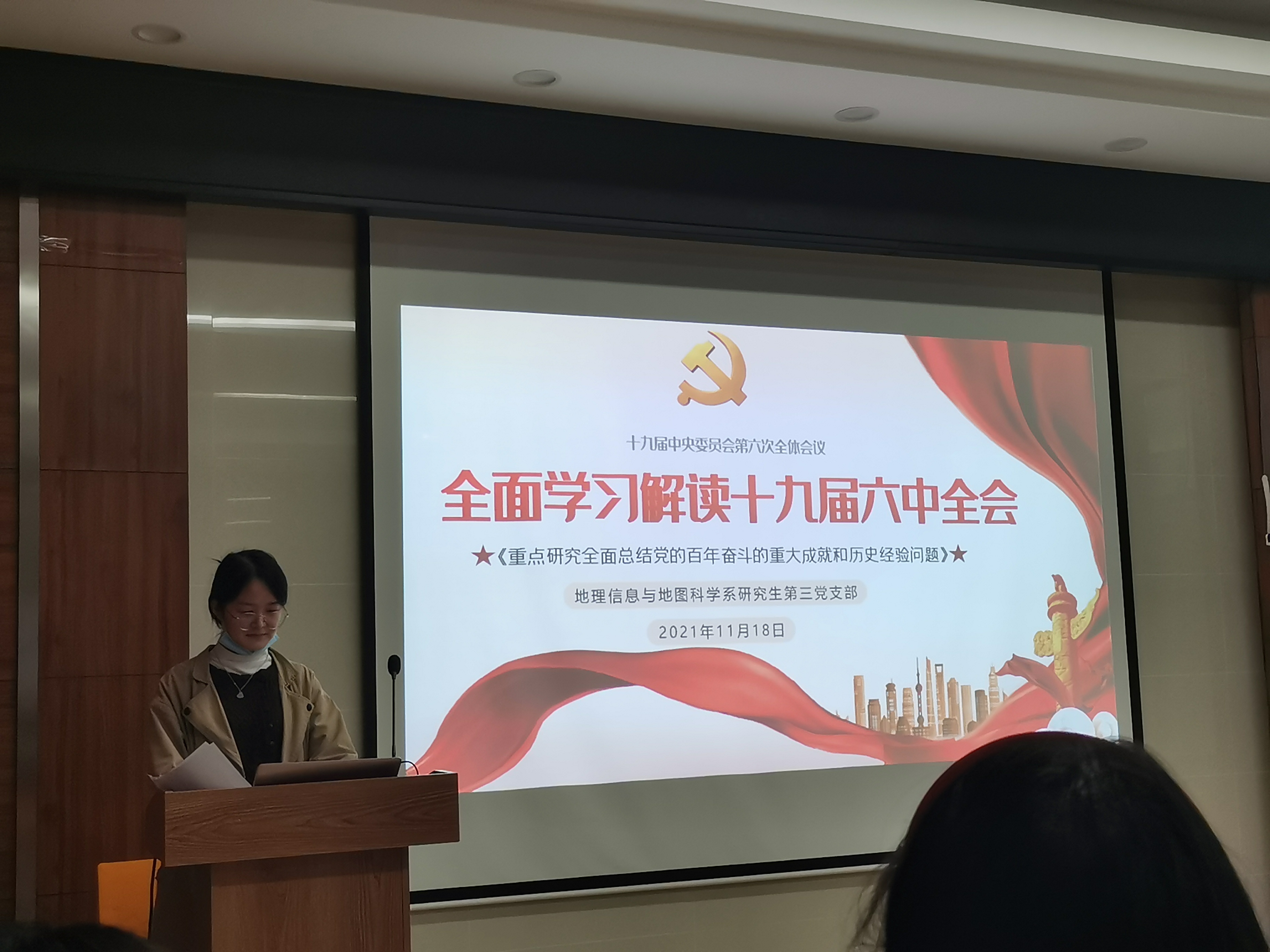 20211118日下午四点半,地理信息与地图科学系研究生第三党支部于电脑城429会议室召开“全面学习解读党的十九届六中全会”主题党日学习活动暨预备党员转正大会。本次会议由支部书记张梦同志主持,主要讨论关于预备党员翟冰雪同志的转正问题。