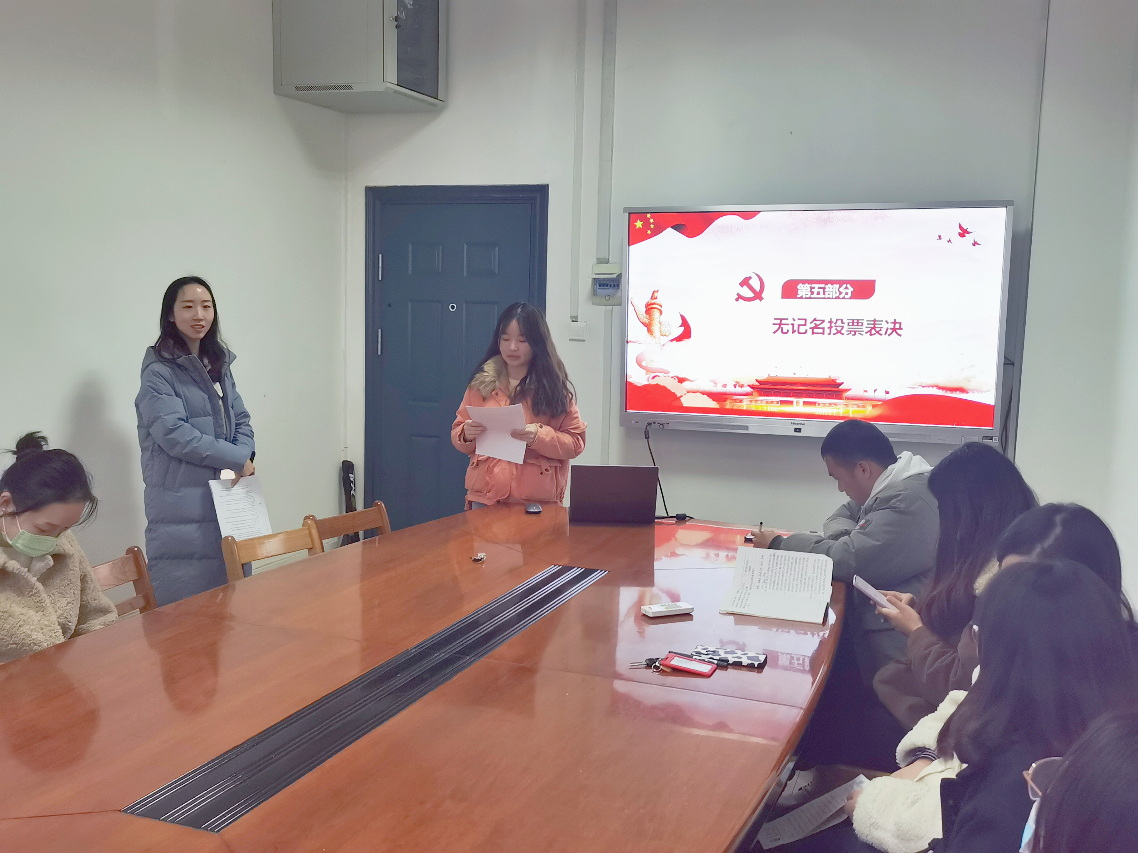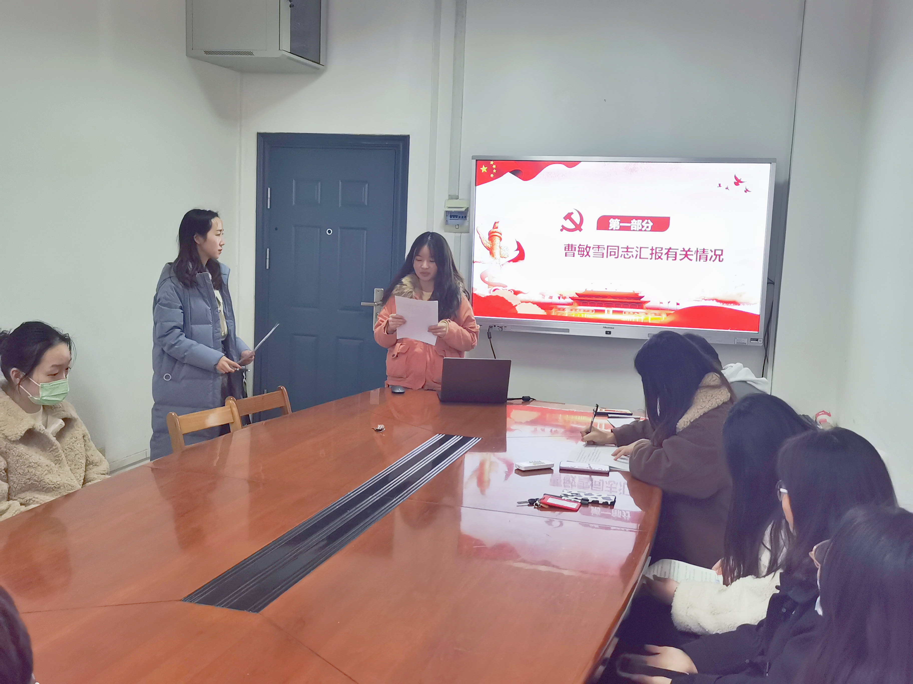 会议第一项,讨论接收曹敏雪同志为预备党员的工作。首先由曹敏雪同志汇报其对党的认识、入党动机和个人履历等情况;接着,入党介绍人谢璐励同志介绍发展对象有关情况;然后,支委会代表谢璐励向支部大会报告曹敏雪同志考察期间的积极表现,认为其符合共产党员的标准;经与会党员充分发表意见与不记名投票,书记罗明霞同志宣布曹敏雪同志全票通过接收成为中共预备党员。最后,曹敏雪同志做出了表态,向党组织表达了自身的想法与加入中国共产党的决心。