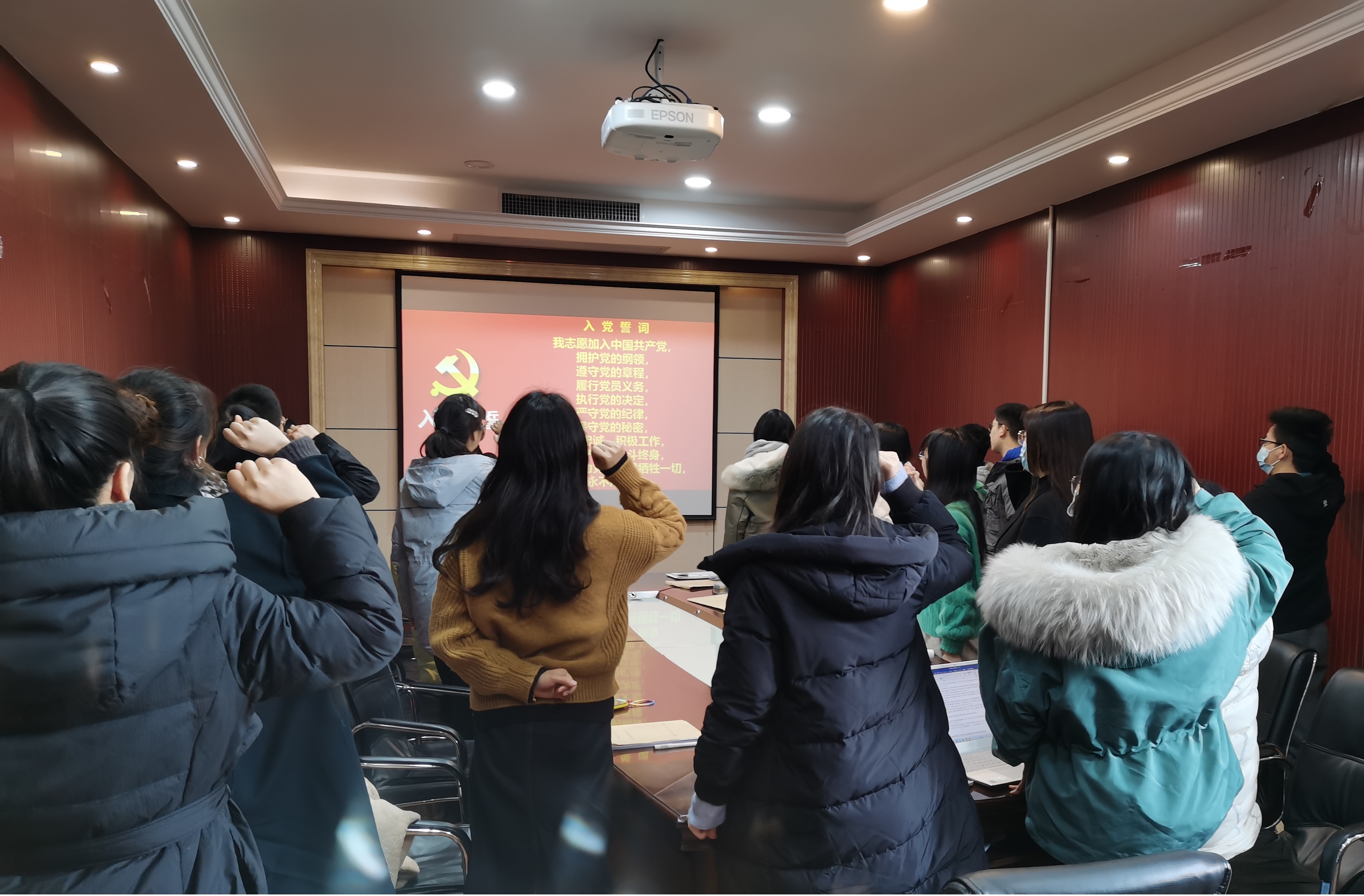 会议第三项,由正式党员进行无记名投票。本支部共有党员33名(有表决权的党员19名),到会28名(有表决权的党员19名),经无记名投票,同意19名,反对0名,弃权0名。支部书记苏会钰宣读大会决议,认为刘惠、黄京、戴晨露、邓婕四名同志已具备正式党员的条件,同意其按期转正。随后四名新转正的党员同志进行表态,由支部书记苏会钰带领大家宣读了入党誓词,此次预备党员转正大会圆满结束。