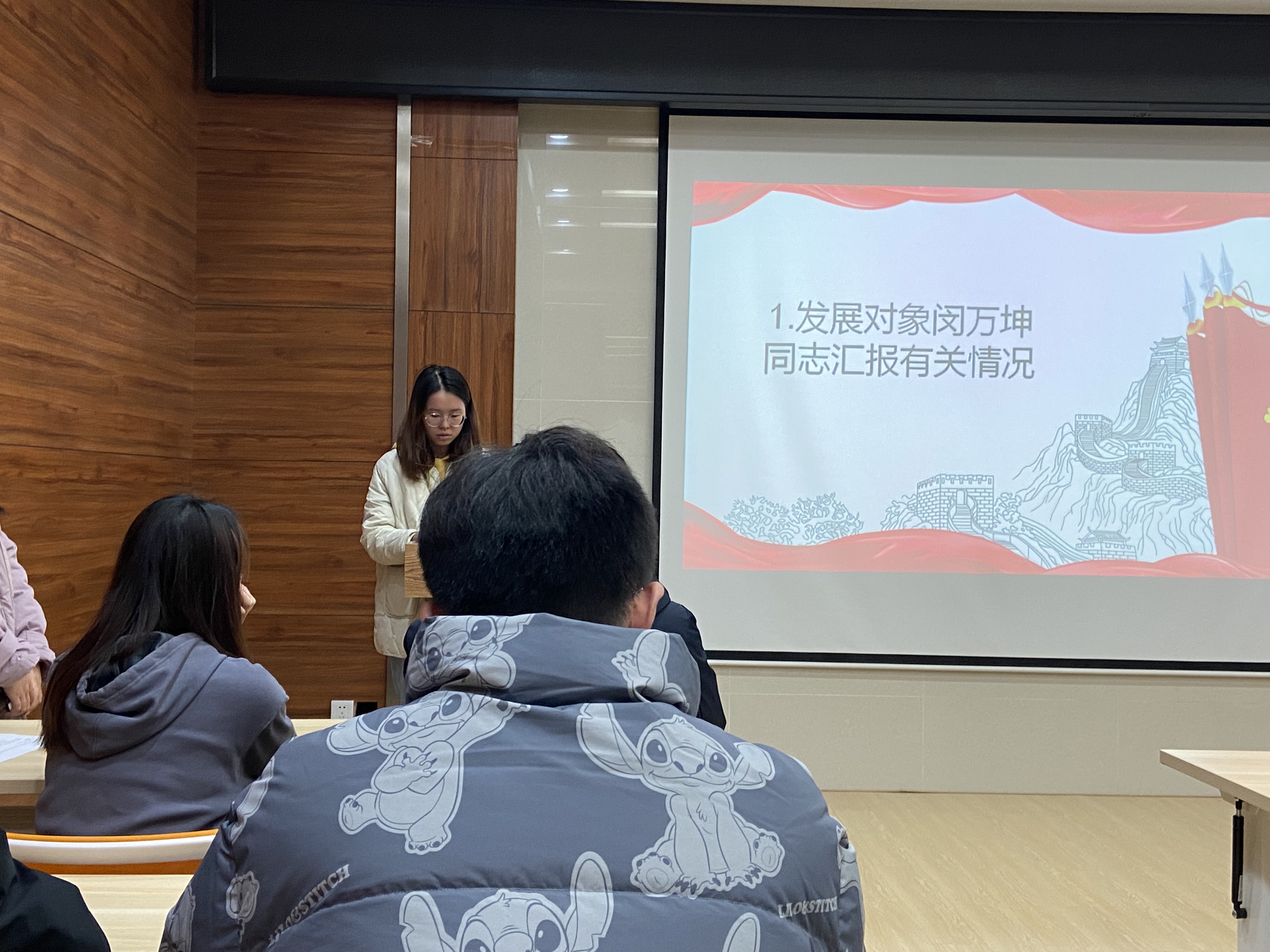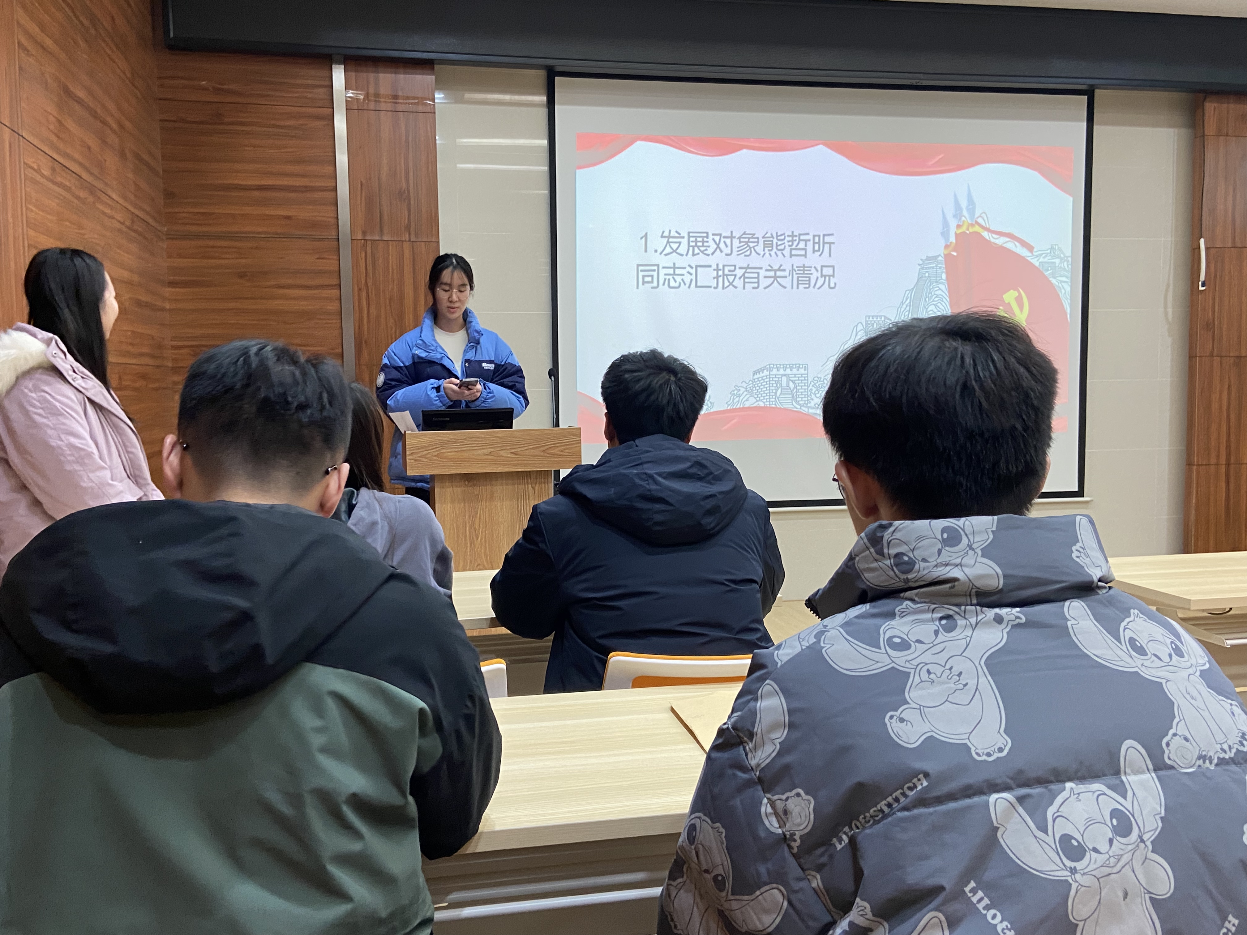 会议第一项,逐个讨论接收熊哲昕和闵万坤同志为预备党员。首先由熊哲昕和闵万坤同志依次汇报其对党的认识、入党动机等思想状况;接着由熊哲昕和闵万坤同志的入党介绍人分别介绍两位同志的有关情况;然后,由支委会代表焦丹同志和陶雨婷同志分别向支部大会报告对熊哲昕和闵万坤同志的审查情况,最后与会党员代表对两位同志能否入党分别发表了建议,一致认为其符合共产党员的标准;经与会党员充分发表意见与不记名投票,党支部书记焦丹同志宣布大会一致同意接收熊哲昕和闵万坤同志成为中共预备党员;最后,由党支部书记焦丹同志带领熊哲昕同志和闵万坤同志进行入党宣誓。