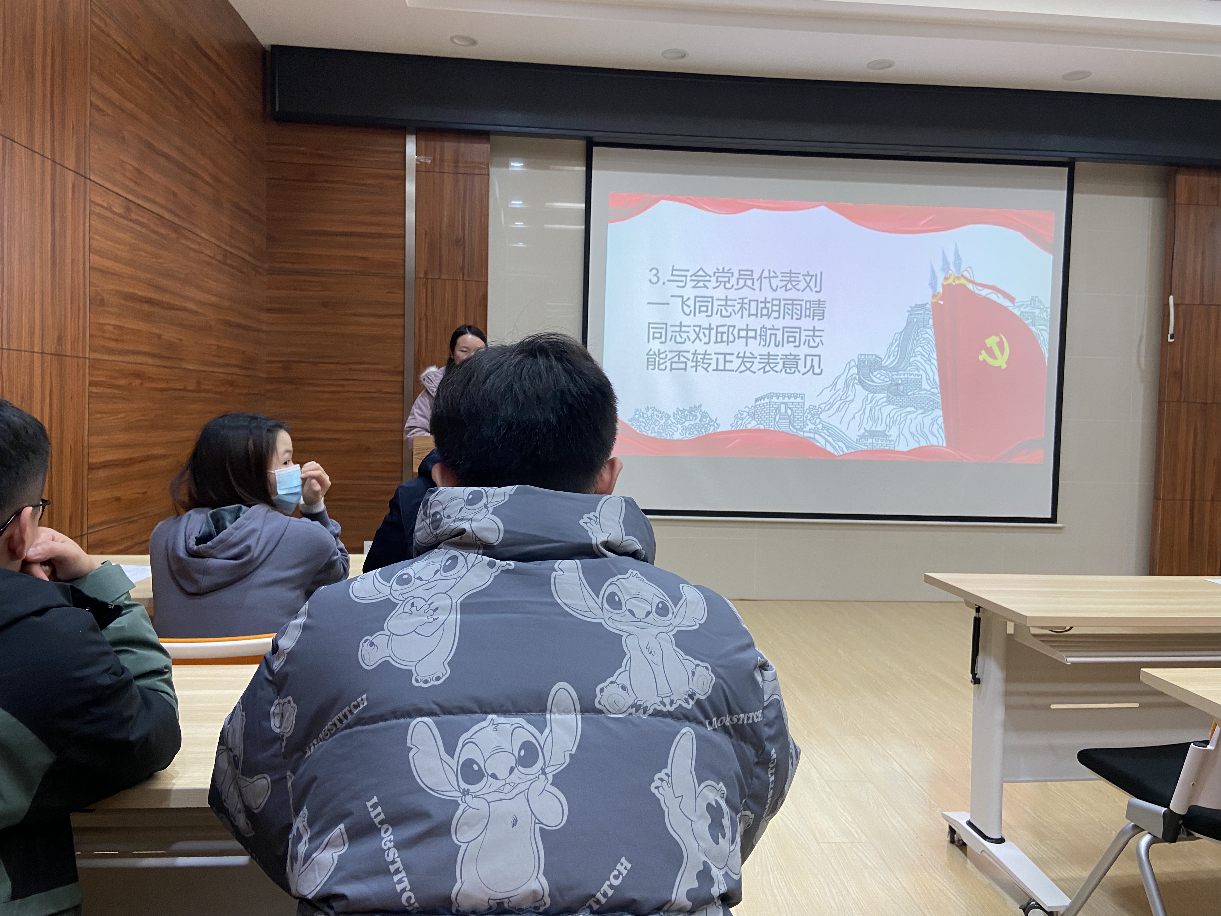会议第二项,逐个讨论邱中航和陈淑杰两名同志的预备党员转正。首先,由邱中航和陈淑杰两名同志依次提出转正申请,分别汇报在预备期间的思想、学习、生活等情况;接着由支委会代表马俊和焦丹同志分别介绍邱中航和陈淑杰同志在预备期间的教育考察情况;然后,由与会党员代表对邱中航和陈淑杰两名同志能否转正发表意见,认为其符合转正条件;经与会党员充分发表意见与不记名投票,党支部书记焦丹同志宣布邱中航和陈淑杰两名同志全票通过成为中共正式党员;其后,邱中航和陈淑杰两名同志分别进行表态,向党组织表达了自身的决心与信心;最后,由党支部书记焦丹同志带领邱中航和陈淑杰同志重温誓词。