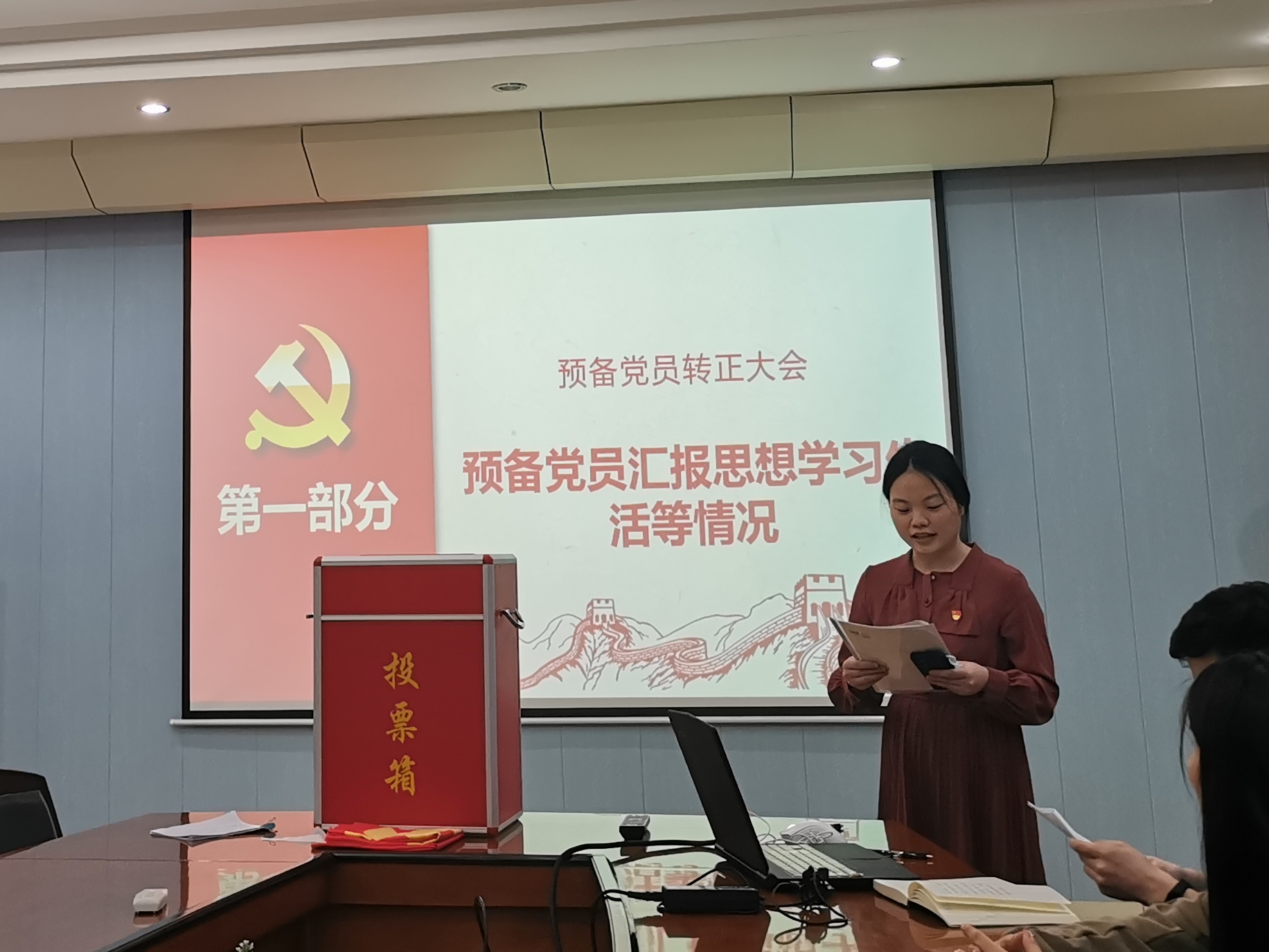 会议第一项议程是讨论预备党员曾珍同志的转正问题。首先,由预备党员曾珍同志向支部汇报预备期间的思想情况及学习、工作表现。
