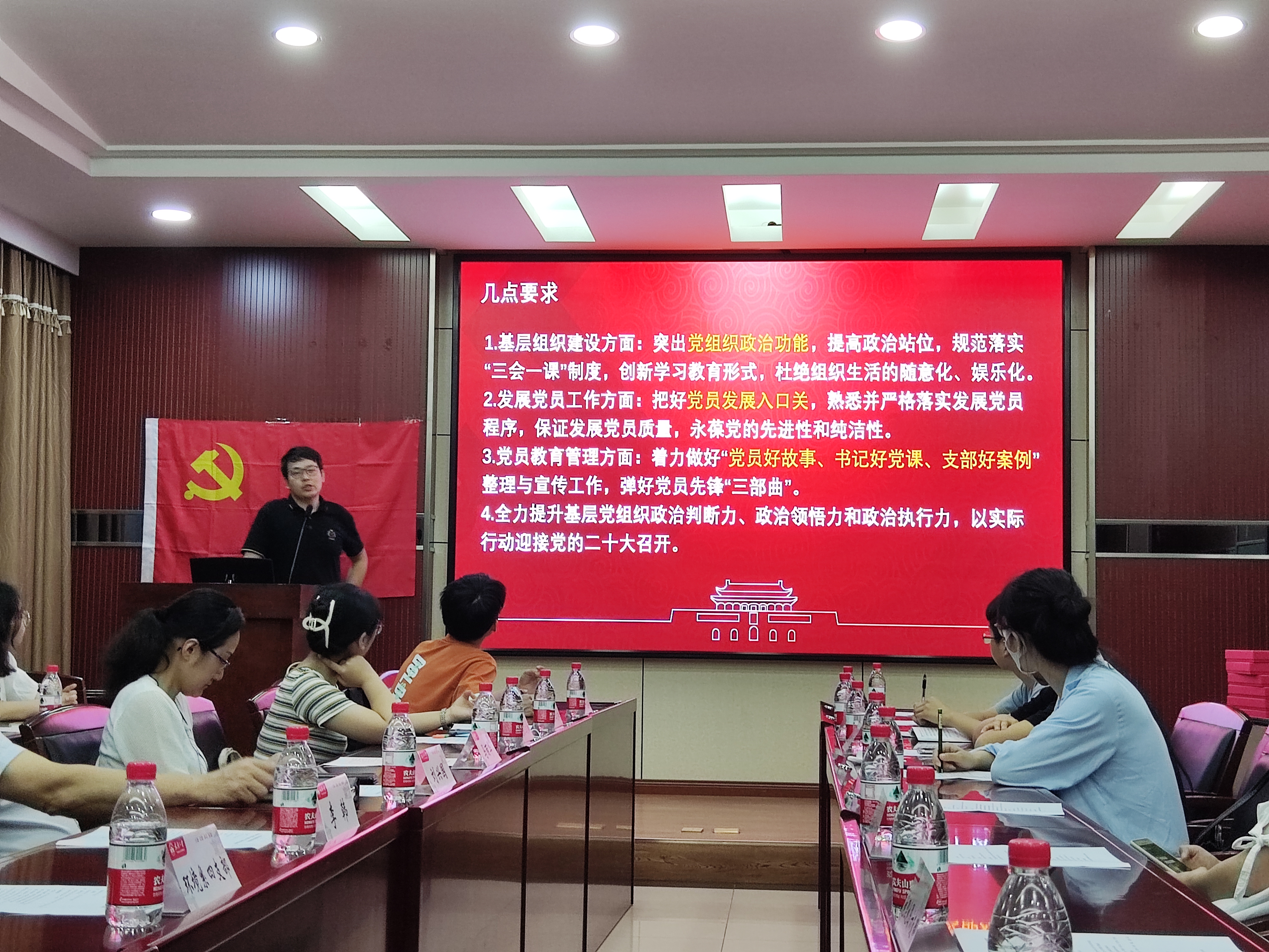 李韩老师回顾并总结了学院上半年党建工作,他指出学院党建工作做到了“四有”——有底蕴、有成绩、有自信、有平台。从理论学习有规划、帮扶团建有温度、结对共建促发展、媒体宣传有成效四个方面总结了上一阶段党建工作,并对下一阶段党建工作提出具体要求:巩固基层组织建设、做好发展党员工作、弹好“党员好故事、书记好党课、支部好案例”三部曲,全面提升基层党组织政治判断力。