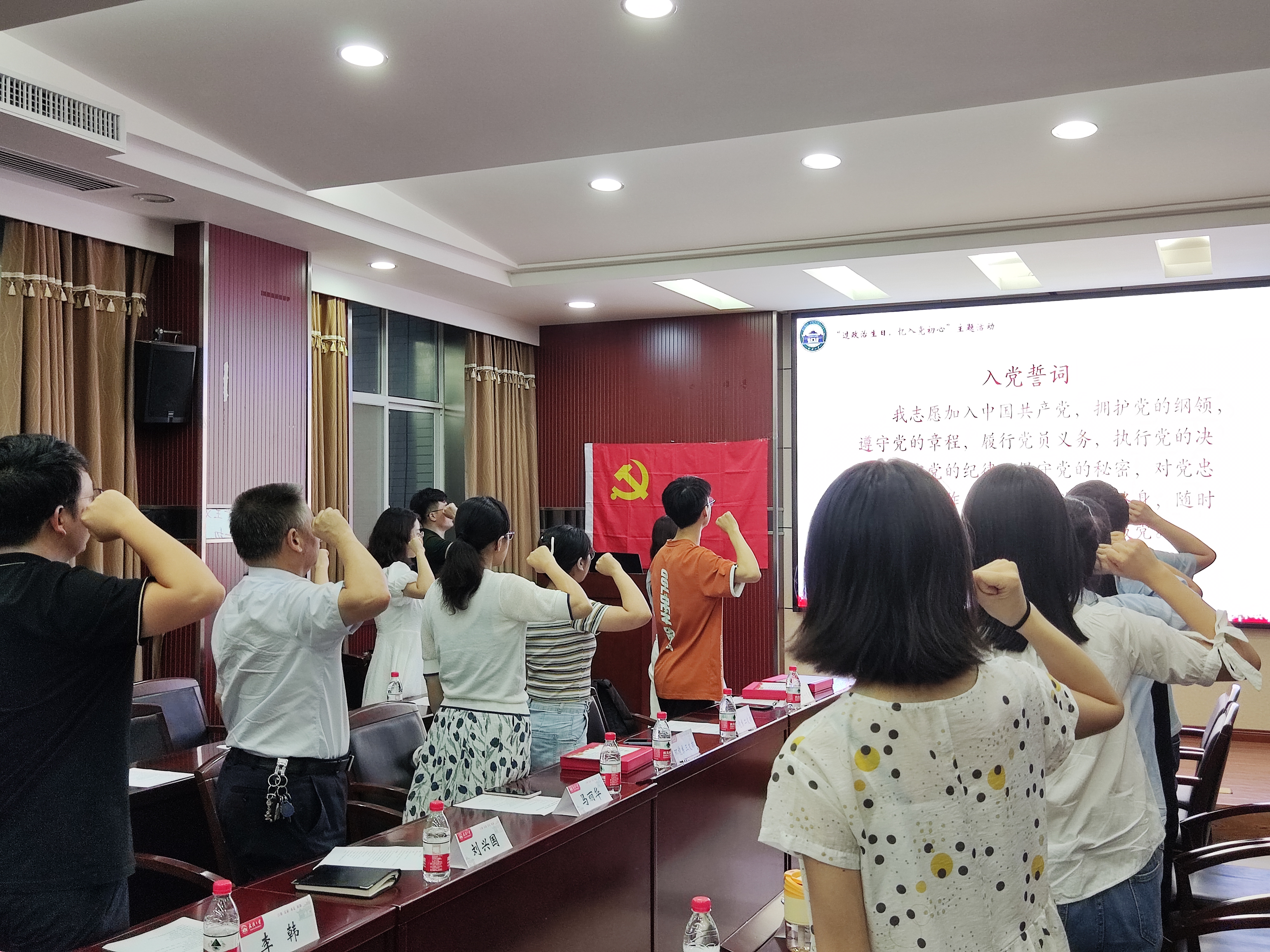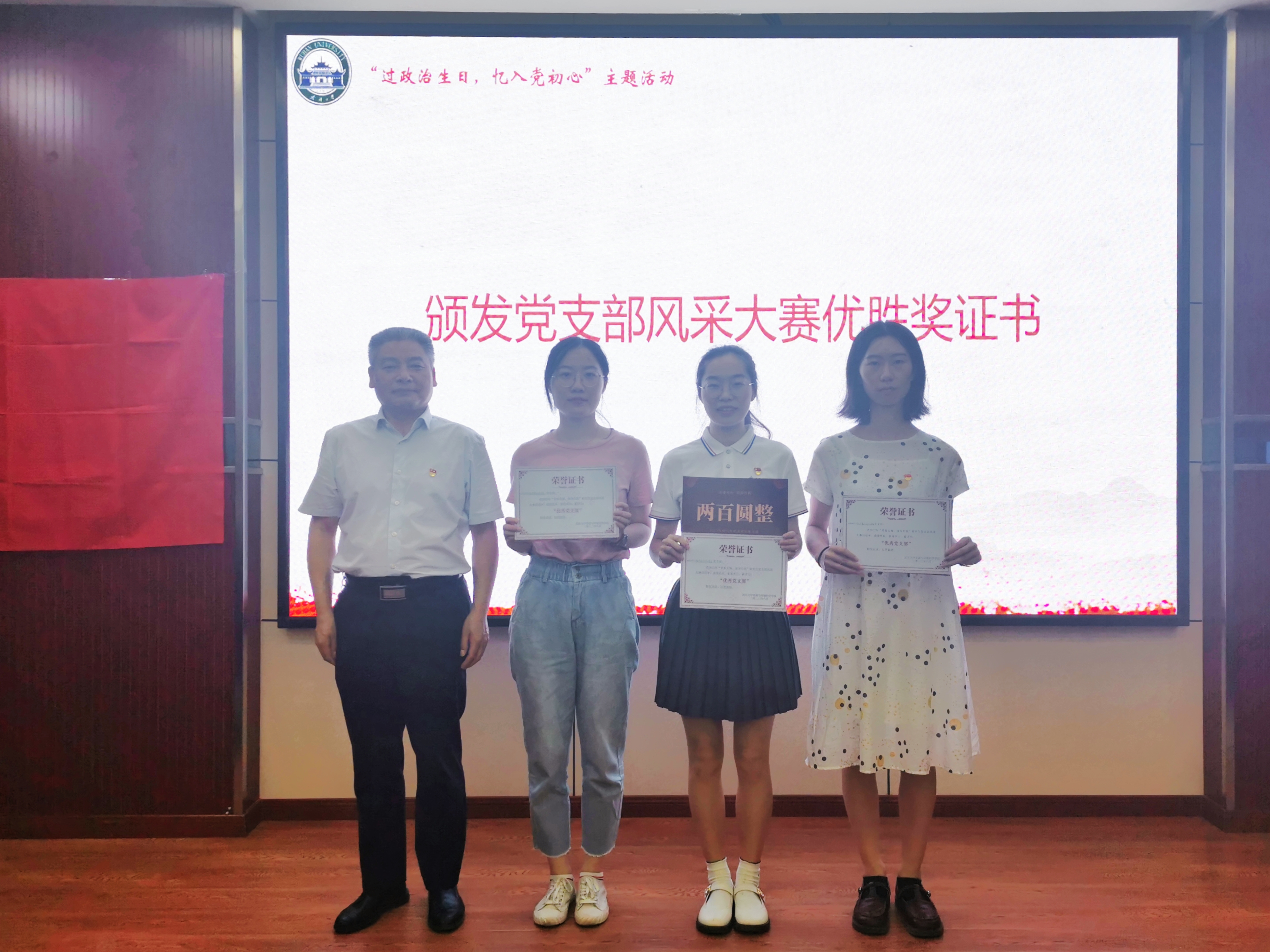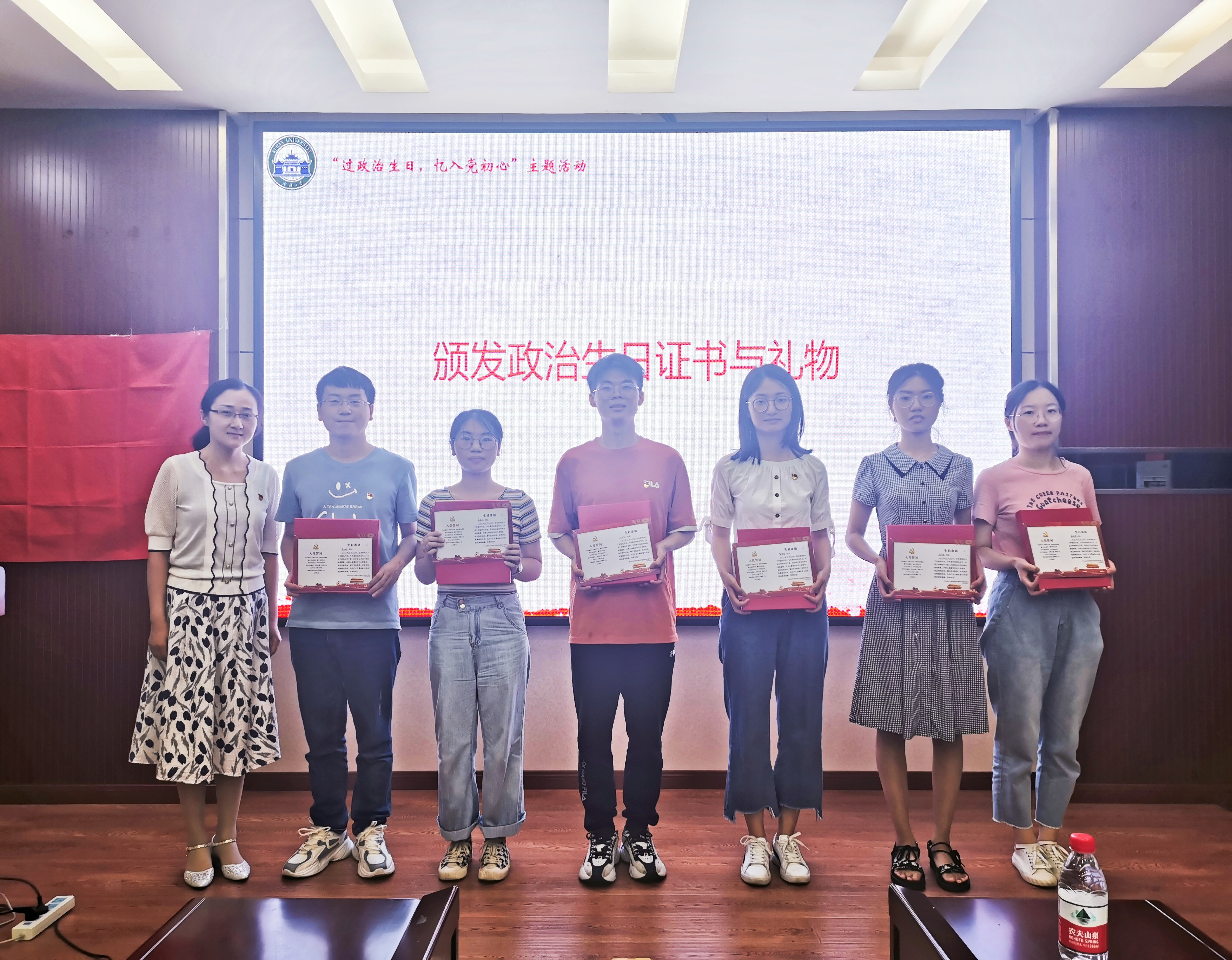 下半年过政治生日的党支部书记(副书记)与大家分享了上一阶段的党建工作,他们表示这份经历对淬炼自身党性修养帮助颇多,下一阶段仍会继续发挥学生党员干部以身作则、服务群众、示范引领的先锋模范作用。院党委副书记马丽华、辅导员李韩为他们颁发证书与纪念品。同时,全体参会党员重温入党誓词,重温入党初心。