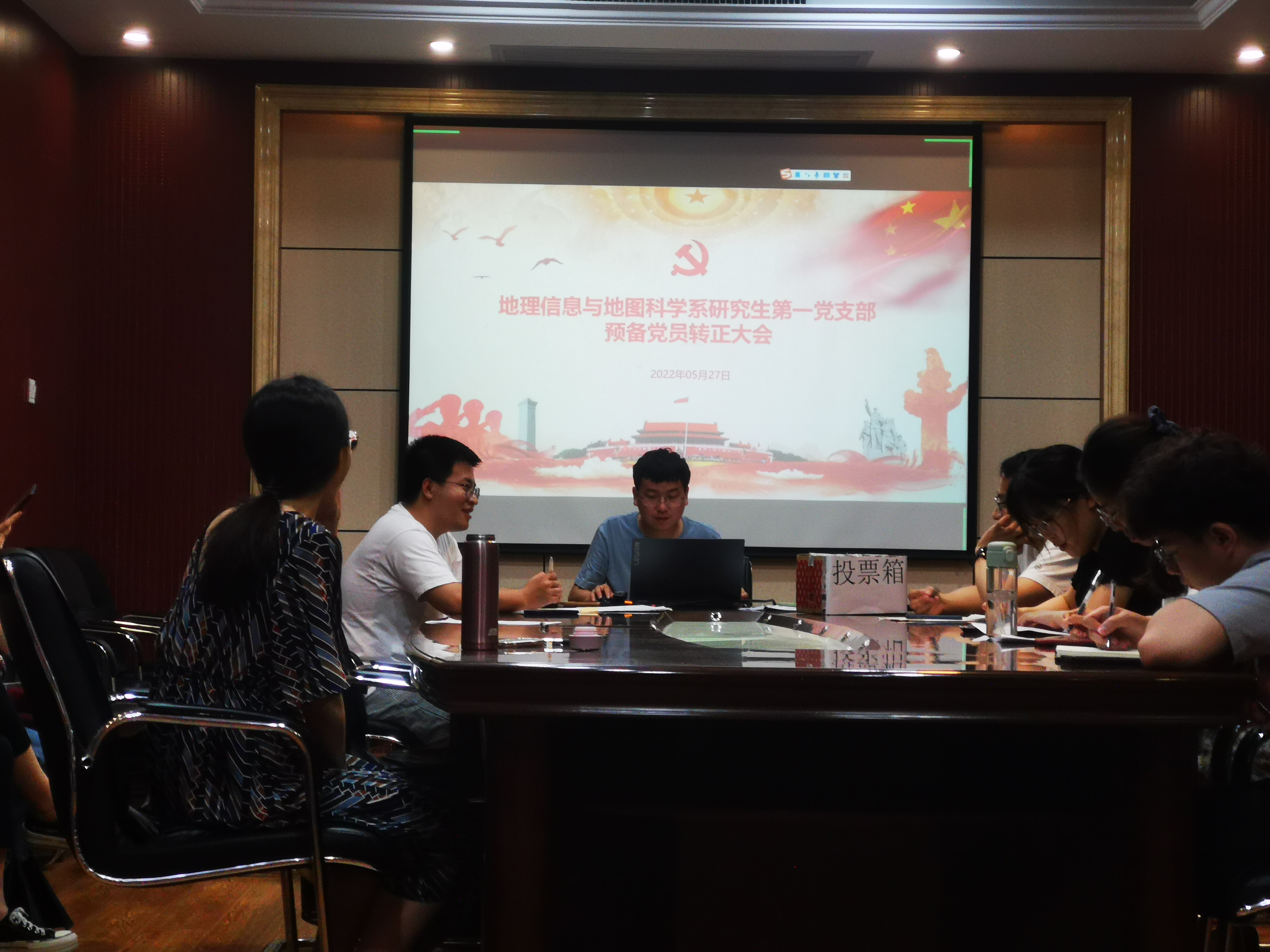 2022年5月27日晚19:00,地理信息与地图科学系研究生第一党支部党员转正大会于院办504会议室召开。会议主要议程有以下两项:一是支部集体进行习近平总书记在中国人民大学考察时重要讲话精神的学习;二是党支部讨论了预备党员赵玉春同志和刘子锐同志转正相关事宜。本次会议由支部书记李石标同志主持,本次会议应到正式党员26人、预备党员7人,实到正式党员22人、预备党员6人。