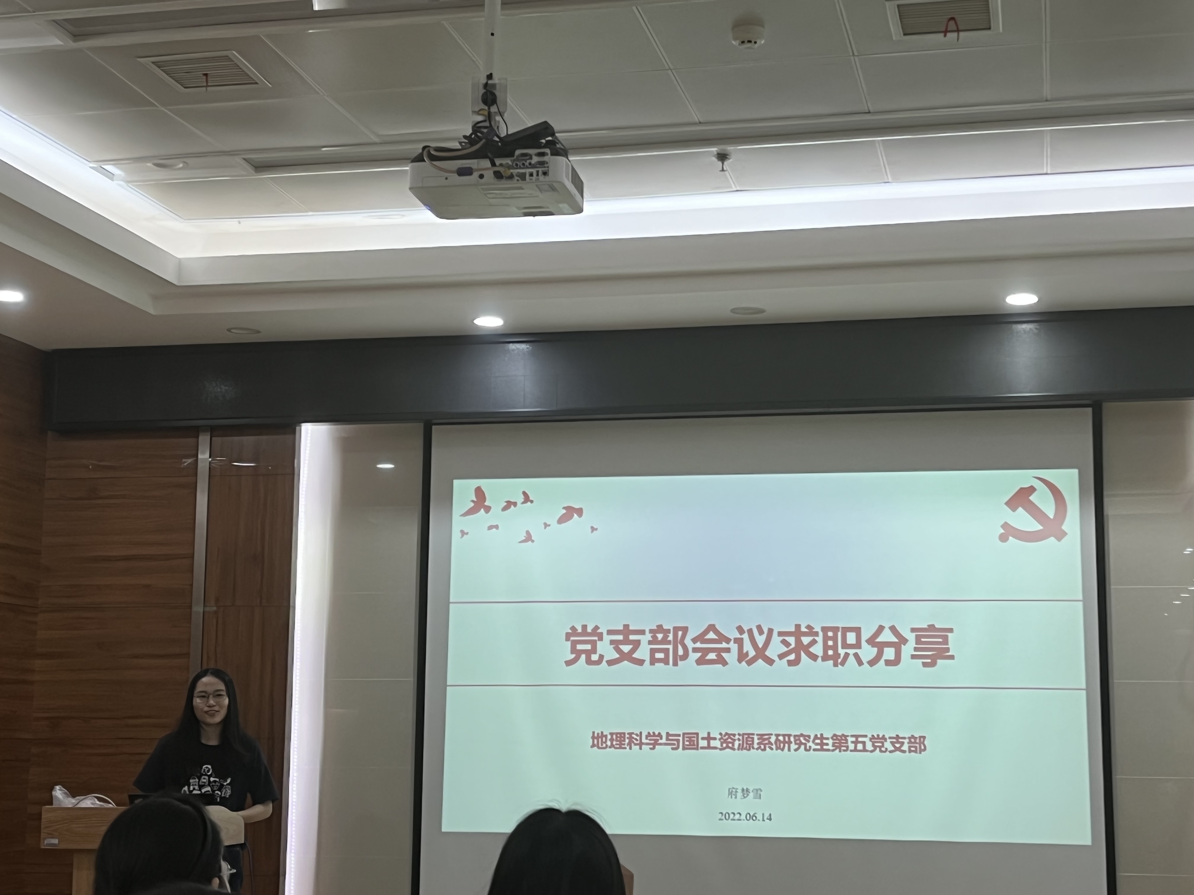 会议第四项,党支部同志的求职、升学等经验分享。首先,分别由测绘工程专业朱丽芳、土地资源管理专业府梦雪、人文地理专业王诗琪三位同志带来求职经验分享。三位同志就自己的求职经历、求职过程的经验教训、求职规划、求职建议等多方面向大家分享,不仅为明年毕业的同志在求职方面“排雷避坑”,而且让大家对毕业去向和选择有了更加清晰的了解和认知。