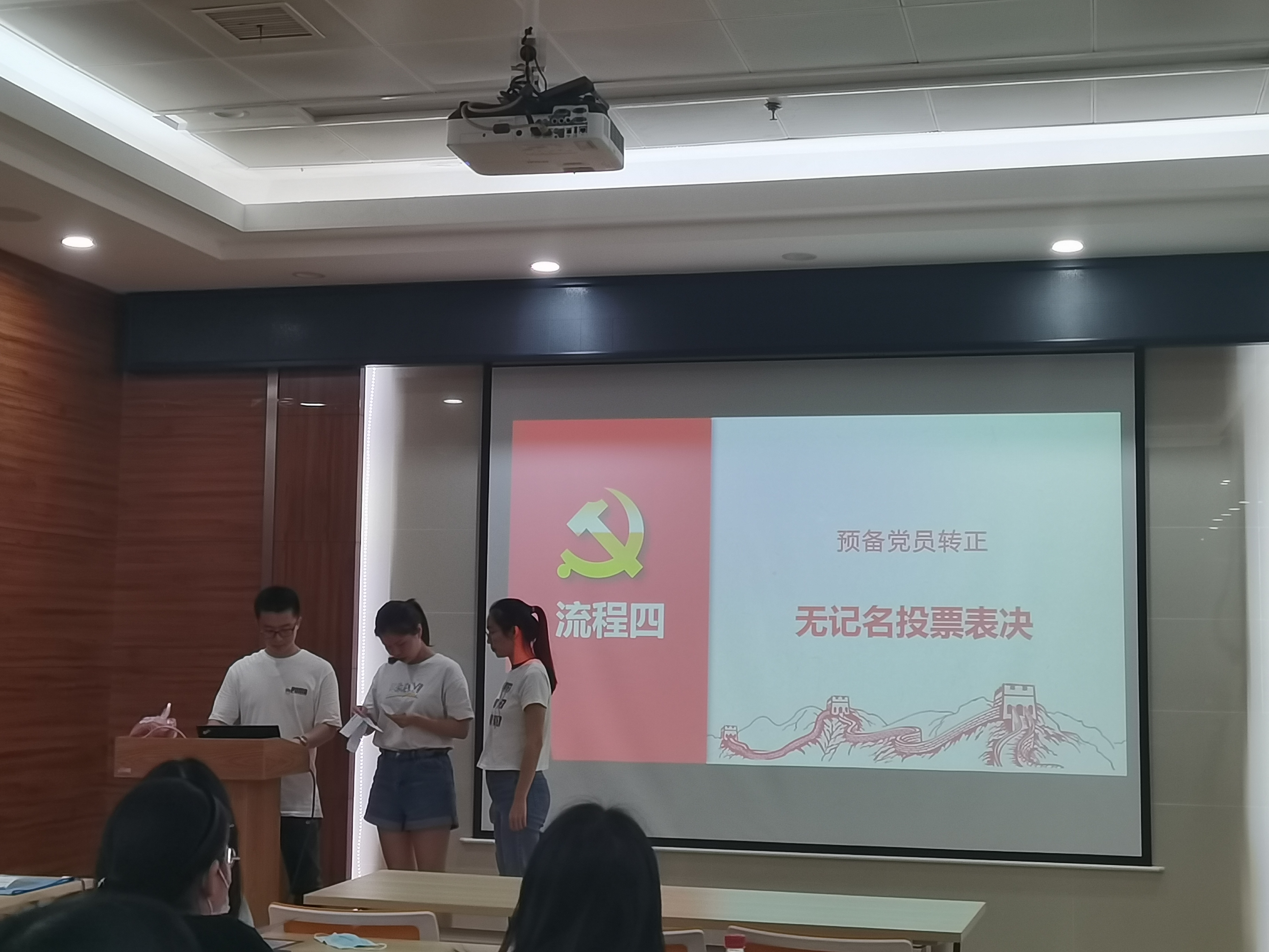 然后,由程鹏同志代表支部委员会向支部全体成员宣布对蒋江俊男同志的审查结果,认为其符合转正条件;随后经与会党员充分发表意见与不记名投票并现场公示投票结果,程鹏同志宣布蒋江俊男同志全票通过成为中共正式党员;