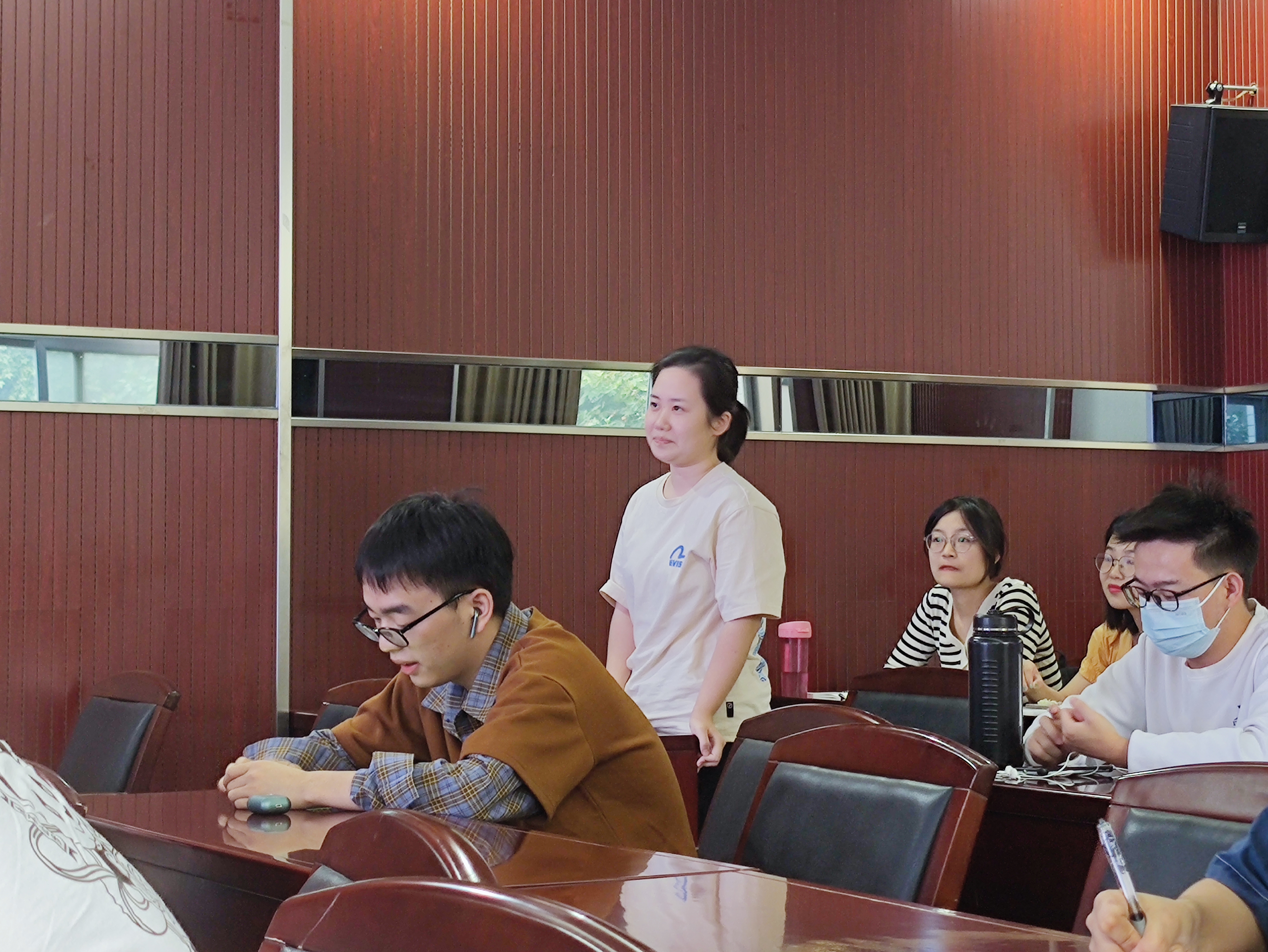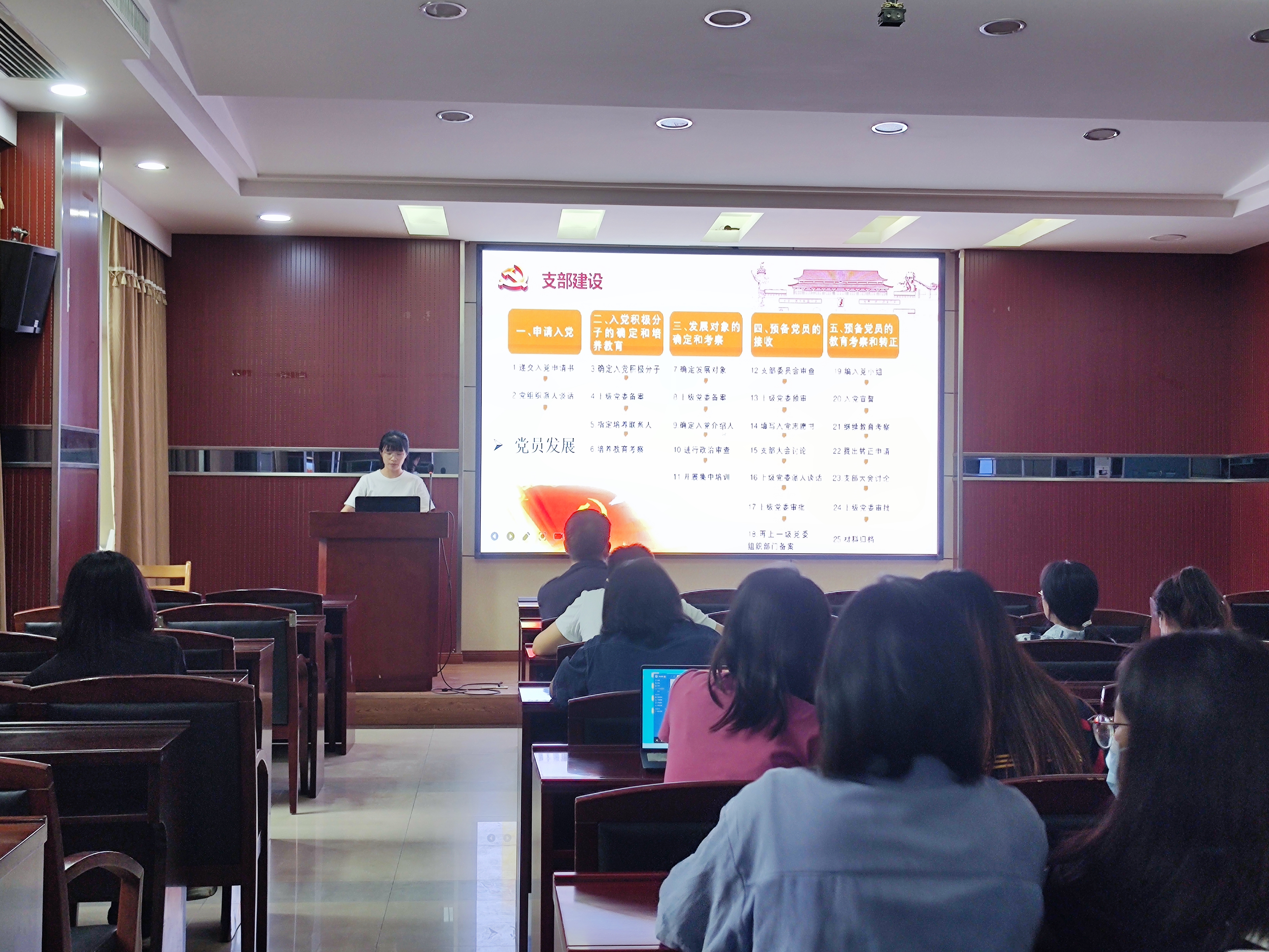 会议第一项,欢迎新同志并介绍党支部基本制度规定和本学期工作安排。首先,支部书记胡慧介绍了支委会成员及工作职责,接着从按时开展“三会一课”、规范党员发展工作和组织支部特色活动三方面说明了本学期支部工作安排。李韩老师重点强调了“三会一课”、党员发展等会议时无故不得缺席的问题,提出应当重视党支部的各项流程和活动。随后,本学期加入支部的新同志先后进行了自我介绍,六位新党员分别是贺方玖、陈俊青、马一凡、王革惠、杜静维、周睿雅。