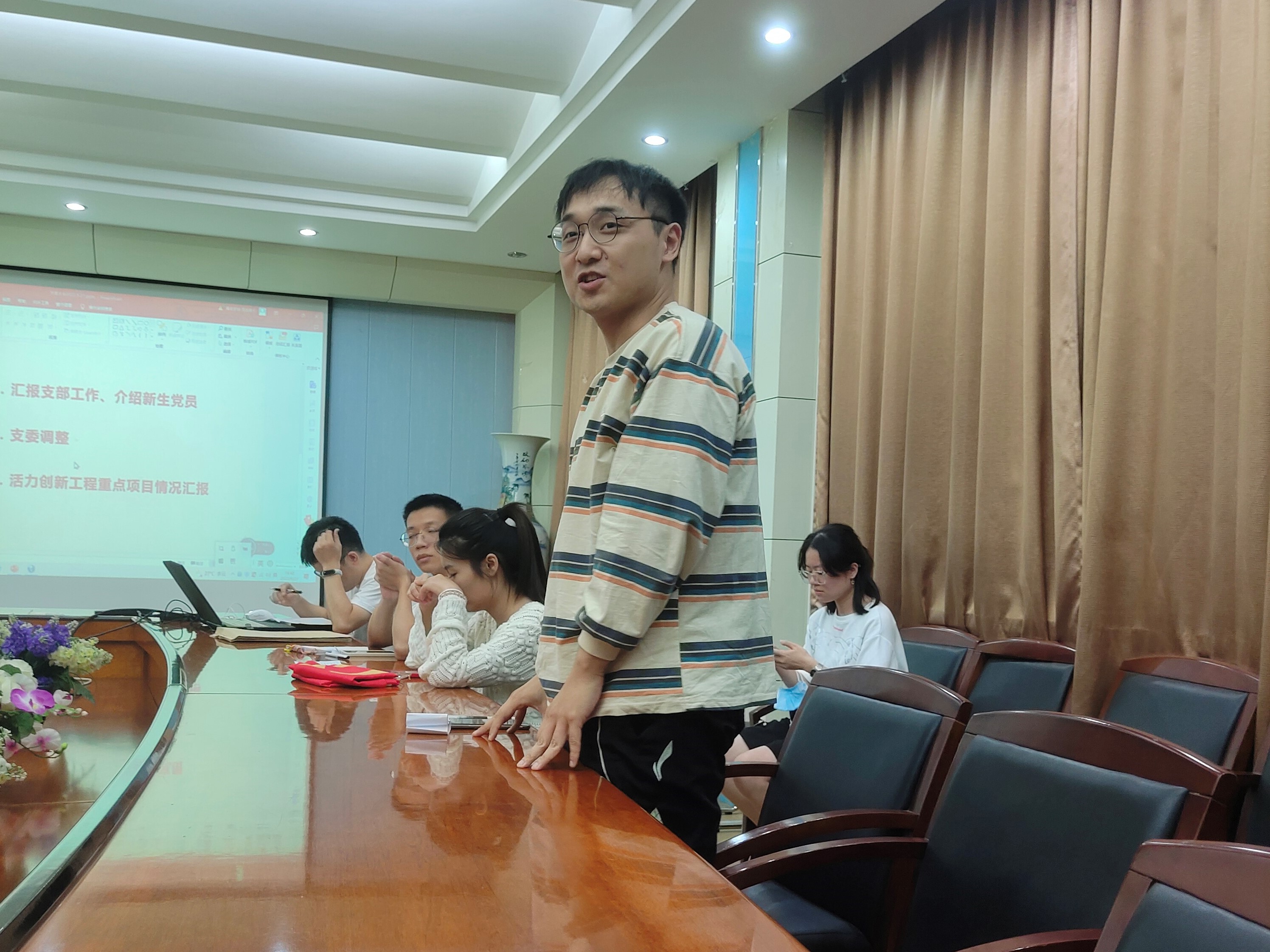 会议第一项,支部工作的汇报及新生党员的自我介绍。第一,郑传帮同志从支部概况、支部的工作开展情况等方面出发,对支部的工作展开了全面的汇报。第二,杨晨、刘嵩雯、黎满耀等6位新生党员进行了自我介绍,全体党员对他们的加入表示热烈欢迎。