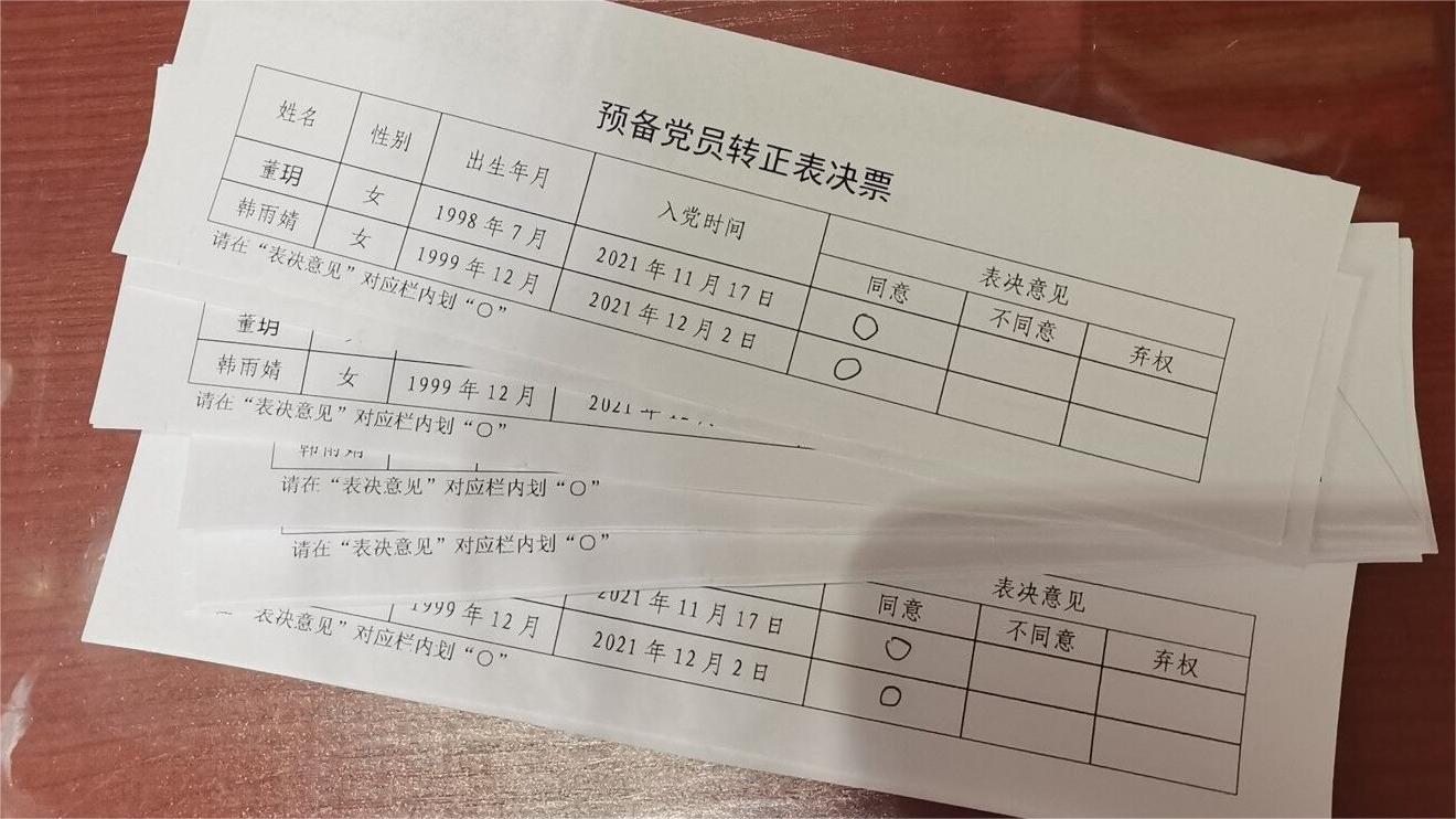 接着,与会的正式党员就两位同志的转正问题进行了现场无记名投票。徐立颖同志宣布决议,董玥及韩雨婧同志全票通过,将按期转为中共正式党员。其后,董玥及韩雨婧同志依次进行表态,向党组织表达了自身的决心与信心,表示将会在今后的学习生活中继续踏实学习、努力工作,切实发挥好党员的先锋模范作用。