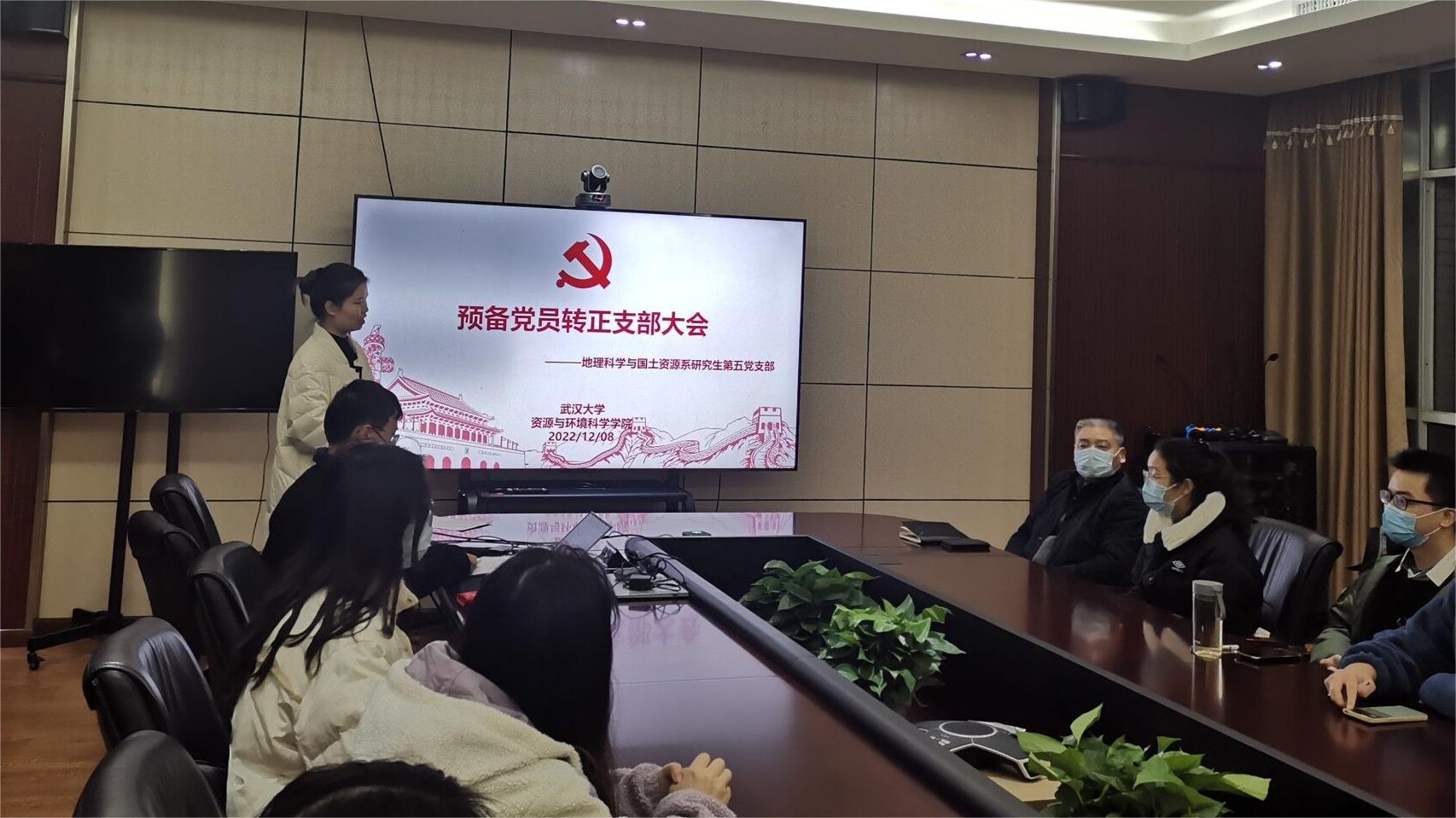 2022年12月8日晚7点,地理科学与国土资源系研究生第五党支部于资环院办320会议室召开预备党员转正大会暨主题党日活动,邀请到了学院党委书记刘兴国老师参会并发表讲话。本次会议由党支部书记徐立颖同志主持,主要包括预备党员董玥与韩雨婧同志的转正讨论以及“二十大精神学习”两项议程。会议应到正式党员22名,实到会正式党员20名,其中因疫情原因线上参会正式党员2名,有表决权的到会人数超过应到会有表决权人数的半数,符合规定人数,可以开会。