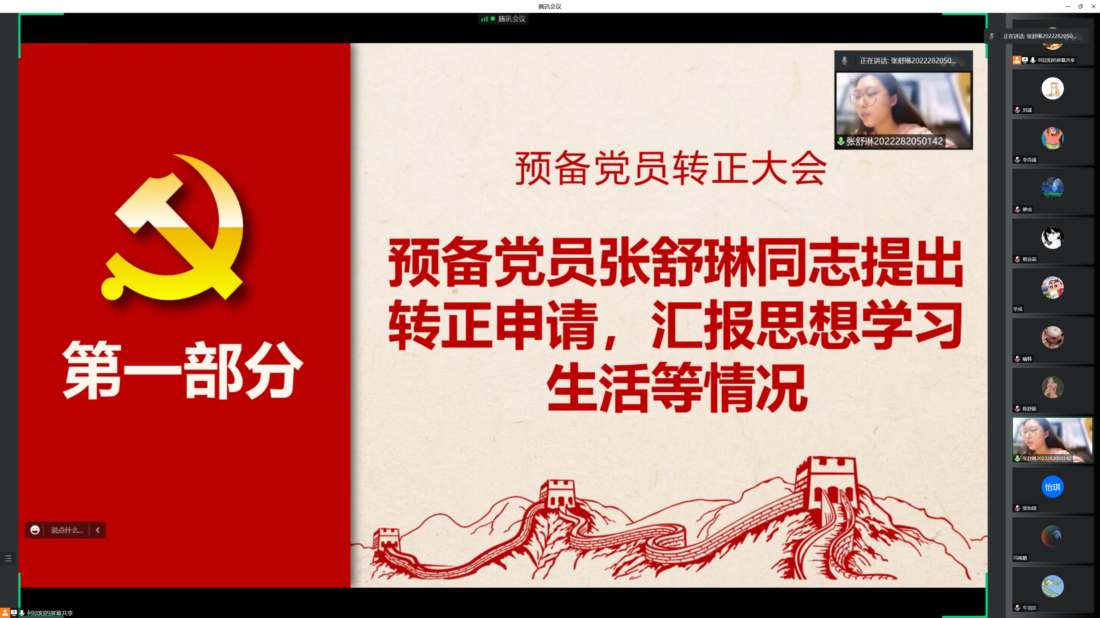 会议第二项,讨论张舒琳同志的转正工作。首先由张舒琳同志汇报预备期间的思想和工作情况;之后由支部委员会报告张舒琳同志预备期间的教育考察情况。与会党员牛羽庆同志对张舒琳同志预备期间的各方面表现予以肯定,同意其按期转正。
