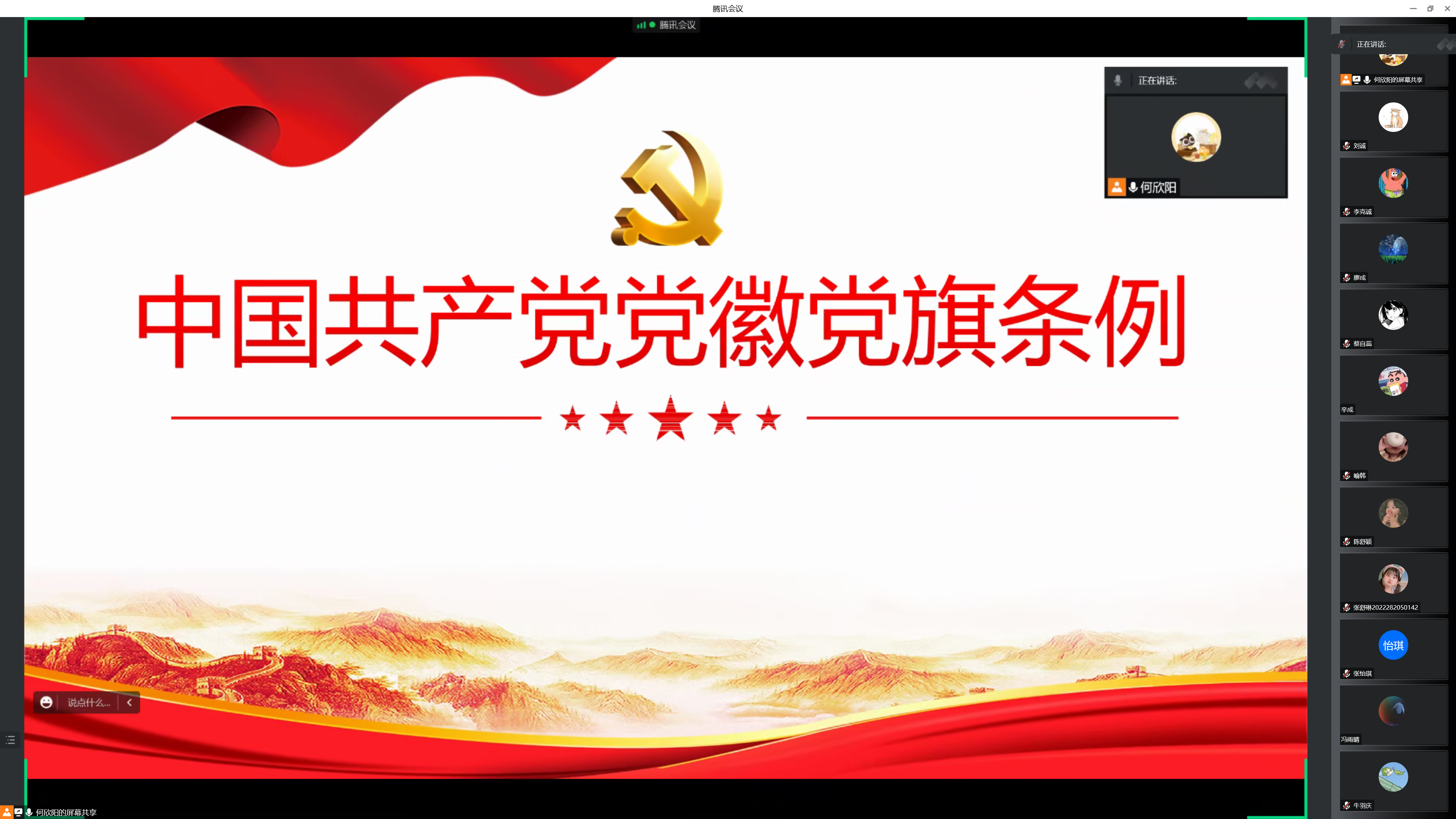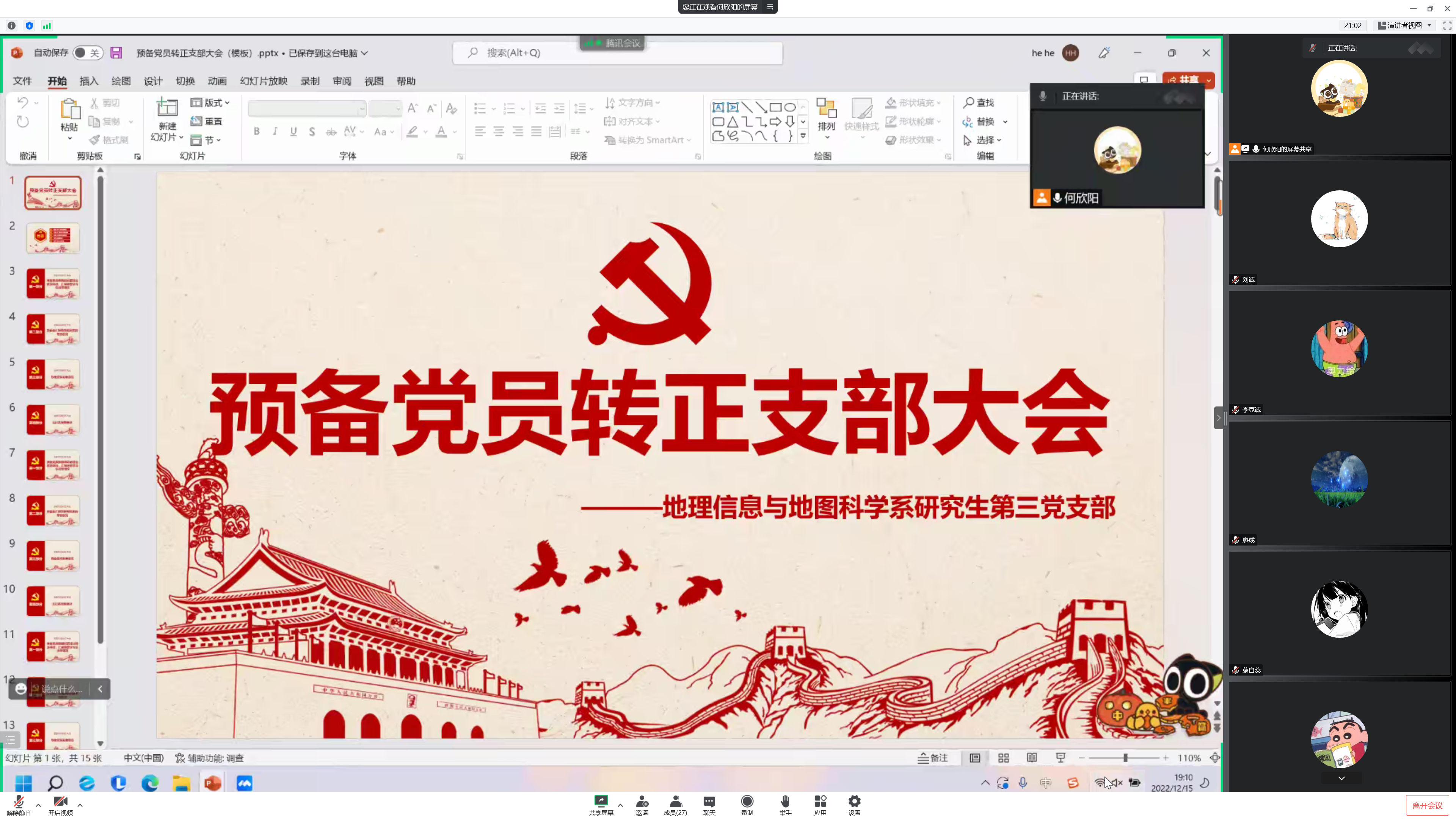 2022年12月15日晚七点,地理信息与地图科学系研究生第三党支部召开预备党员转正大会暨学习《中国共产党党徽党旗条例》主题党日活动。本次会议由支部书记何欣阳同志主持。