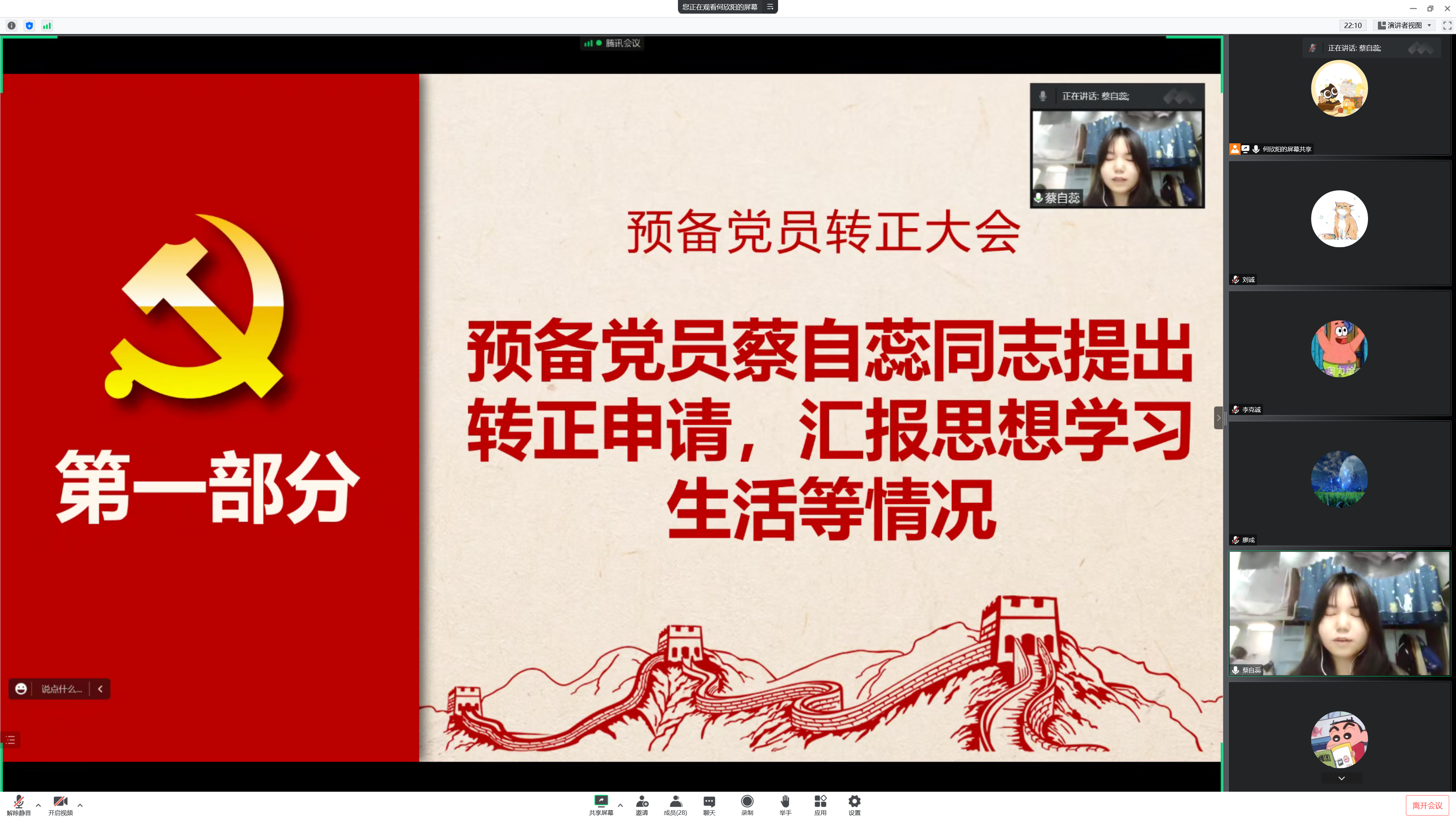 会议第一项,讨论蔡自蕊同志的转正工作。首先由蔡自蕊同志汇报预备期间的思想和工作情况;之后由支部委员会报告蔡自蕊同志预备期间的教育考察情况。与会党员牛羽庆同志对蔡自蕊同志预备期间的各方面表现予以肯定,同意其按期转正。