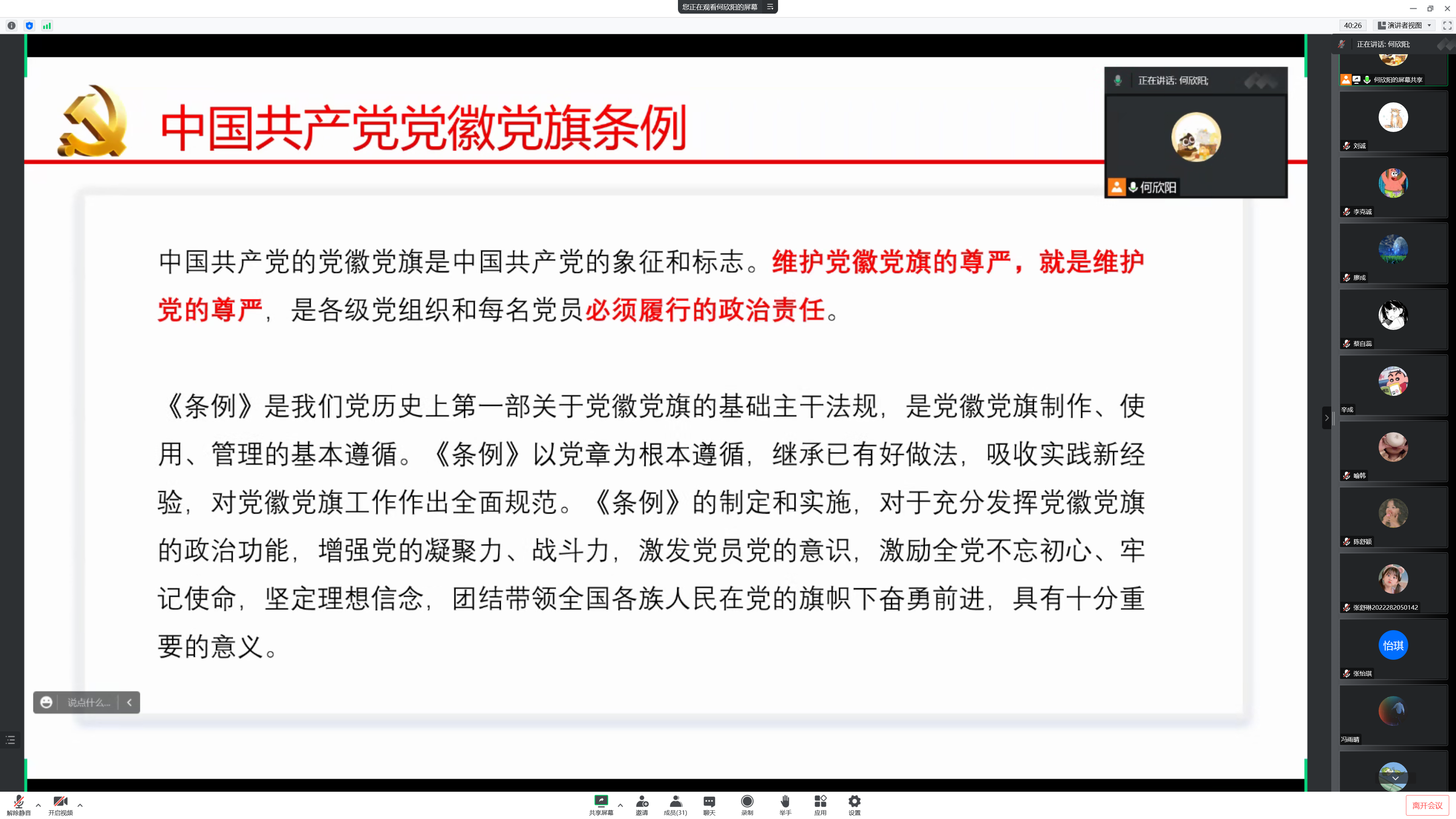 会议第二项,学习《中国共产党党徽党旗条例》。首先由何欣阳同志介绍学习《中国共产党党徽党旗条例》(以下简称《条例》)的重大意义。中国共产党的党徽党旗是中国共产党的象征和标志。维护党徽党旗的尊严,就是维护党的尊严,是各级党组织和每名党员必须履行的政治责任。之后,何欣阳同志着重讲解了《条例》中的几大要点。