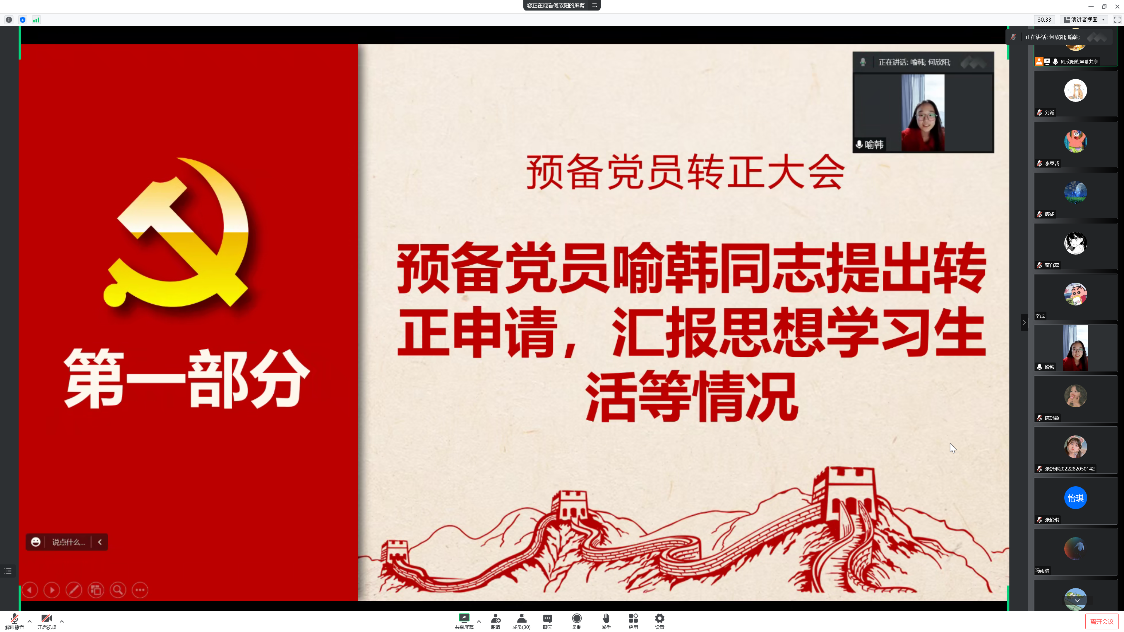 会议第三项,讨论喻韩同志的转正工作。首先由喻韩同志汇报预备期间的思想和工作情况;之后由支部委员会报告喻韩同志预备期间的教育考察情况。与会党员陈舒颖同志对喻韩同志预备期间的各方面表现予以肯定,同意其按期转正。
