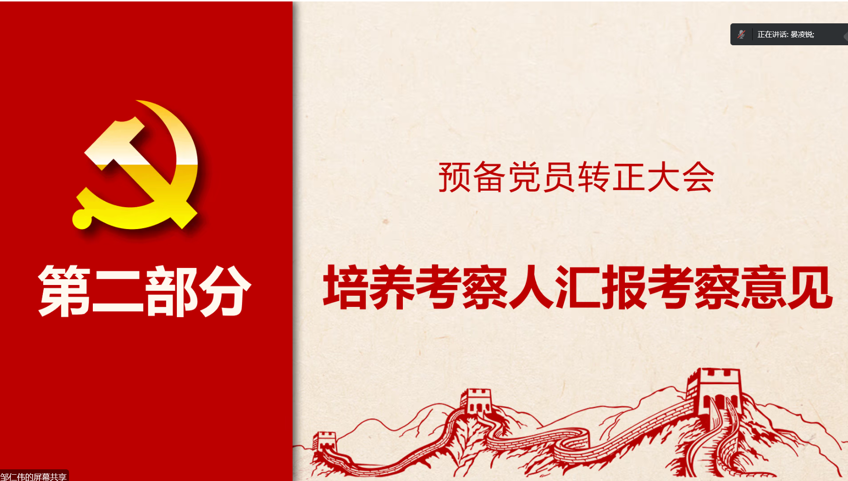会议开始,由支部书记邹仁伟同志对本次会议的基本内容进行了介绍,主要为讨论任毅同志和李国稳同志的预备党员转正申请。首先,任毅同志与李国稳同志向组织汇报了自己在预备期间的工作学习情况,阐述了个人思想认识等方面的进步,表达了自身的转正意愿。