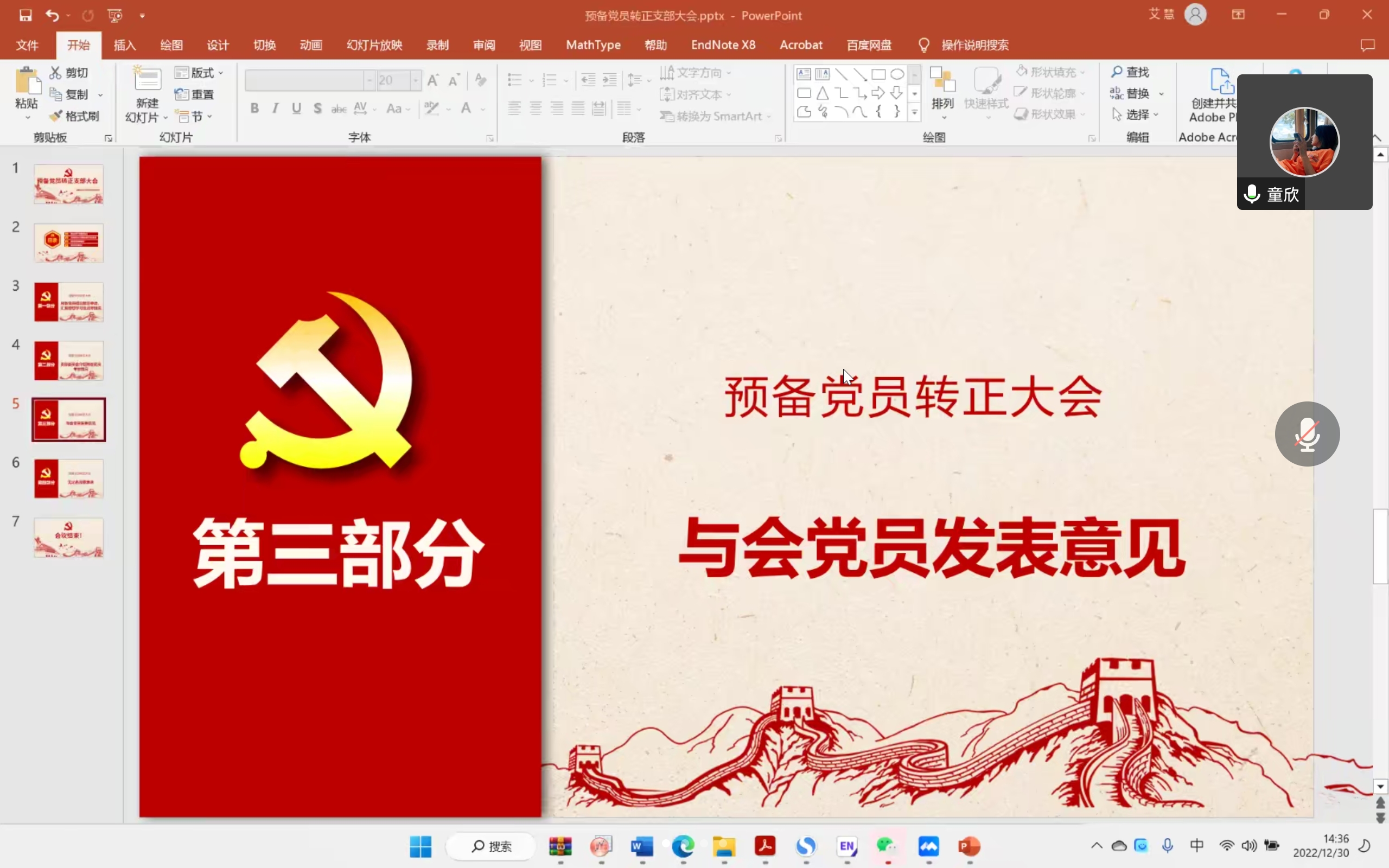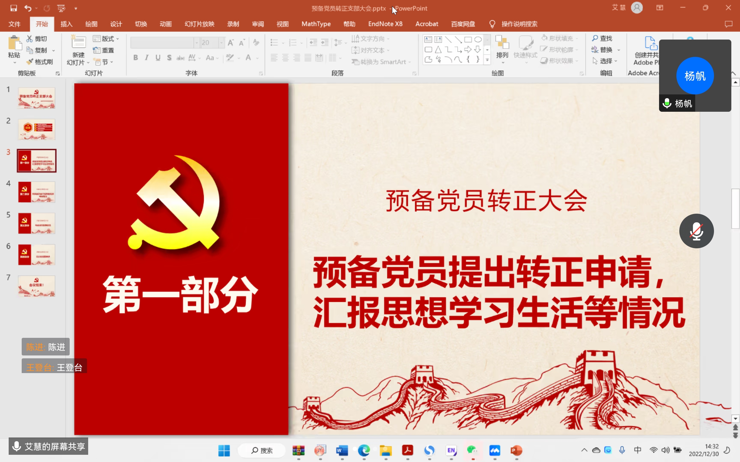 2022年12月30日下午2点3分,环境科学与工程系研究生第四党支部召开预备党员转正大会。由于疫情影响,本次会议于线上召开,由艾慧同志主持,主要内容为讨论预备党员杨帆同志的转正问题。本次会议应到正式党员21人,预备党员7人,实到正式党员13人,预备党员7人,请假8人,有表决权的到会人数超过应到会有表决权人数的半数,符合规定人数,可以开会。