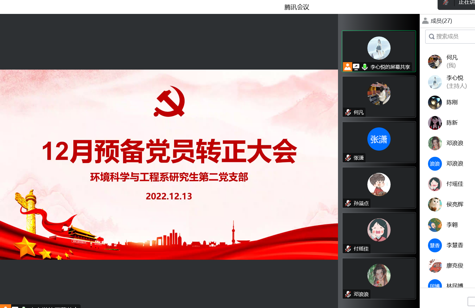2022年12月13日19:30,环境科学与工程系研究生第二党支部召开预备党员转正大会,受疫情影响会议采用线上腾讯会议形式进行。本次会议应到正式党员20名、预备党员6名,因事、因病请假 0 名,实到会正式党员 20 名、预备党员 6 名,有表决权的到会人数超过应到会有表决权人数的半数,符合规定人数。