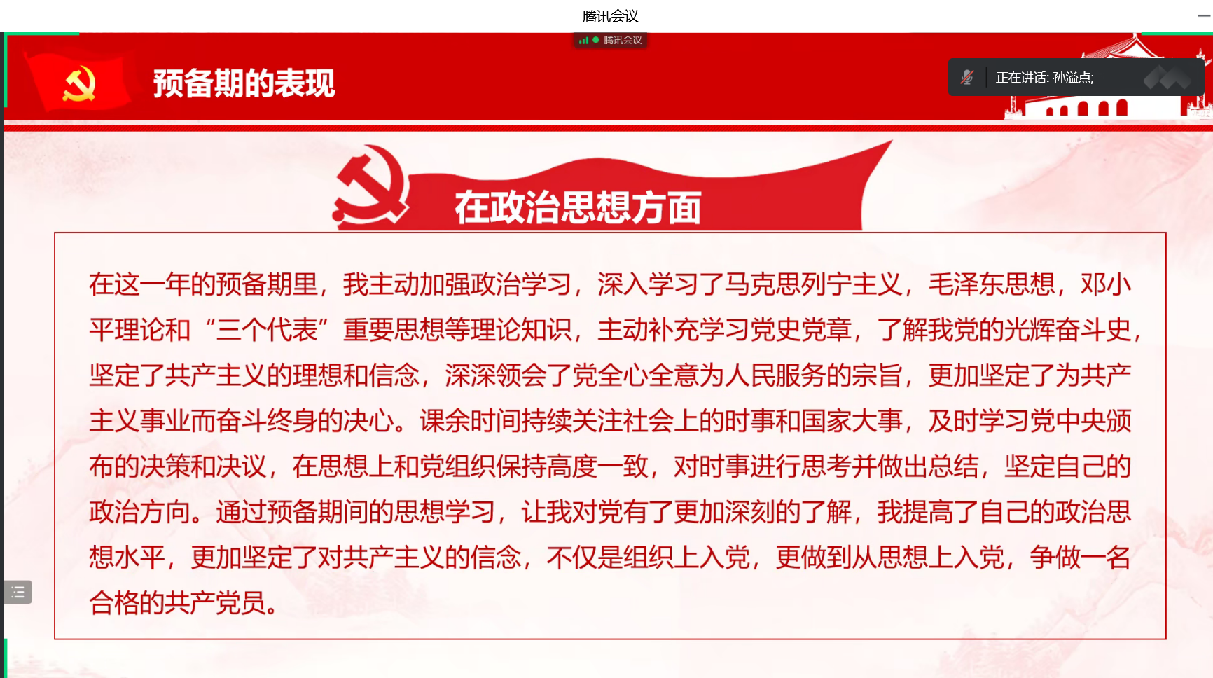 会议第一项,讨论预备党员孙溢点同志的转正问题。首先由孙溢点同志汇报了其预备期间的思想、工作情况,其第一考察人刘馨和第二考察人周奉对其预备期的表现进行评价,党支部书记何凡同志代表支部委员会报告该同志在预备期间的教育考察情况,与会党员对孙溢点同志在预备期间的各方面情况予以肯定。 经支部委员会研究和全体党员审议,确定陈新、闫慧敏同志为监票人和计票人。经过无记名投票,表决结果为:孙溢点同志得赞成票20张,不赞成票0张,弃权票0张,对孙溢点同志的赞成人数超过应到会有表决权的正式党员的半数,同意其按期转为中共正式党员。