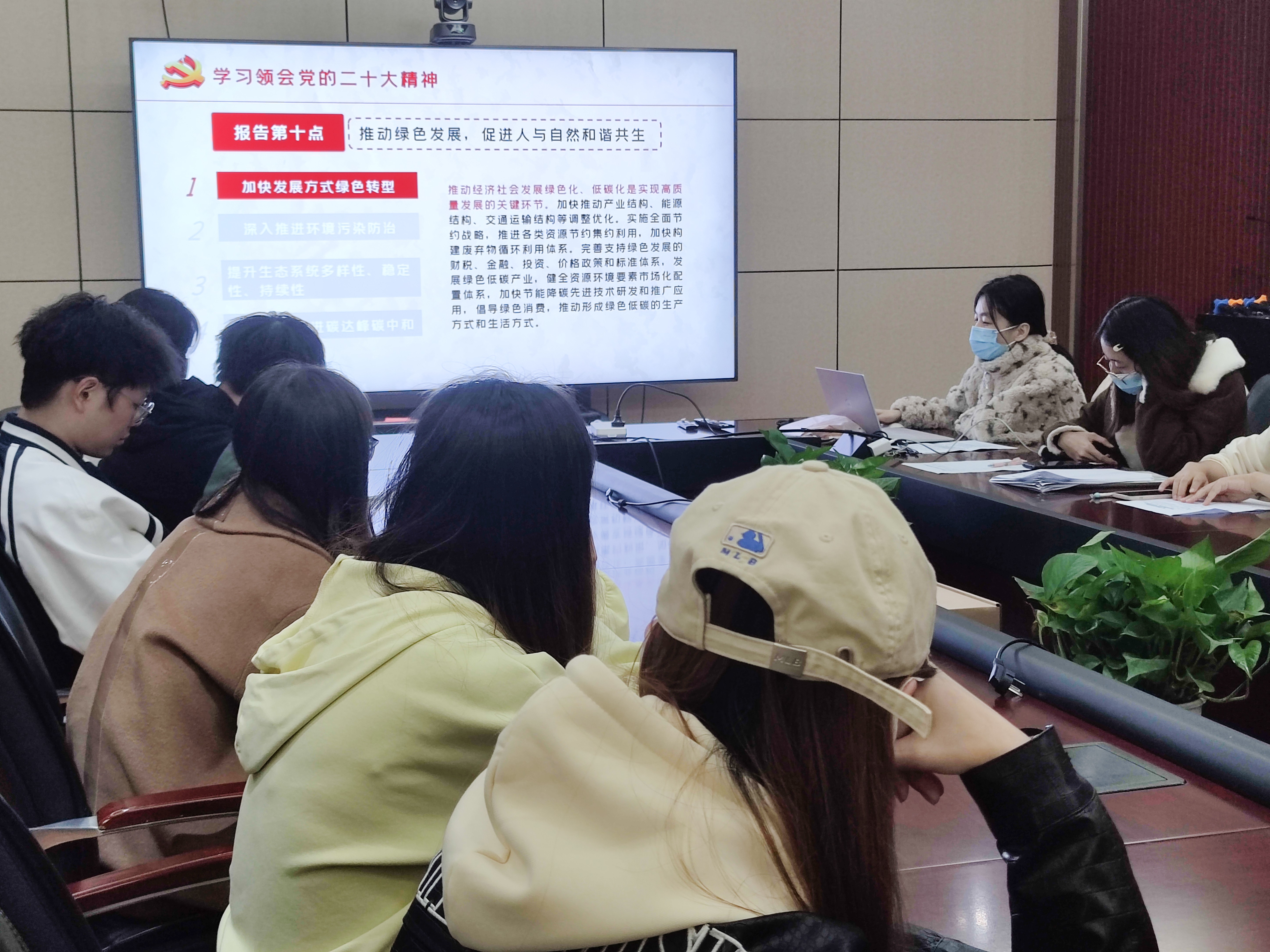 会议第一项,党的二十大精神学习。闫慧敏同志以“生态环境”为关键词带领同志们学习了二十大报告部分原文。二十大报告指出中国式现代化是人与自然和谐共生的现代化,人与自然是生命共同体,要像保护眼睛一样保护自然和生态环境。报告第十点更明确要求要推动绿色发展,促进人与自然和谐共生。闫慧敏同志发出倡议:作为环境专业的研究生,应当发挥自身所学,在环境领域中不断探索、深入研究,为加快发展方式绿色转型、推进环境污染防治,贡献自己的一份力量。