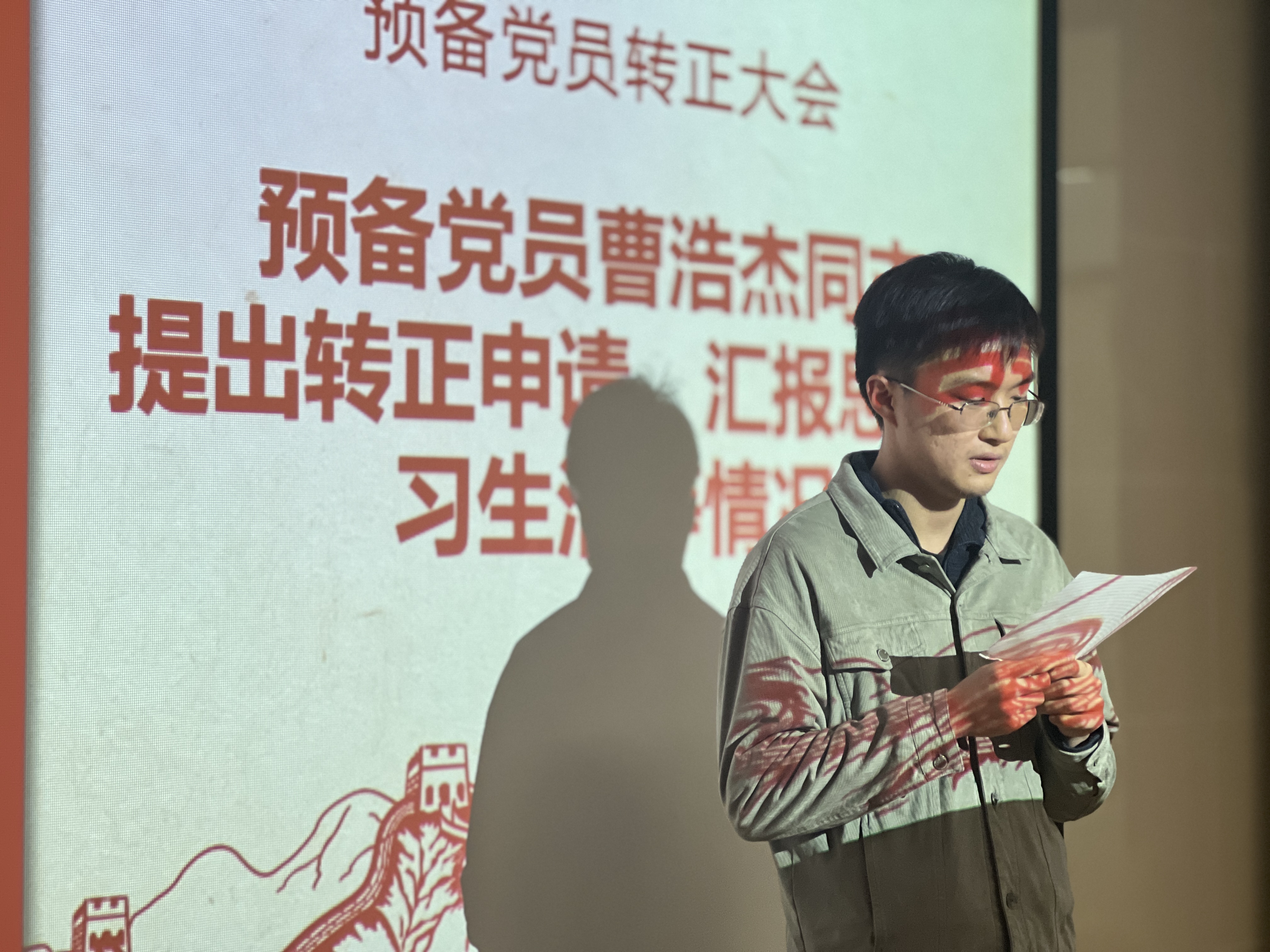 会议第项,讨论曹浩杰同志的转正工作。首先由曹浩杰同志汇报预备期间的思想和工作情况;之后由支部委员会报告曹浩杰同志预备期间的教育考察情况。经过有表决权的正式党员进行无记名投票,本次大会表决结果为:曹浩杰同志得赞成票23张,不赞成票0张,弃权票0张,同意按期转正为中共正式党员。最后,曹浩杰同志进行表态,向党组织表明了自己的决心和信心。