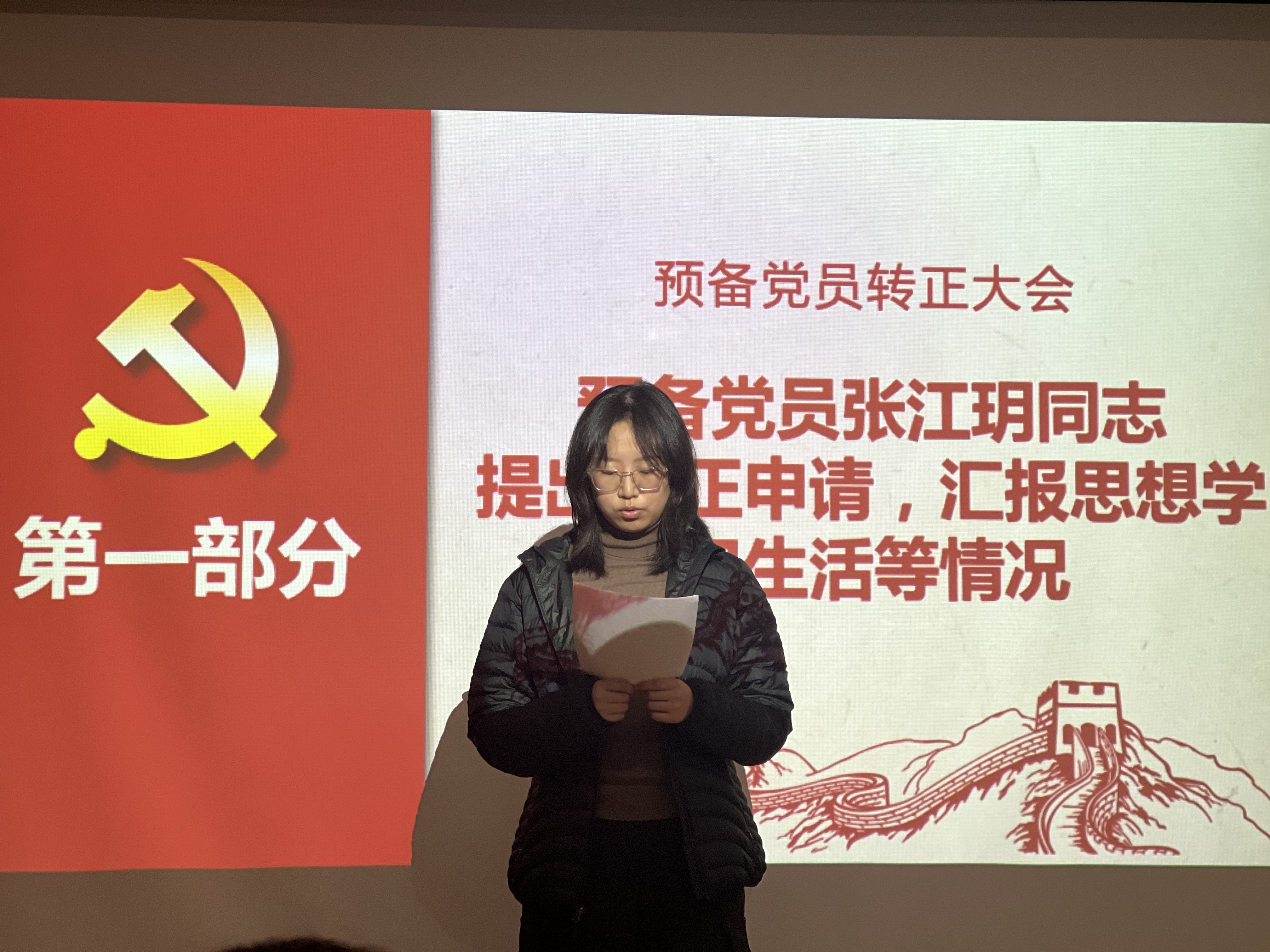 会议第项,讨论张江玥同志的转正工作。首先由张江玥同志汇报预备期间的思想和工作情况;之后由支部委员会报告张江玥同志预备期间的教育考察情况。经过有表决权的正式党员进行无记名投票,本次大会表决结果为:张江玥同志得赞成票23张,不赞成票0张,弃权票0张,同意按期转正为中共正式党员。最后,张江玥同志进行表态,向党组织表明了自己的决心和信心。