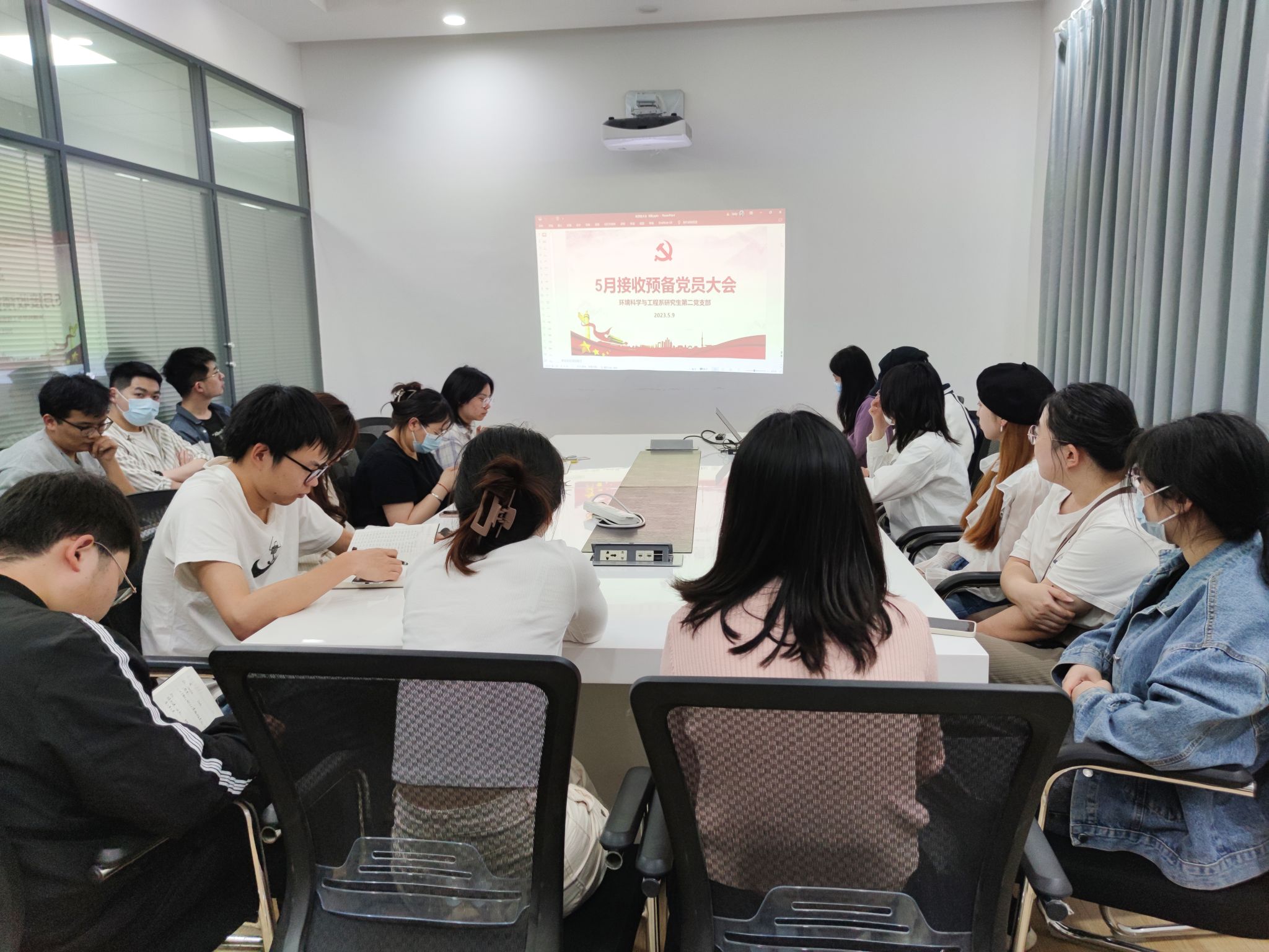 2023年5月9日19:30,环境科学与工程系研究生第二党支部在电脑城430开展主题党会暨接收预备党员支部大会。会议应到正式党员24名,因事、因病请假2名,实到正式党员22名,有表决权的到会人数超过应到会有表决权人数的半数,符合规定人数。