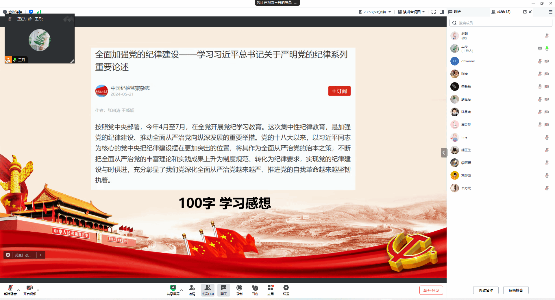 2024年6月17日16:00,地理科学与国土资源系研究生第四党支部在线上组织学习了“强化纪律意识,筑牢思想防线”党纪专题党课。本次专题党课由支部书记王丹主讲。