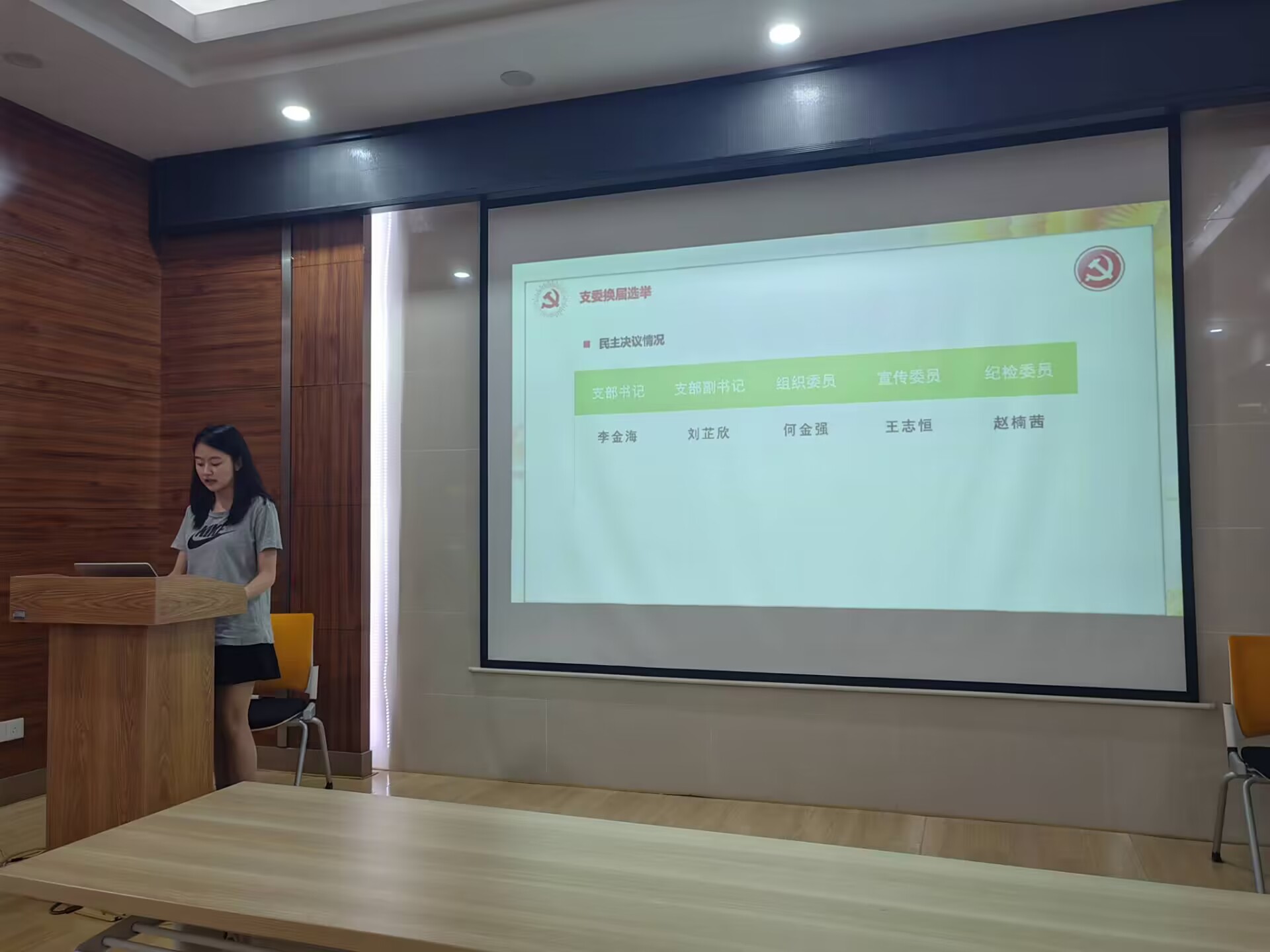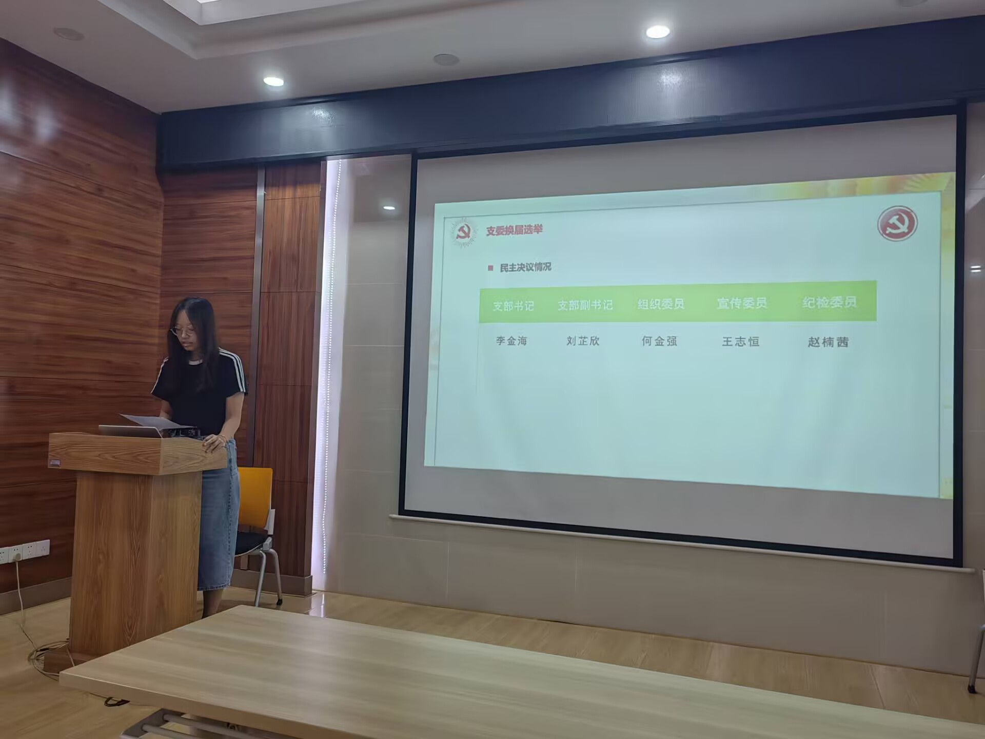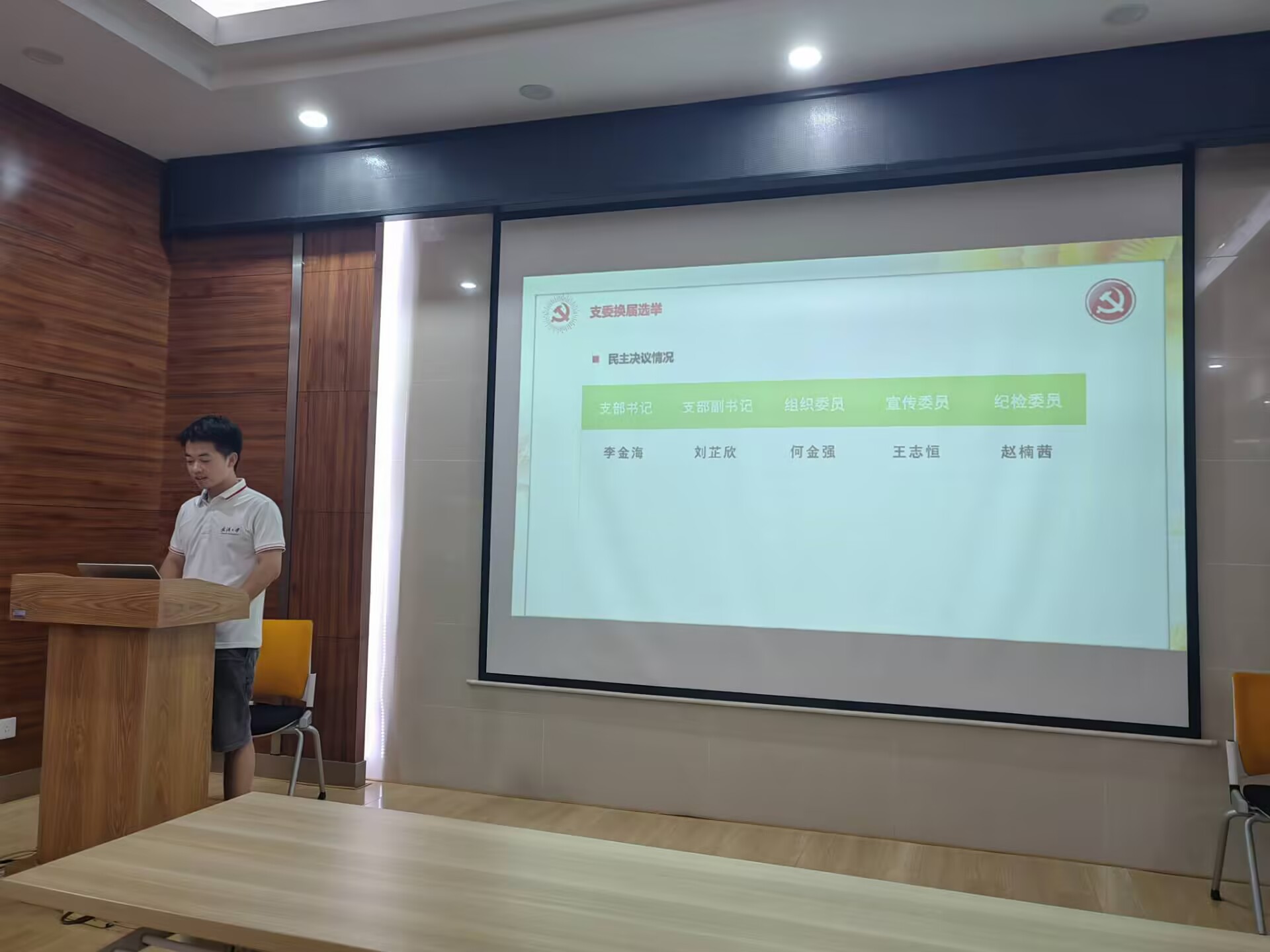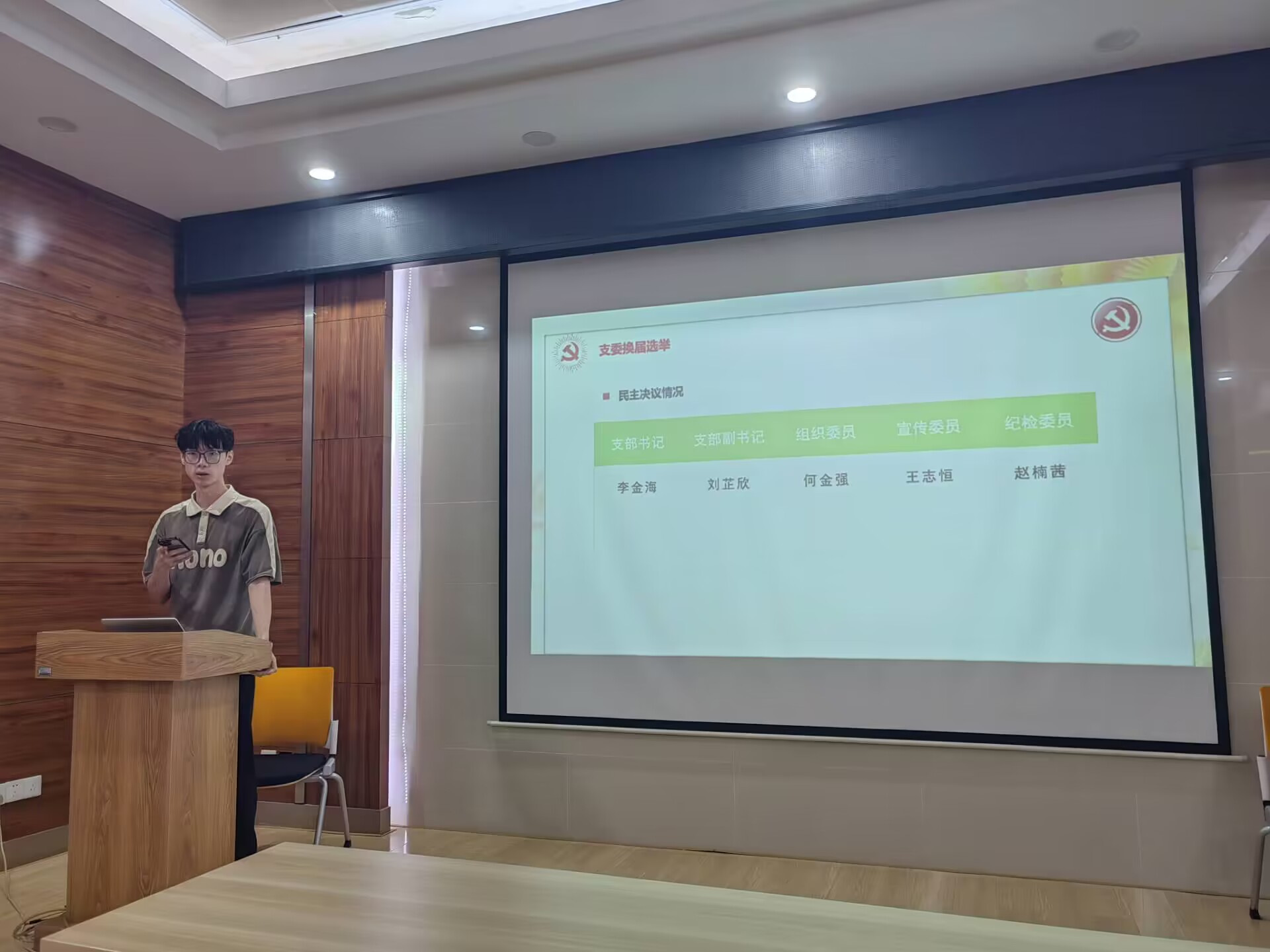 会议第二项,支部委员换届。李金海、刘芷欣、何金强、王志恒、赵楠茜五位支委候选人分别介绍了个人情况、能力优势并阐述了未来的工作规划。由正式党员进行无记名投票并现场公布投票结果,经表决,五位同志得到了党支部成员的一致认可。依据投票结果,由李金海同志担任新任党支部书记、刘芷欣同志担任新任党支部副书记、何金强同志担任党支部组织委员、王志恒同志担任党支部宣传委员、赵楠茜同志担任党支部纪检委员。