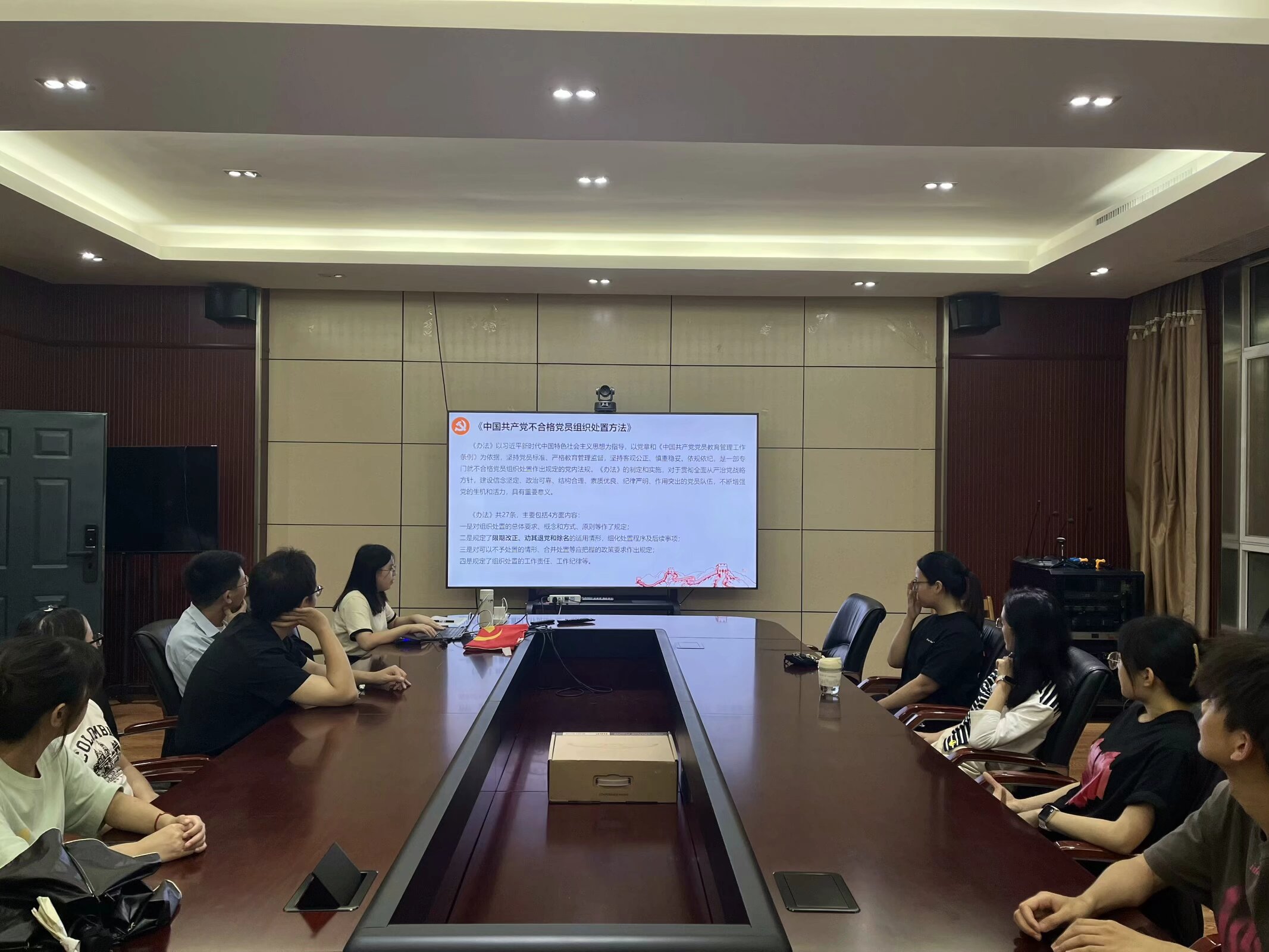 会议第二项,党纪学习教育会,由支部书记胡艺川同志领学。党支部书记胡艺川同志介绍了《中国共产党不合格党员组织处置方法》,该《办法》以习近平新时代中国特色社会主义思想为指导,以党章和《中国共产党党员教育管理工作条例》为依据,坚持党员标准、严格教育管理监督,坚持客观公正、慎重稳妥、依规依纪,是一部专门就不合格党员组织处置作出规定的党内法规。通过本次学习,与会的各位支部同志深入了解各种处置办法的适用情形以及组织处置的工作责任、工作纪律等内容,支部和支部党员将准确领会《办法》精神,全面掌握《办法》内容,严格执行《办法》规定,进一步保证党的先进性和纯洁性。