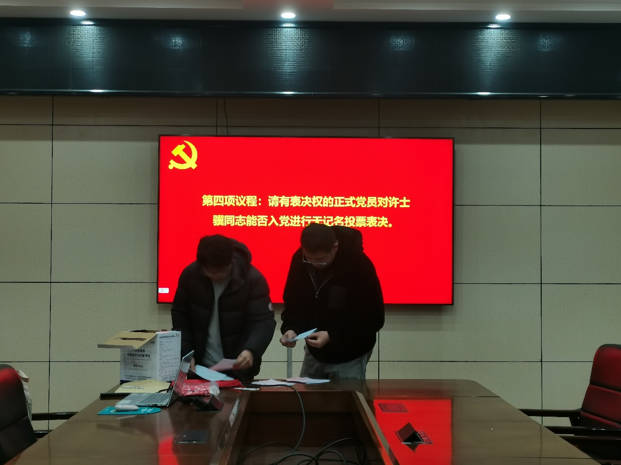 会议第四项,由逄芳钊同志和曲鑫同志担任监票人、计票人向到场的各位正式党员发放表决票,采用无记名方式投票表决。经核查,同意25票(包括会前5张书面意见表决票),反对0票,弃权0票。党支部书记许思敏同志宣读大会决议,同意许士骥同志按期转为中共正式党员,并让许士骥同志进行表态。