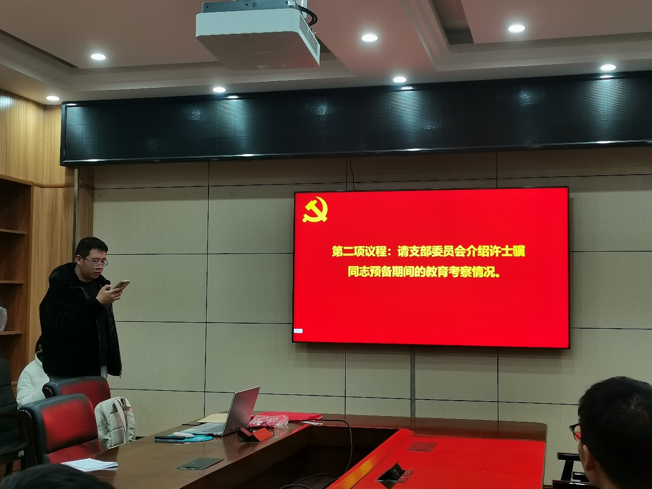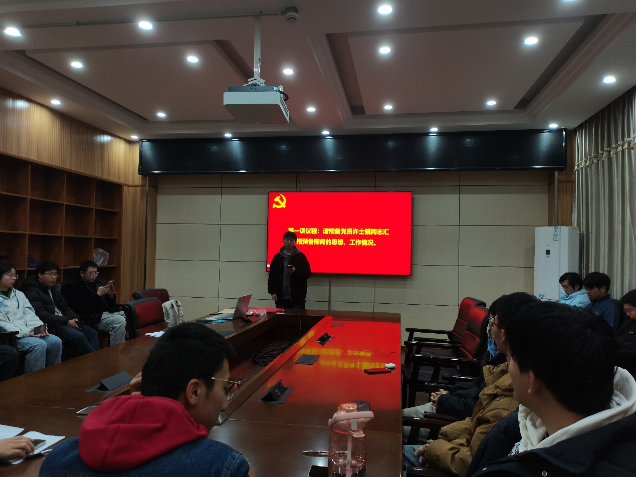 会议第一项,预备党员许士骥同志汇报预备期间的思想、工作情况。许士骥同志表示,在预备期间,认真学习党的理论知识,积极向党组织靠拢;自入学以来,专心科研,认真学习。同时表示会始终用党员标准要求自己,发挥党员先锋模范作用,未来进一步向党组织靠拢。