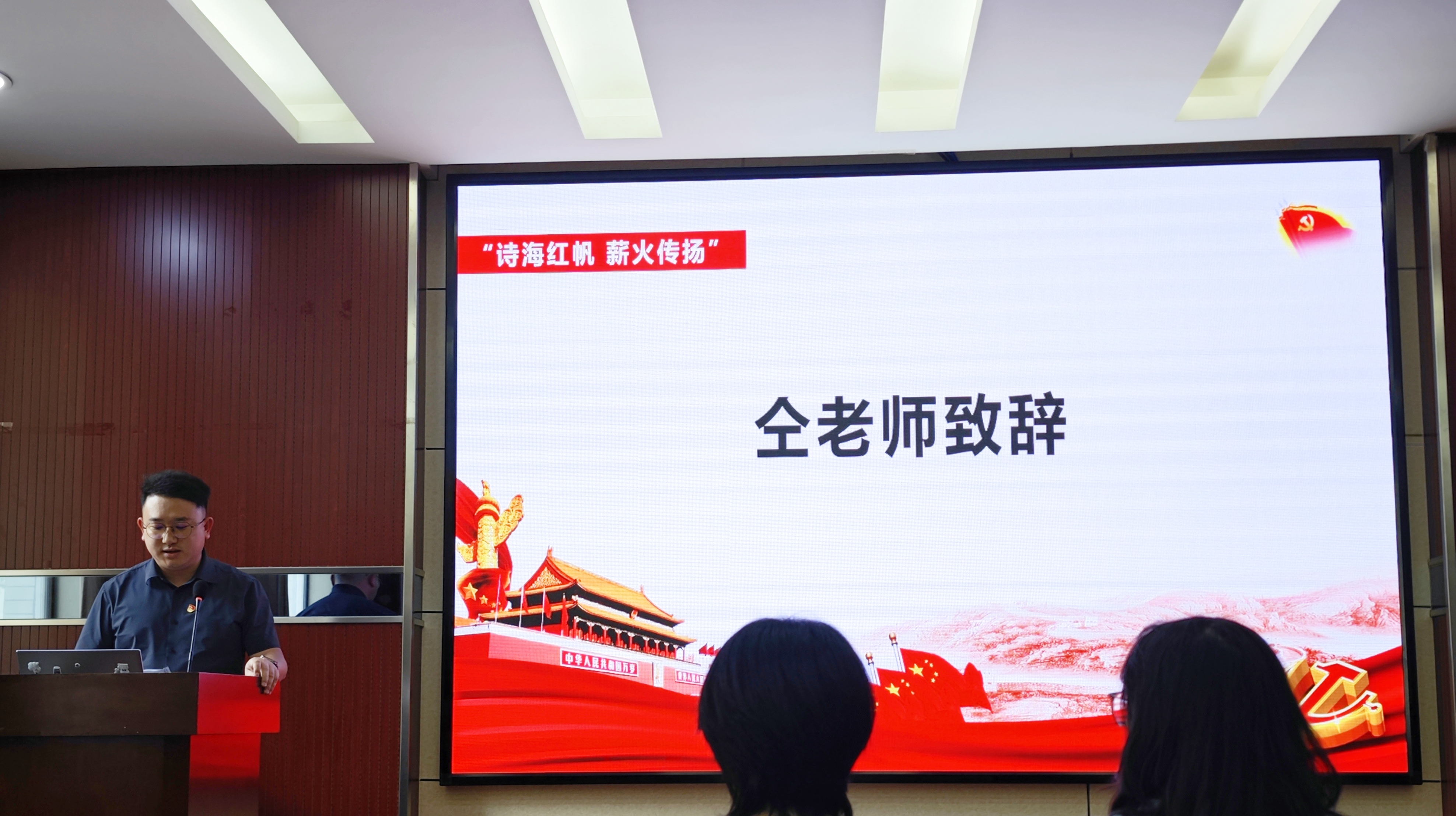 活动伊始,仝老师上台致辞。他结合地理学科专业特色,引经据典点明红色诗歌与地理知识的联系,深入阐述了"以地理视角看党建"的新思路,强调要将学科专业优势与支部党建工作有机融合,为党建工作注入新活力,并期望大家通过活动深化专业认知,感悟红色精神。