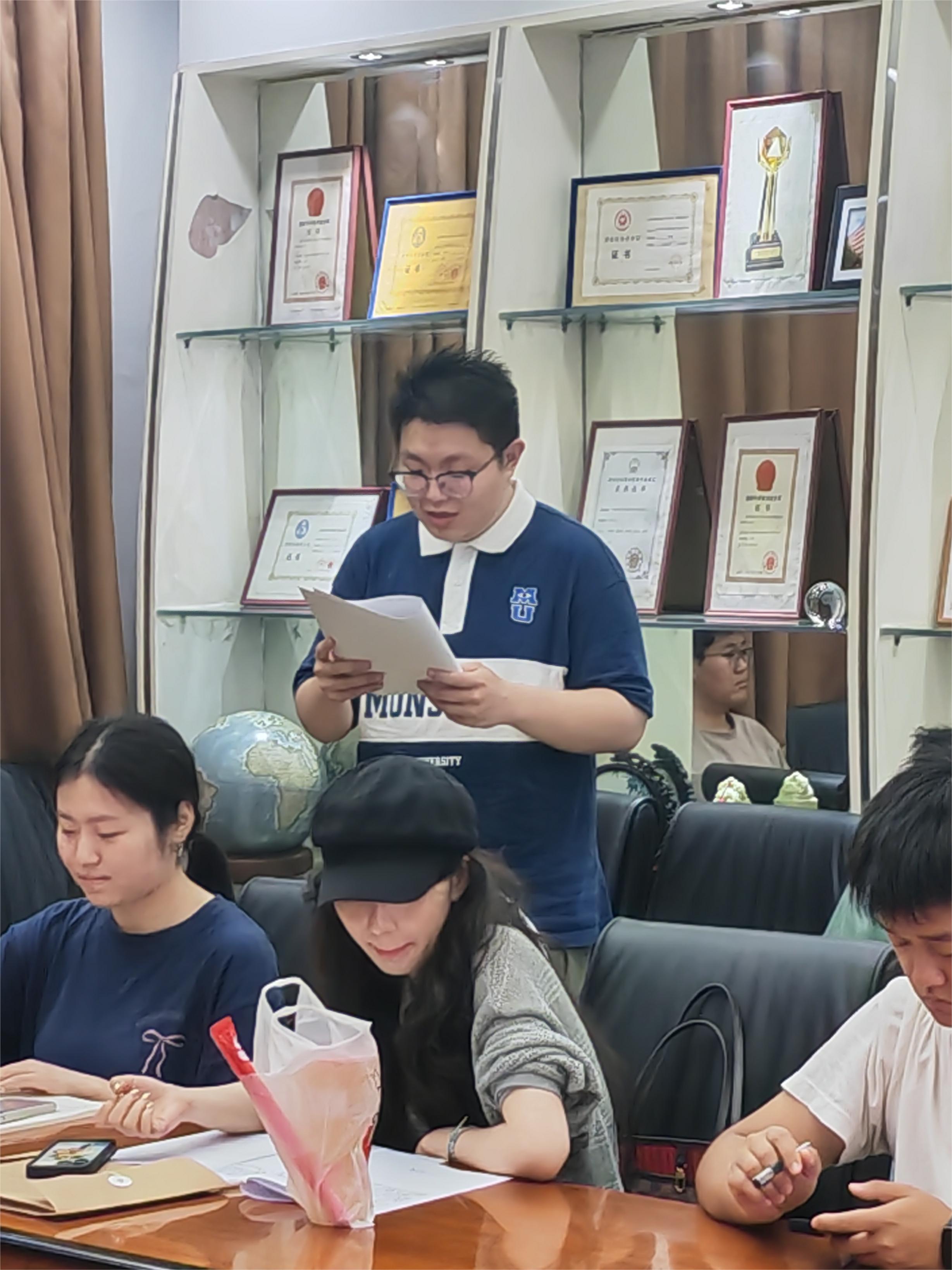 会议第一项,预备党员转正大会。首先由预备党员乔岩同志汇报预备期间的思想、工作情况。培养联系人杨瑞同志对乔岩同志预备期间在理论学习方面取得的进步给予了肯定,并表示同意其按期转正。党支部副书记吴云松同志汇报了乔岩同志预备期间的教育考察情况和支委会对乔岩同志能否转正的意见。与会党员对预备党员乔岩同志能否转正进行充分讨论并发表意见,一致认为乔岩同志在预备期表现优异,同意其按期转正。