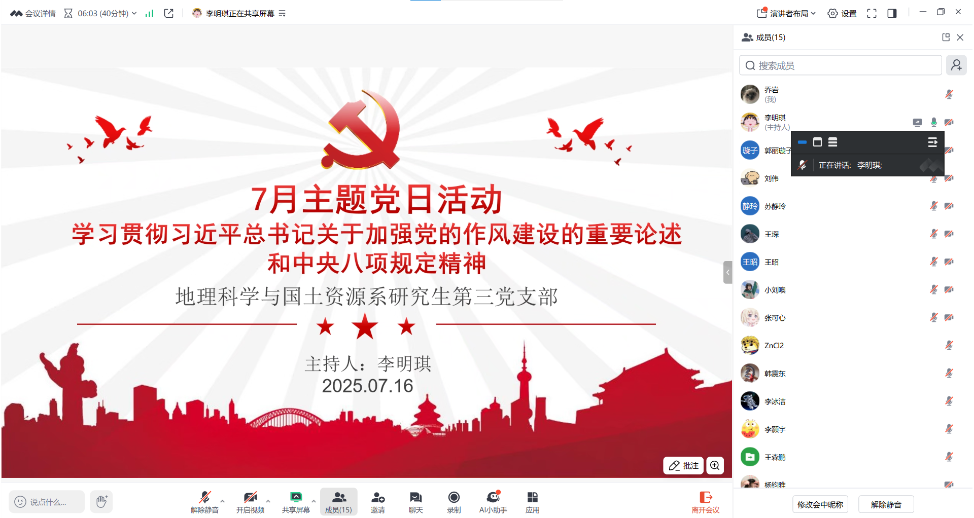 2025年7月16日19:00,地理科学与国土资源系研究生第三党支部于线上召开七月主题党日活动。本次会议由支部书记李明琪同志主持。依据2025年7月3日举办的澳门美高梅