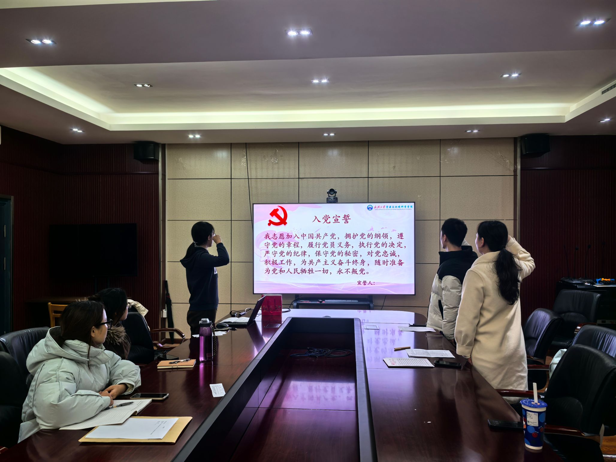 会议第三项,举行宣誓仪式。全体起立,奏唱《国际歌》。在李佳柯同志领誓下,新党员李冰玉、明皓同志面向党旗庄严宣誓,与会党员一同重温入党誓词,以铮铮誓言表达为共产主义事业奋斗终身的决心。